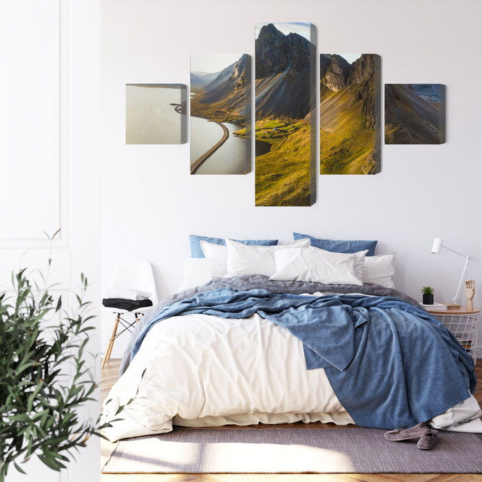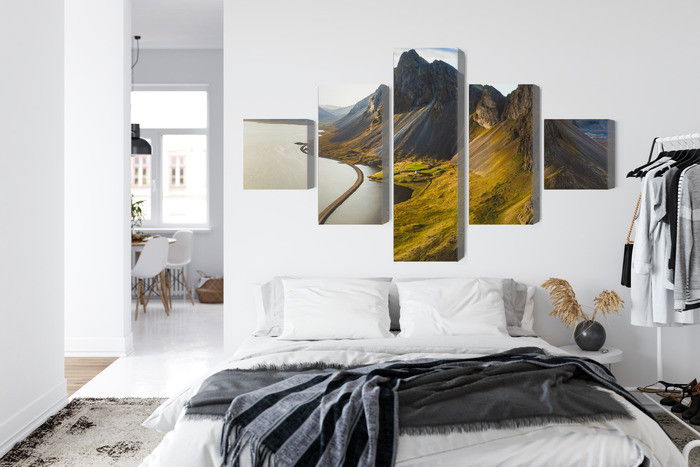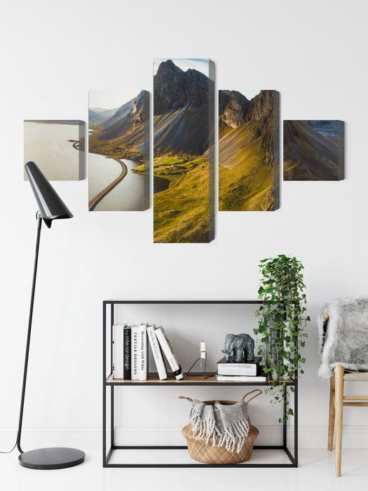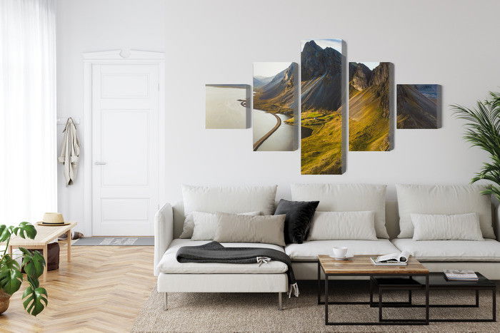 Varje tavla monteras på en massiv fururam. Format upp till 70×50 cm har en ram på 15 mm, medan format från 90×60 cm och uppåt har en ram på 20 mm. Den exakta dukspänningen gör att tavlan håller sin form över tid. Motivet 3d aerial view of icelandic trycks runt hela ramen vilket ger ett stilrent galleriuttryck där tavlan är lika vacker från sidan som framifrån. Kombinationen av rak dukspänning, rena linjer och korrekt tryck ger en professionell finish.