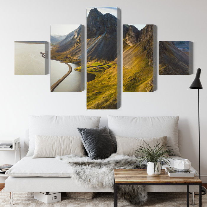 SilentDirects ljuddämpande tavla 3d aerial view of icelandic kombinerar ett högupplöst motiv med avancerad akustikteknik. Varje tavla monteras i Sverige och bygger på en stabil canvastavla med fururam, där insidan av ramen fylls med en ljudabsorberande kärna av återvunnen polyester. Konstruktionen gör tavlan till ett både estetiskt och funktionellt inslag i rummet.