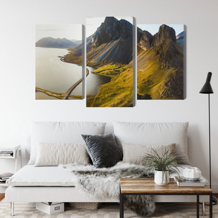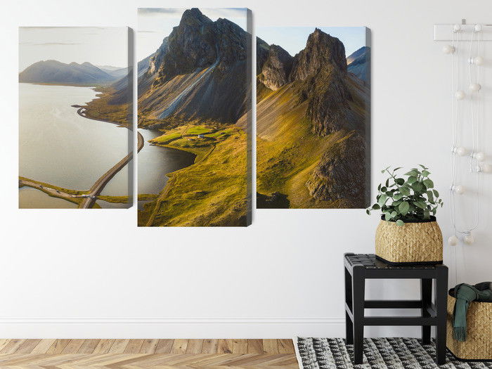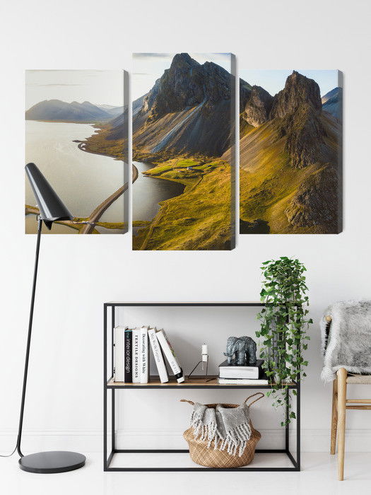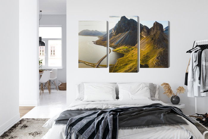 Varje tavla monteras på en massiv fururam. Format upp till 70×50 cm har en ram på 15 mm, medan format från 90×60 cm och uppåt har en ram på 20 mm. Den exakta dukspänningen gör att tavlan håller sin form över tid. Motivet 3d aerial view of icelandic trycks runt hela ramen vilket ger ett stilrent galleriuttryck där tavlan är lika vacker från sidan som framifrån. Kombinationen av rak dukspänning, rena linjer och korrekt tryck ger en professionell finish.