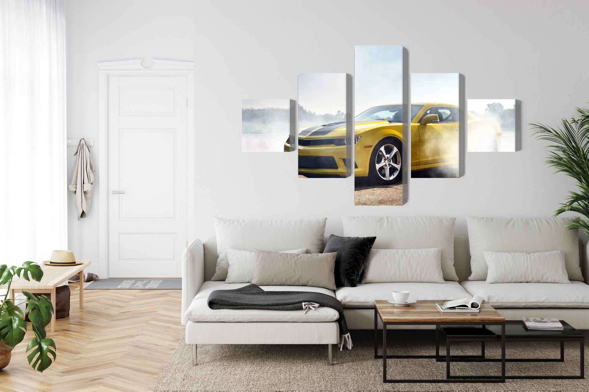 Motivet 3d drifting yellow car återges med hög färgprecision och detaljrikedom tack vare HP Latex-teknologi. Trycket sker med vattenbaserade, luktfria och GREENGUARD Gold-certifierade bläck som ger en upplösning på upp till 300 DPI. Färgerna är UV-beständiga och behåller sin styrka även i ljusa rum, vilket gör tavlan lämplig för både hem- och offentliga miljöer.