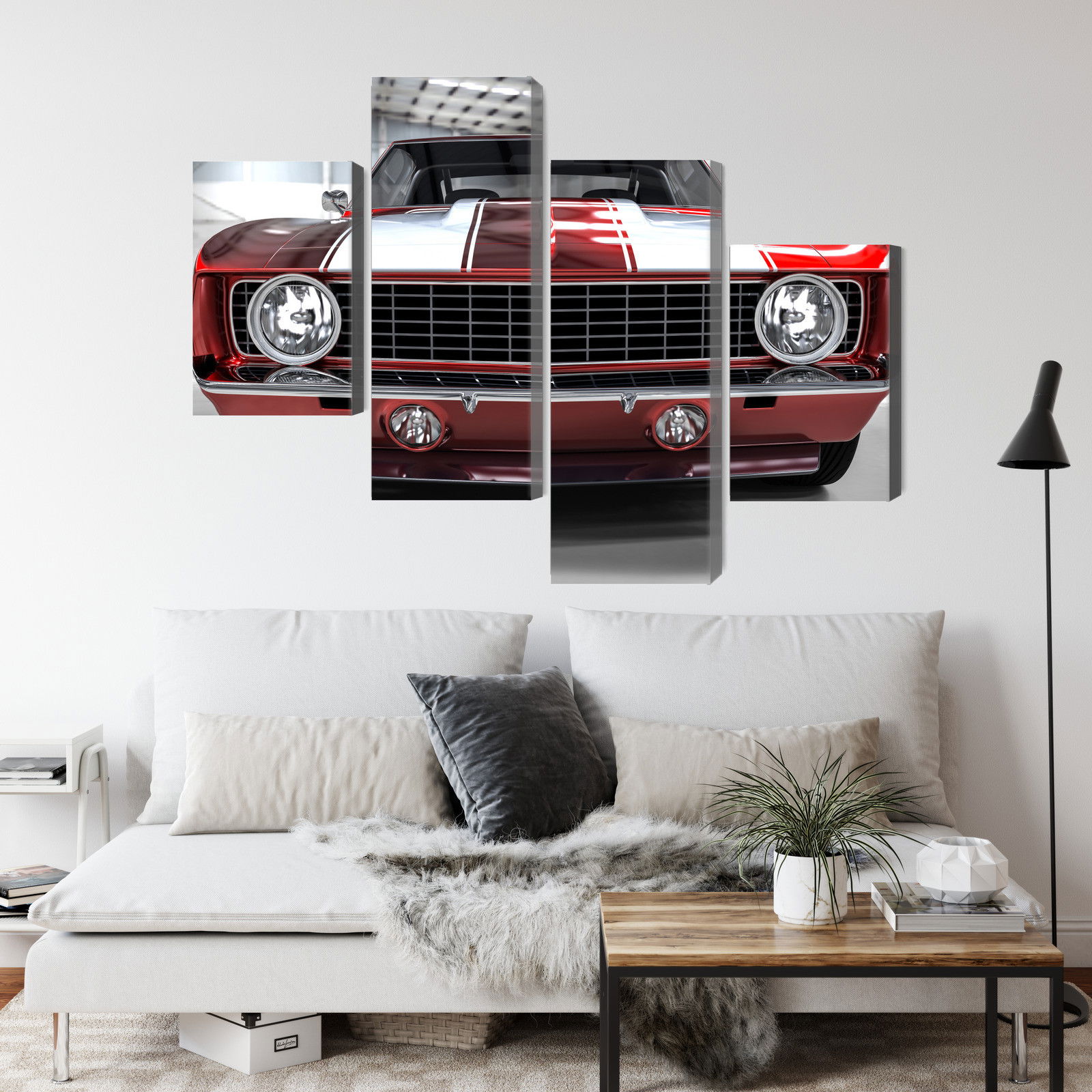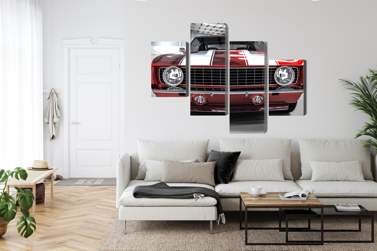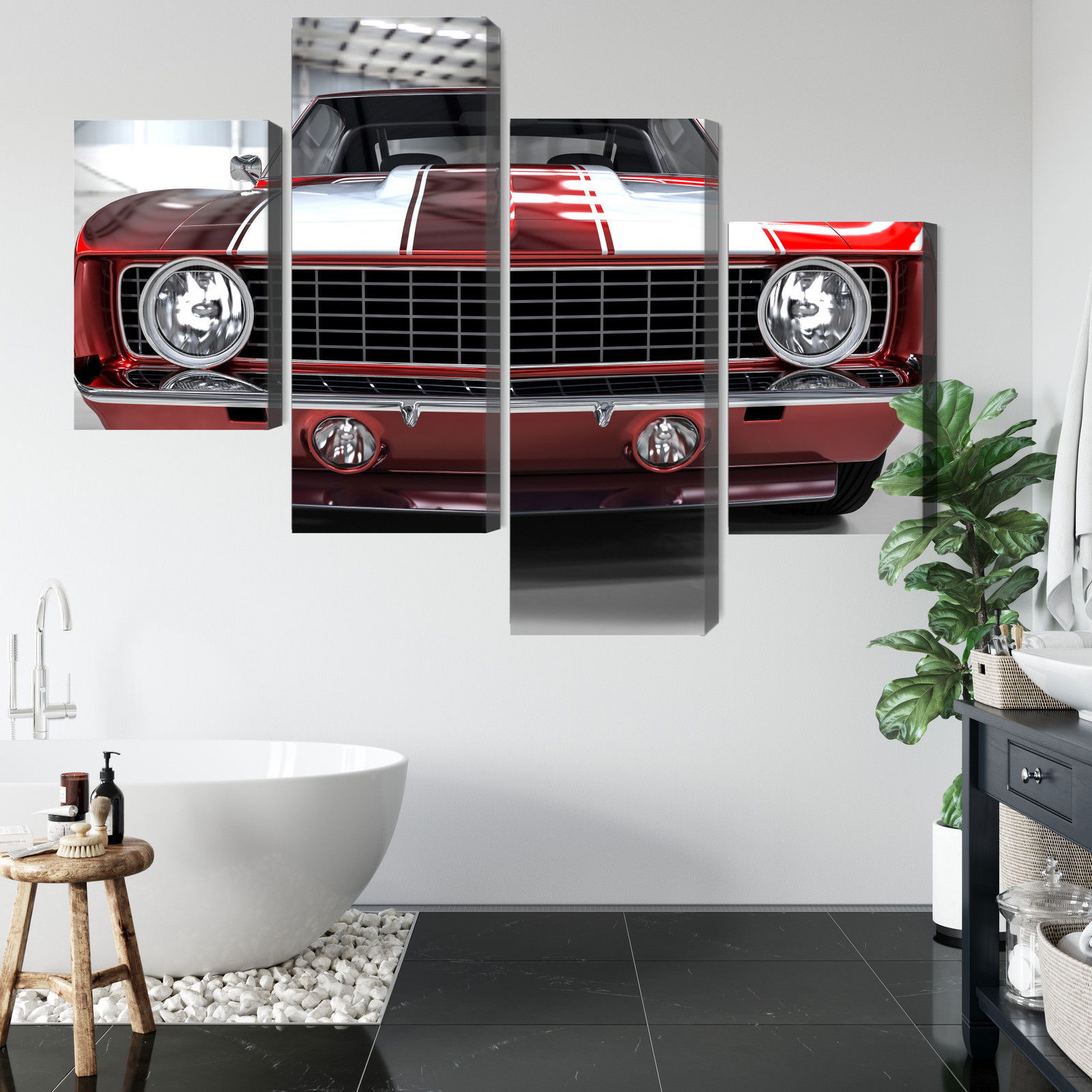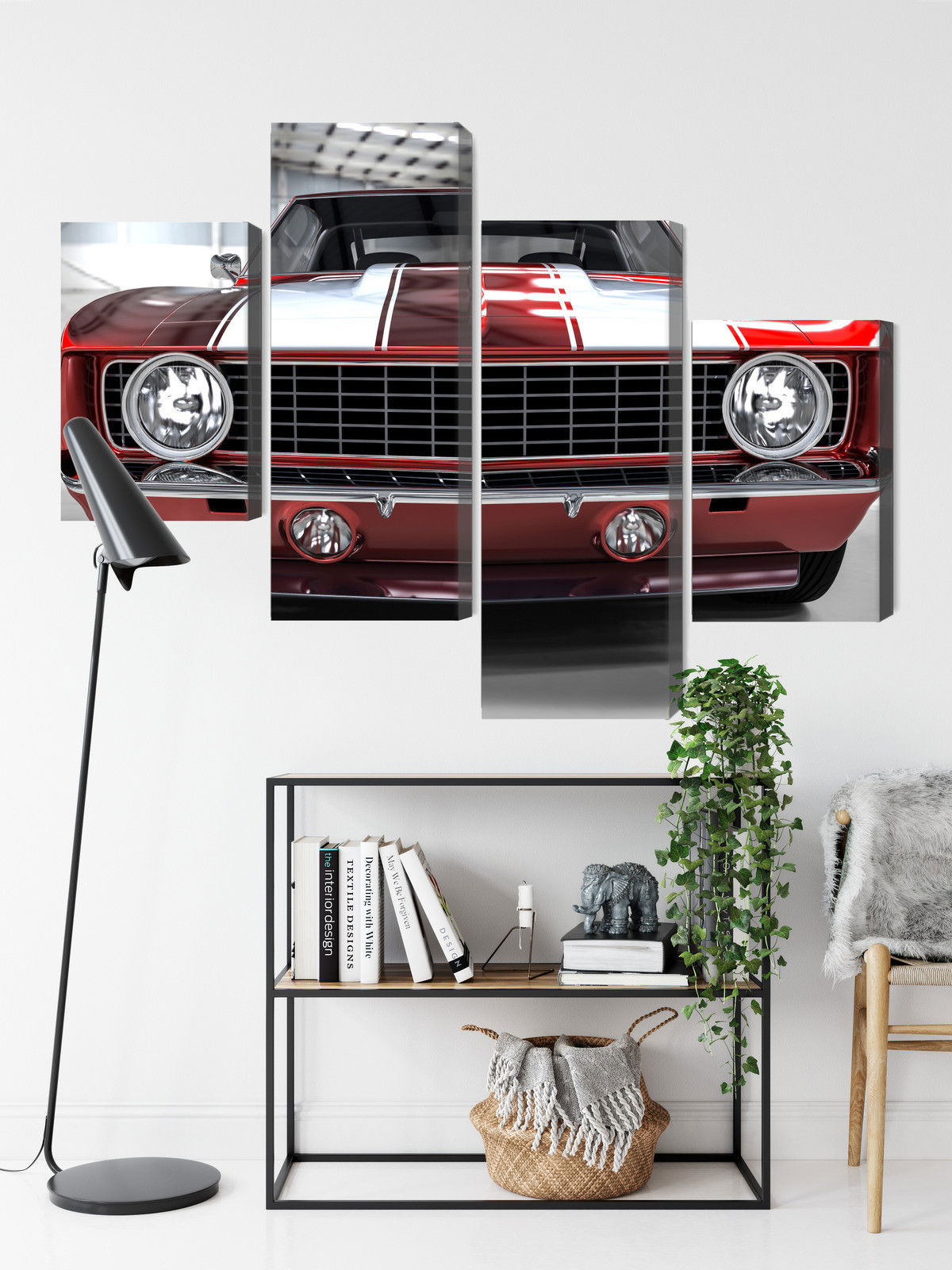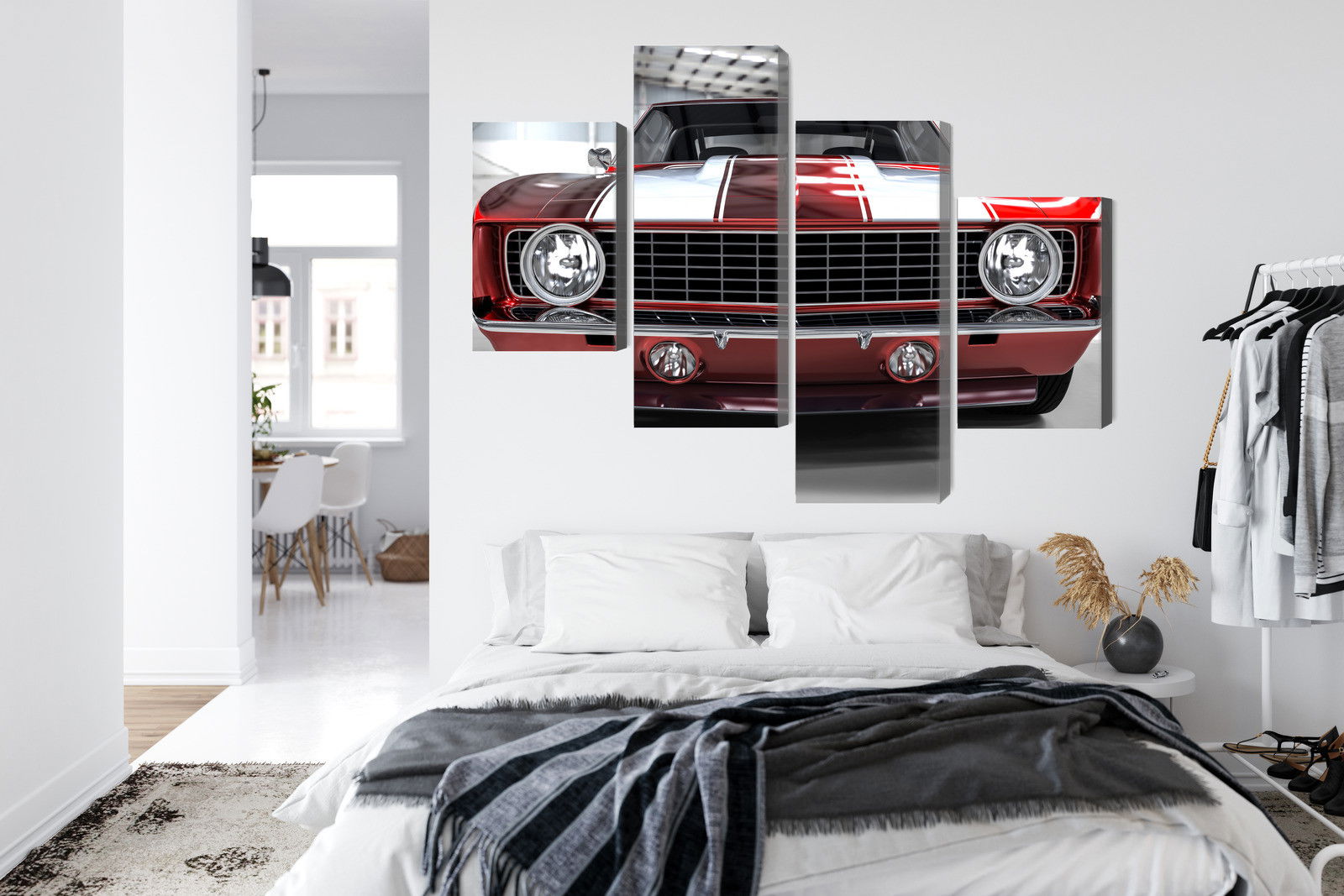 Ljuddämpande tavla – A red muscle car in a garage för lugnare rum och mjukare akustik