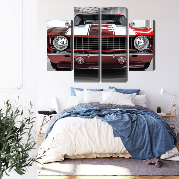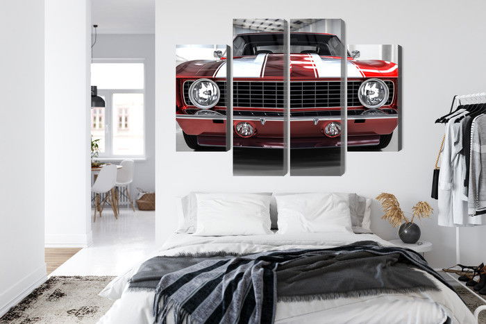 Varje tavla monteras på en massiv fururam. Format upp till 70×50 cm har en ram på 15 mm, medan format från 90×60 cm och uppåt har en ram på 20 mm. Den exakta dukspänningen gör att tavlan håller sin form över tid. Motivet A red muscle car in a garage trycks runt hela ramen vilket ger ett stilrent galleriuttryck där tavlan är lika vacker från sidan som framifrån. Kombinationen av rak dukspänning, rena linjer och korrekt tryck ger en professionell finish.