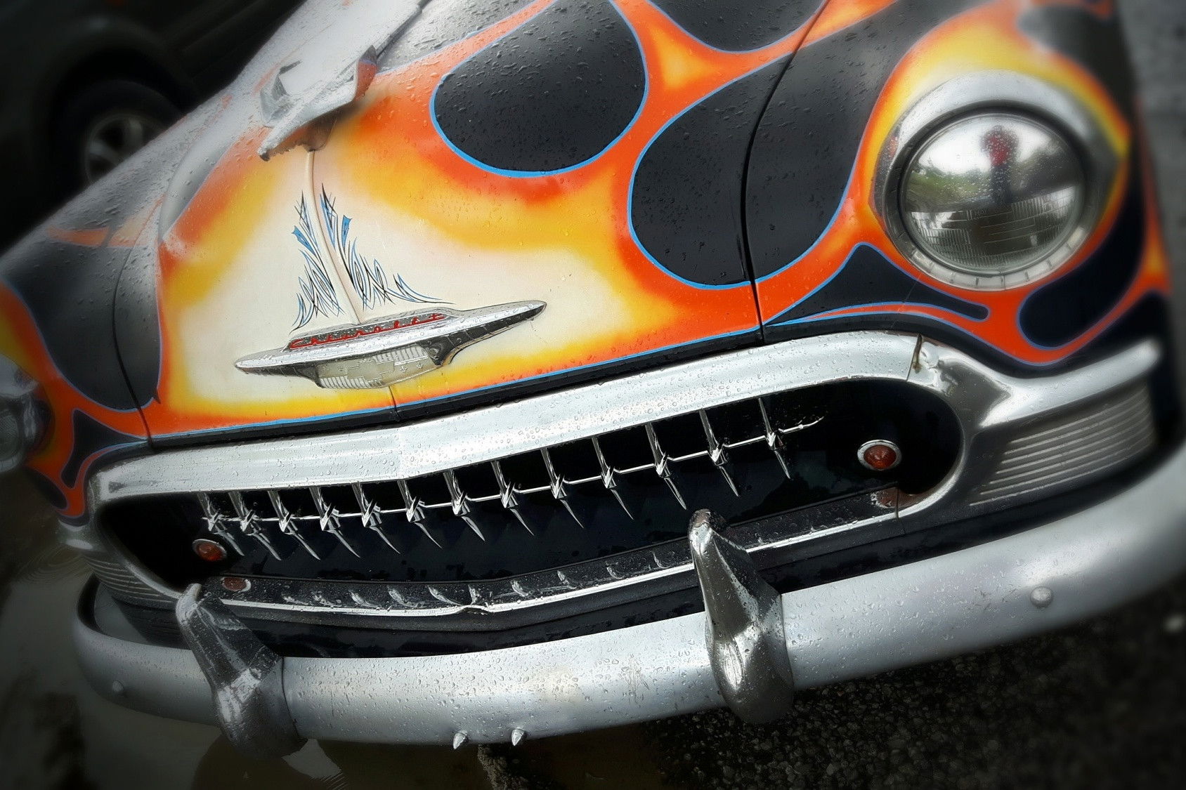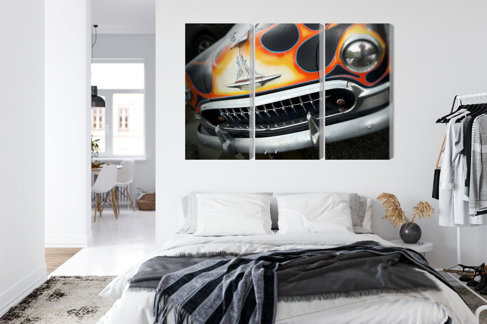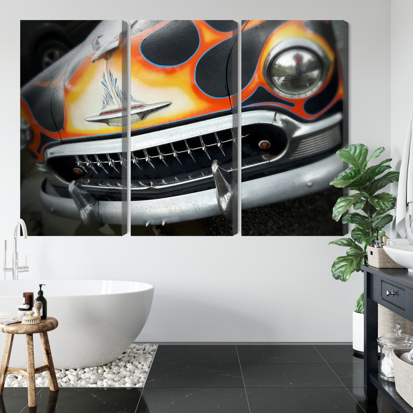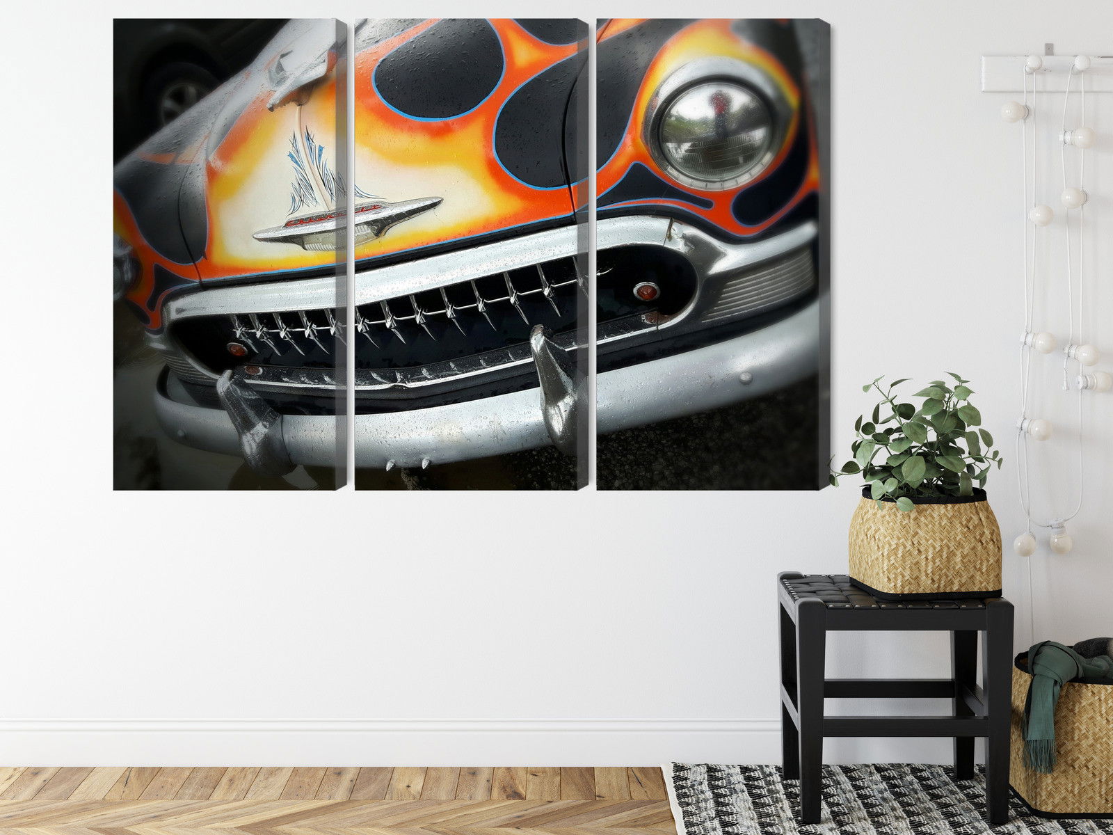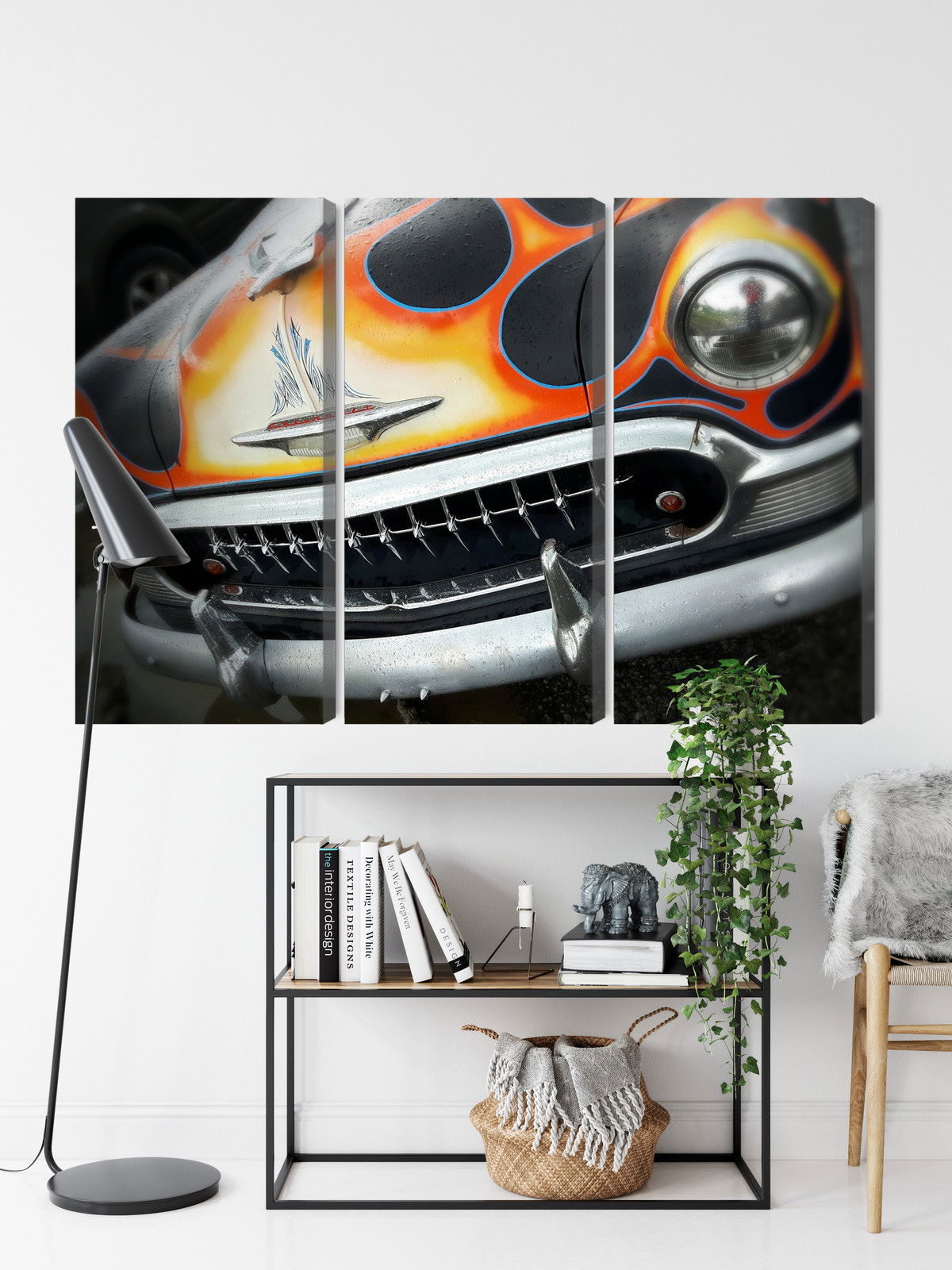 Ljuddämpande tavla – Antique car with flames för lugnare rum och mjukare akustik