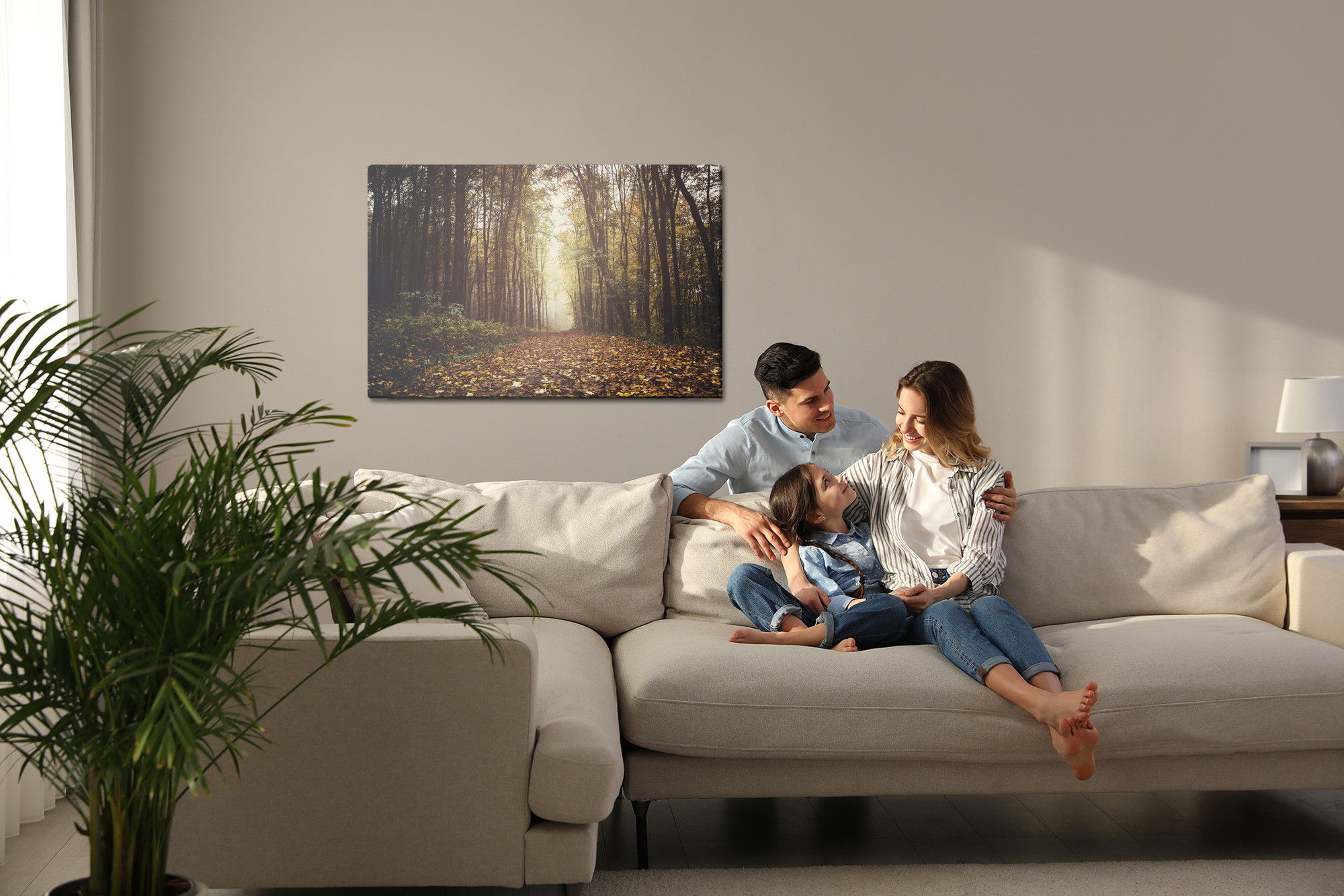 Motivet Autumn forest återges med hög färgprecision och detaljrikedom tack vare HP Latex-teknologi. Trycket sker med vattenbaserade, luktfria och GREENGUARD Gold-certifierade bläck som ger en upplösning på upp till 300 DPI. Färgerna är UV-beständiga och behåller sin styrka även i ljusa rum, vilket gör tavlan lämplig för både hem- och offentliga miljöer.