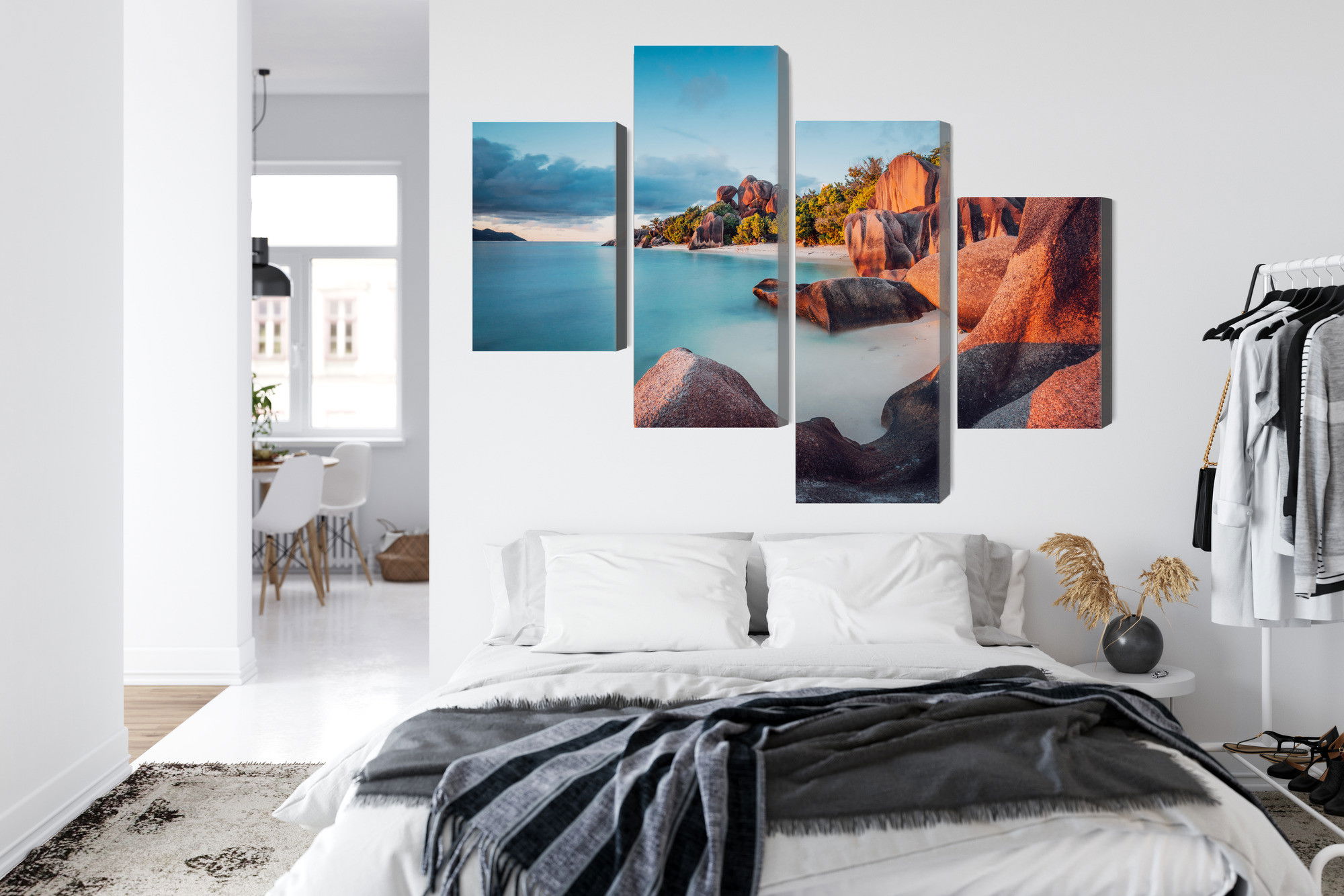 Varje tavla monteras på en massiv fururam. Format upp till 70×50 cm har en ram på 15 mm, medan format från 90×60 cm och uppåt har en ram på 20 mm. Den exakta dukspänningen gör att tavlan håller sin form över tid. Motivet Beach in seychelles trycks runt hela ramen vilket ger ett stilrent galleriuttryck där tavlan är lika vacker från sidan som framifrån. Kombinationen av rak dukspänning, rena linjer och korrekt tryck ger en professionell finish.