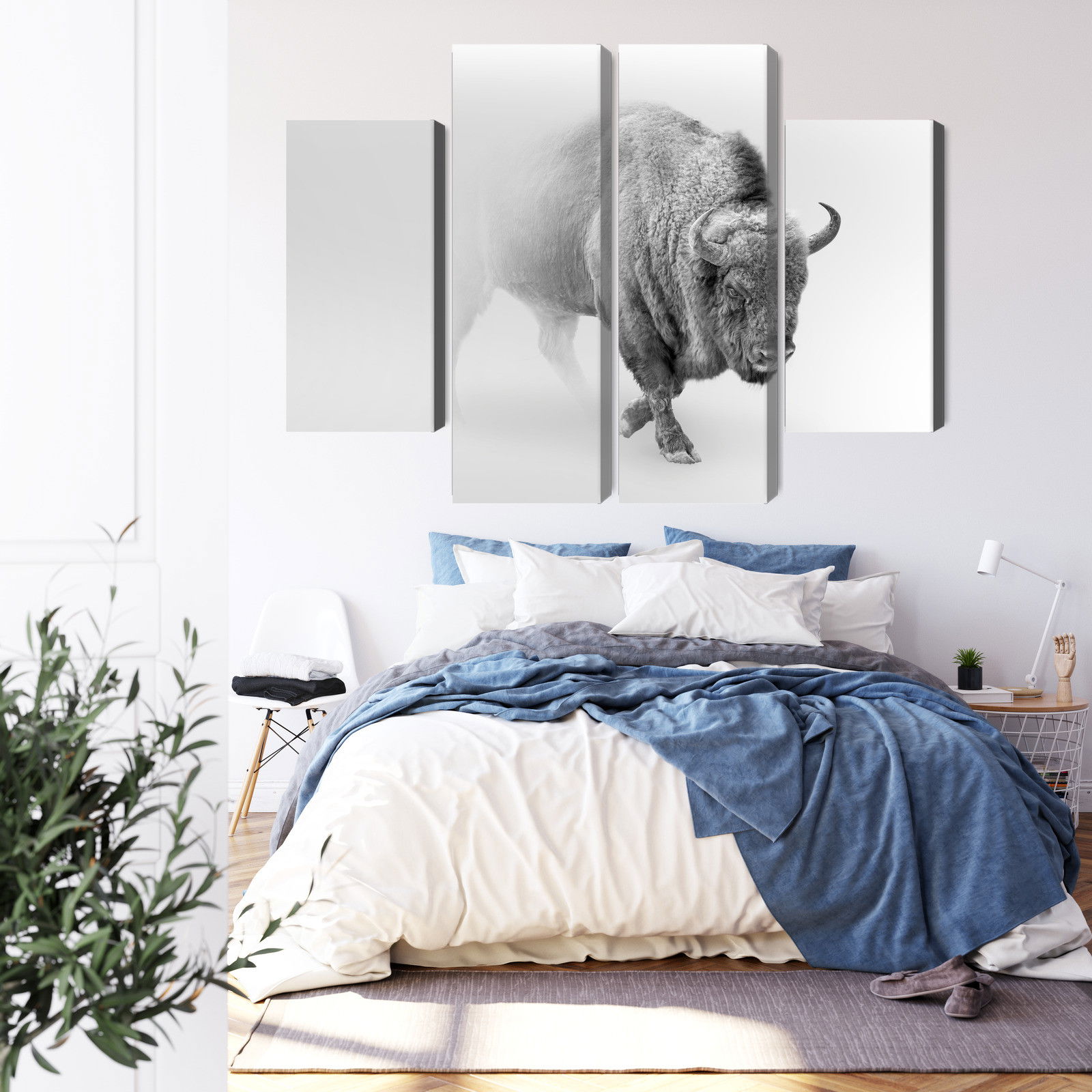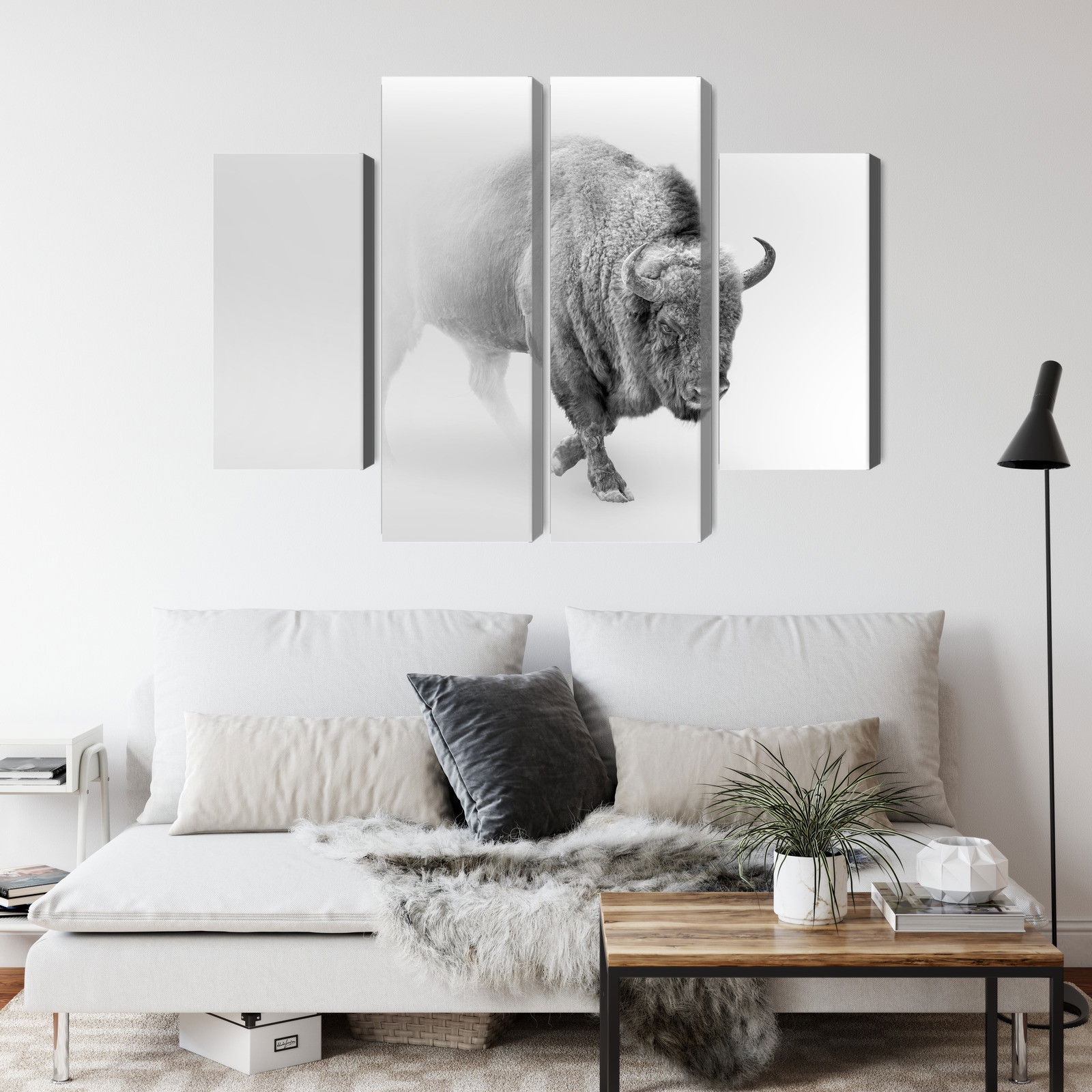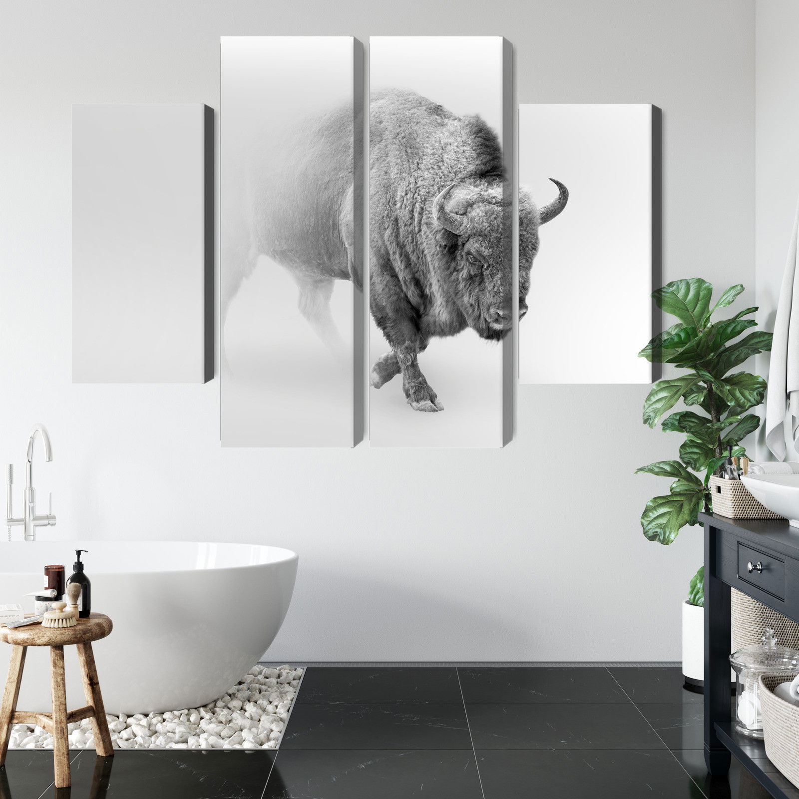 Varje tavla monteras på en massiv fururam. Format upp till 70×50 cm har en ram på 15 mm, medan format från 90×60 cm och uppåt har en ram på 20 mm. Den exakta dukspänningen gör att tavlan håller sin form över tid. Motivet Bison in the fog 3d trycks runt hela ramen vilket ger ett stilrent galleriuttryck där tavlan är lika vacker från sidan som framifrån. Kombinationen av rak dukspänning, rena linjer och korrekt tryck ger en professionell finish.