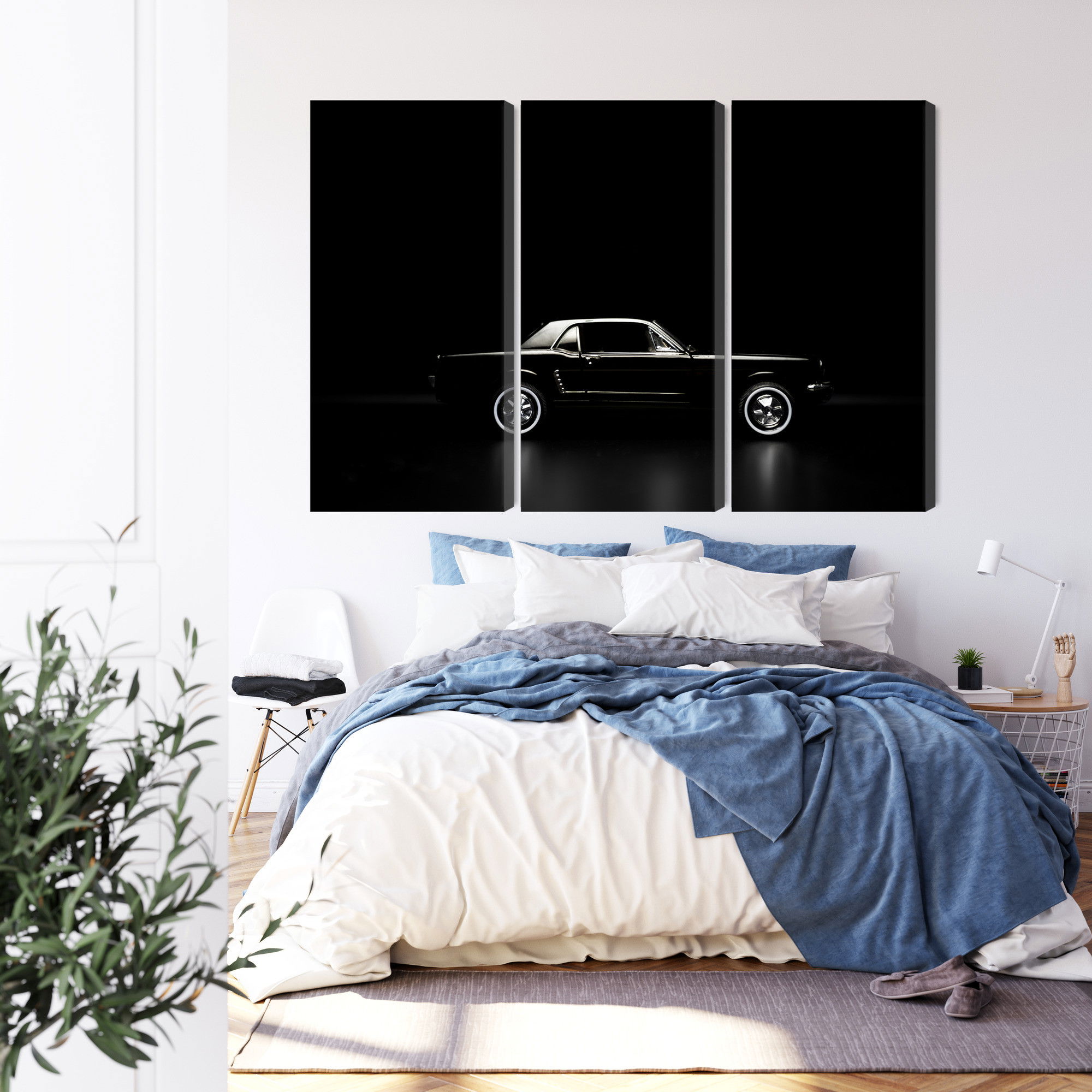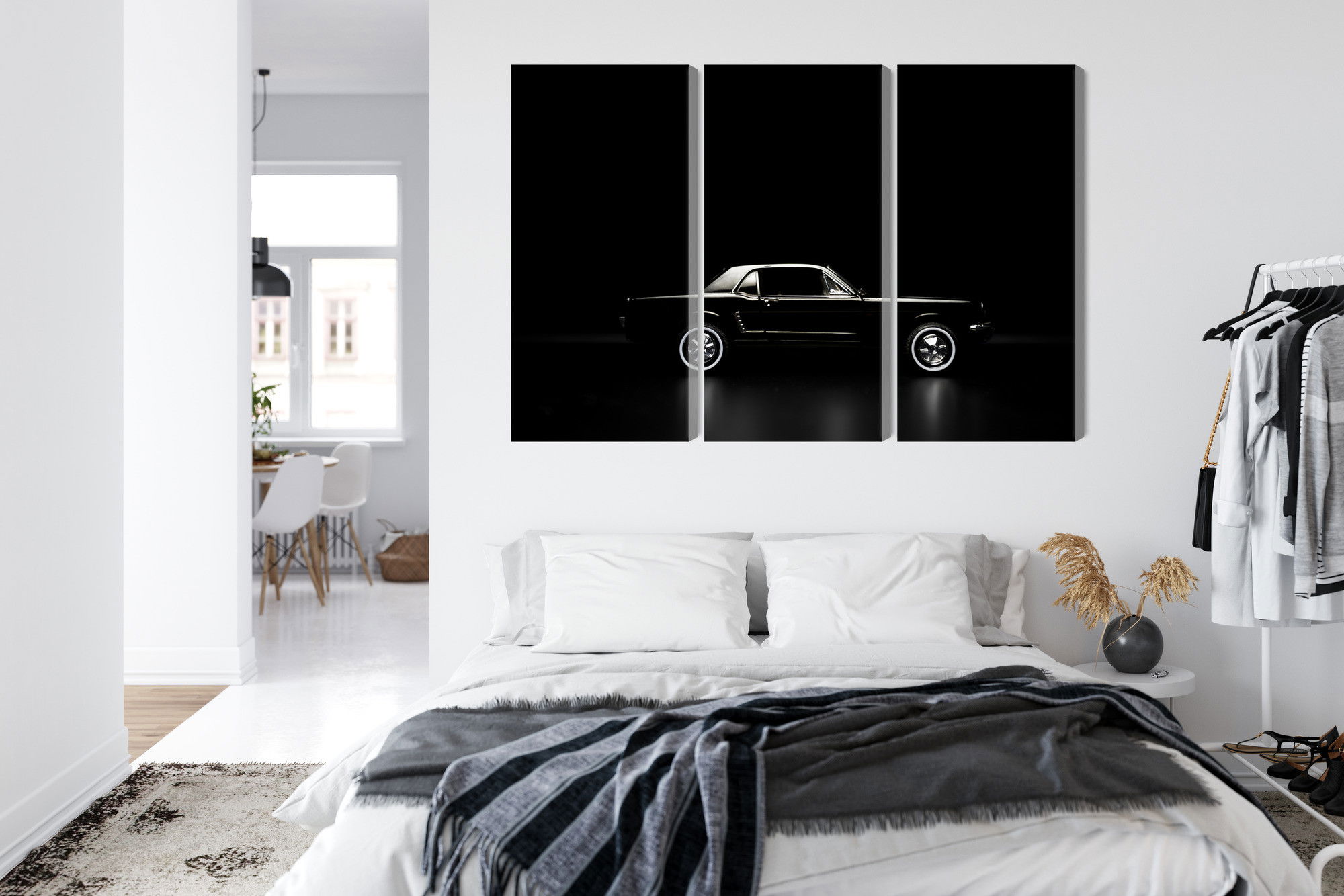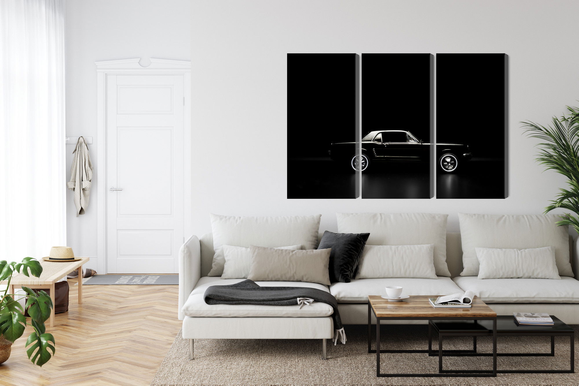 SilentDirects ljuddämpande tavla Black retro car on a dark kombinerar ett högupplöst motiv med avancerad akustikteknik. Varje tavla monteras i Sverige och bygger på en stabil canvastavla med fururam, där insidan av ramen fylls med en ljudabsorberande kärna av återvunnen polyester. Konstruktionen gör tavlan till ett både estetiskt och funktionellt inslag i rummet.