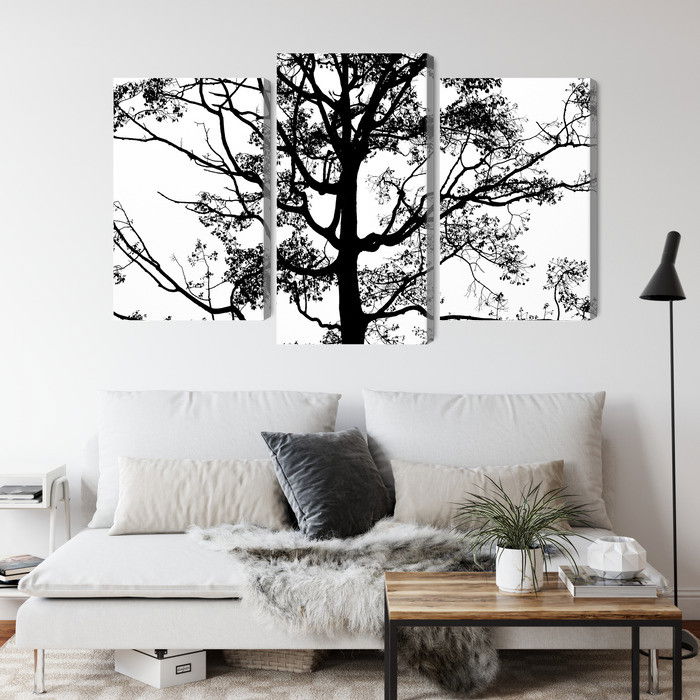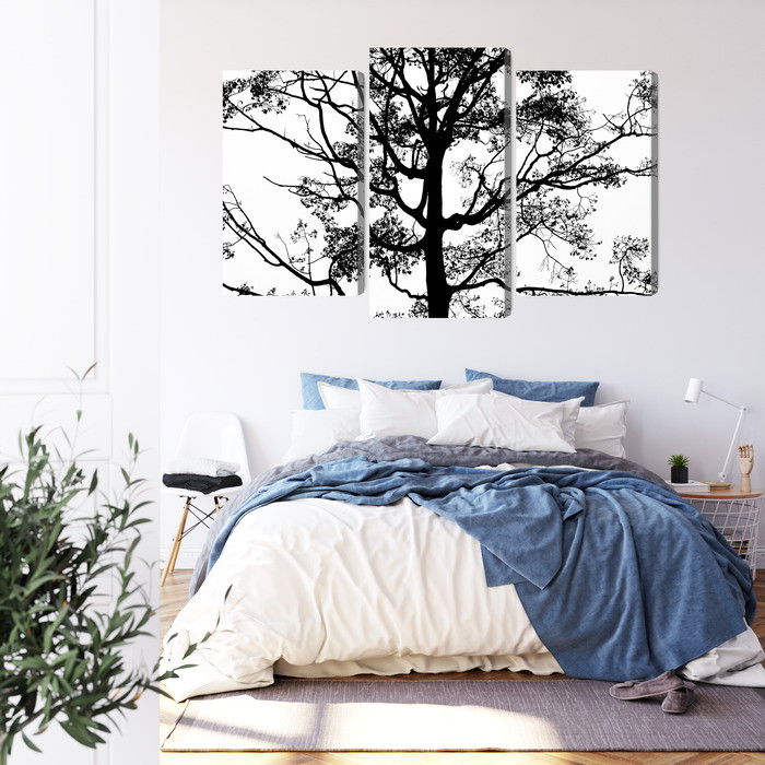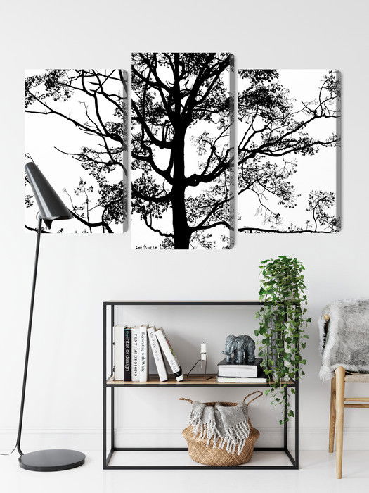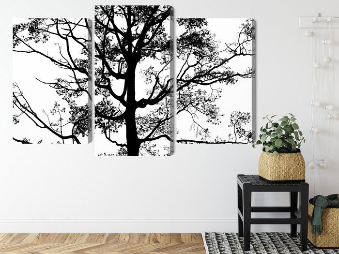 SilentDirects ljuddämpande tavla Black tree on a white kombinerar ett högupplöst motiv med avancerad akustikteknik. Varje tavla monteras i Sverige och bygger på en stabil canvastavla med fururam, där insidan av ramen fylls med en ljudabsorberande kärna av återvunnen polyester. Konstruktionen gör tavlan till ett både estetiskt och funktionellt inslag i rummet.