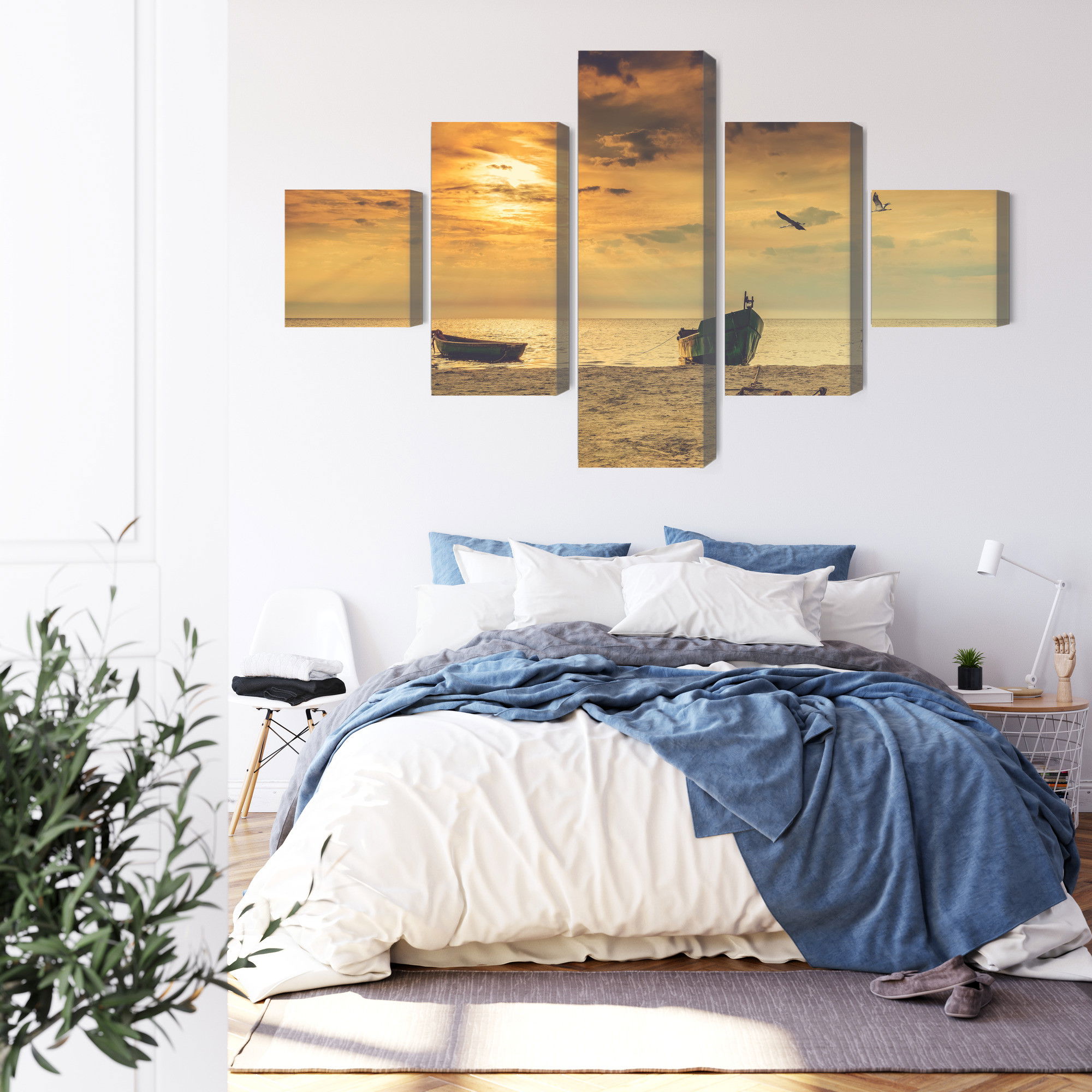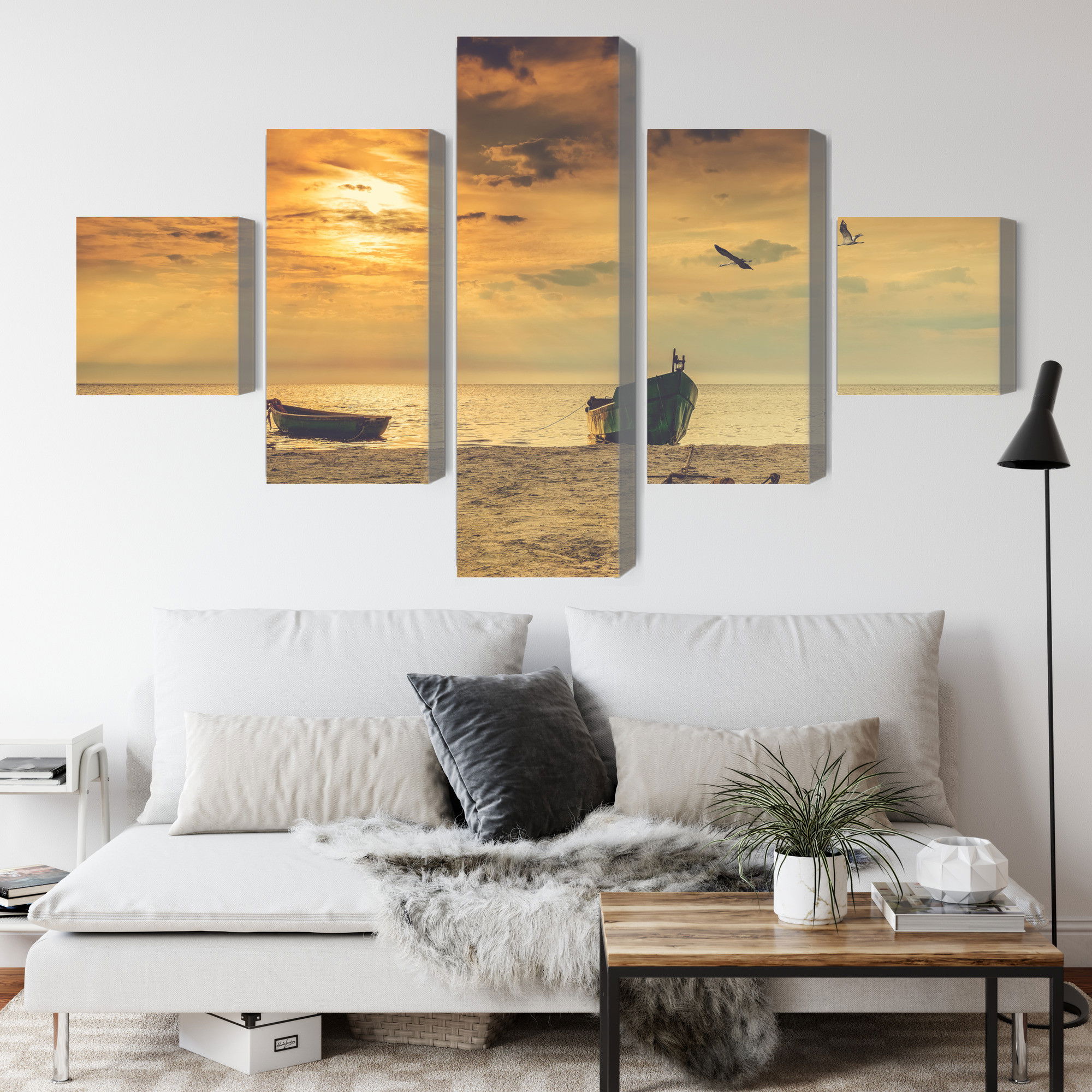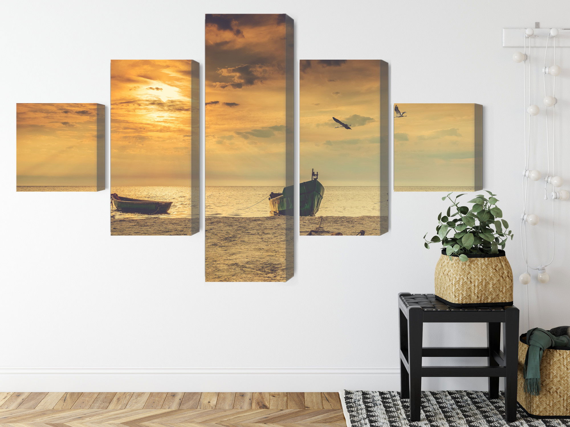 Ljuddämpande tavla – Boats on the beach at sunset för lugnare rum och mjukare akustik