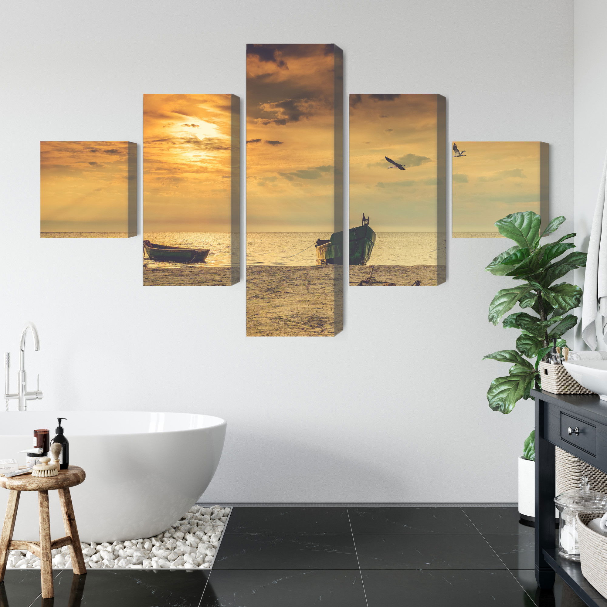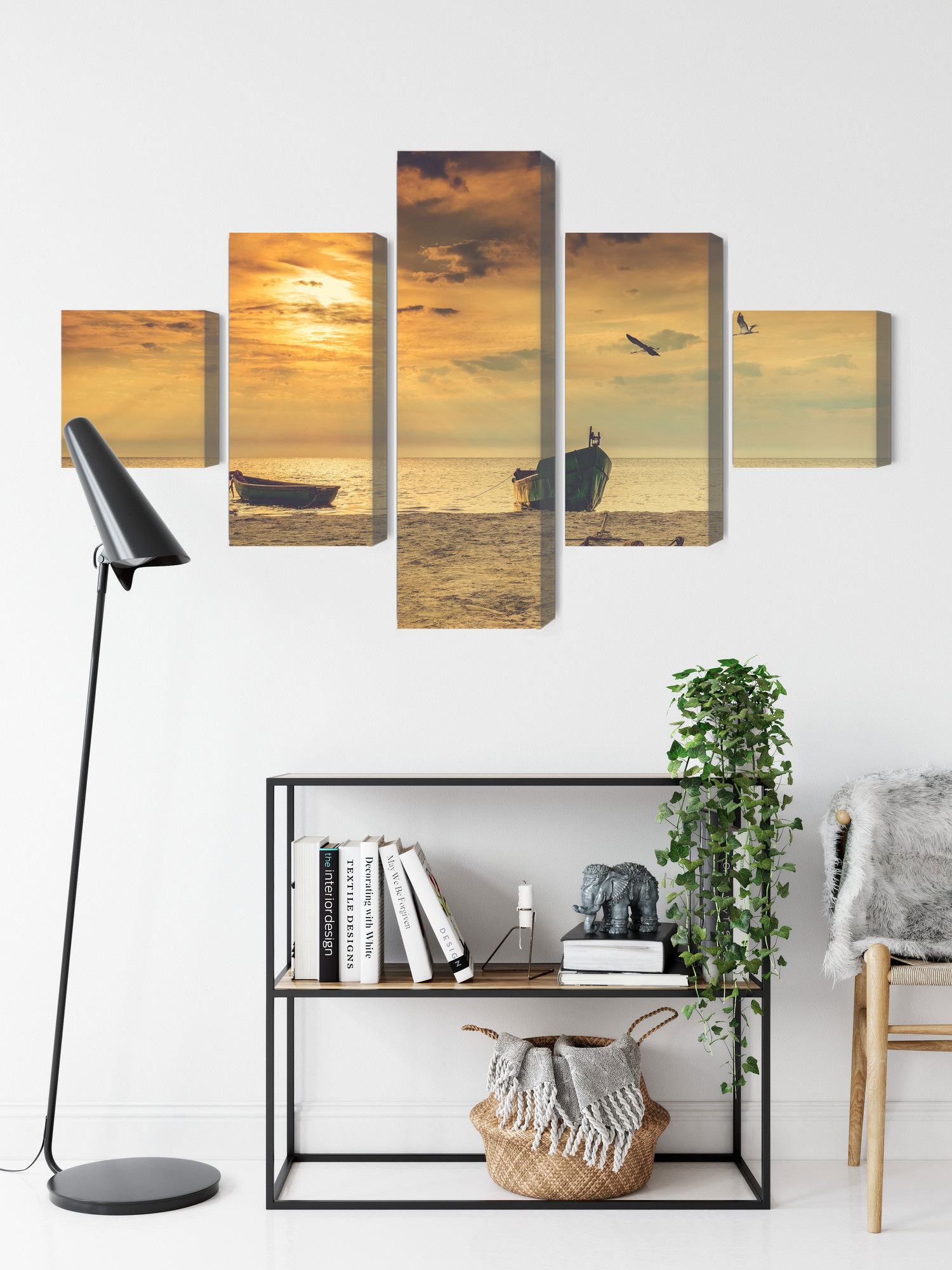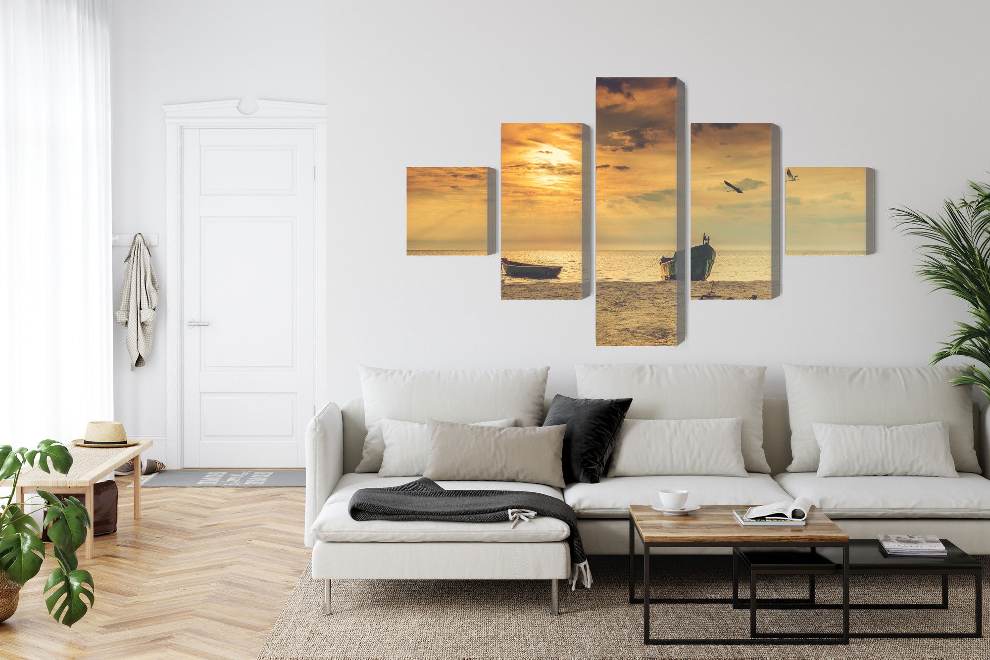 Ljuddämpande tavla – Boats on the beach at sunset för lugnare rum och mjukare akustik