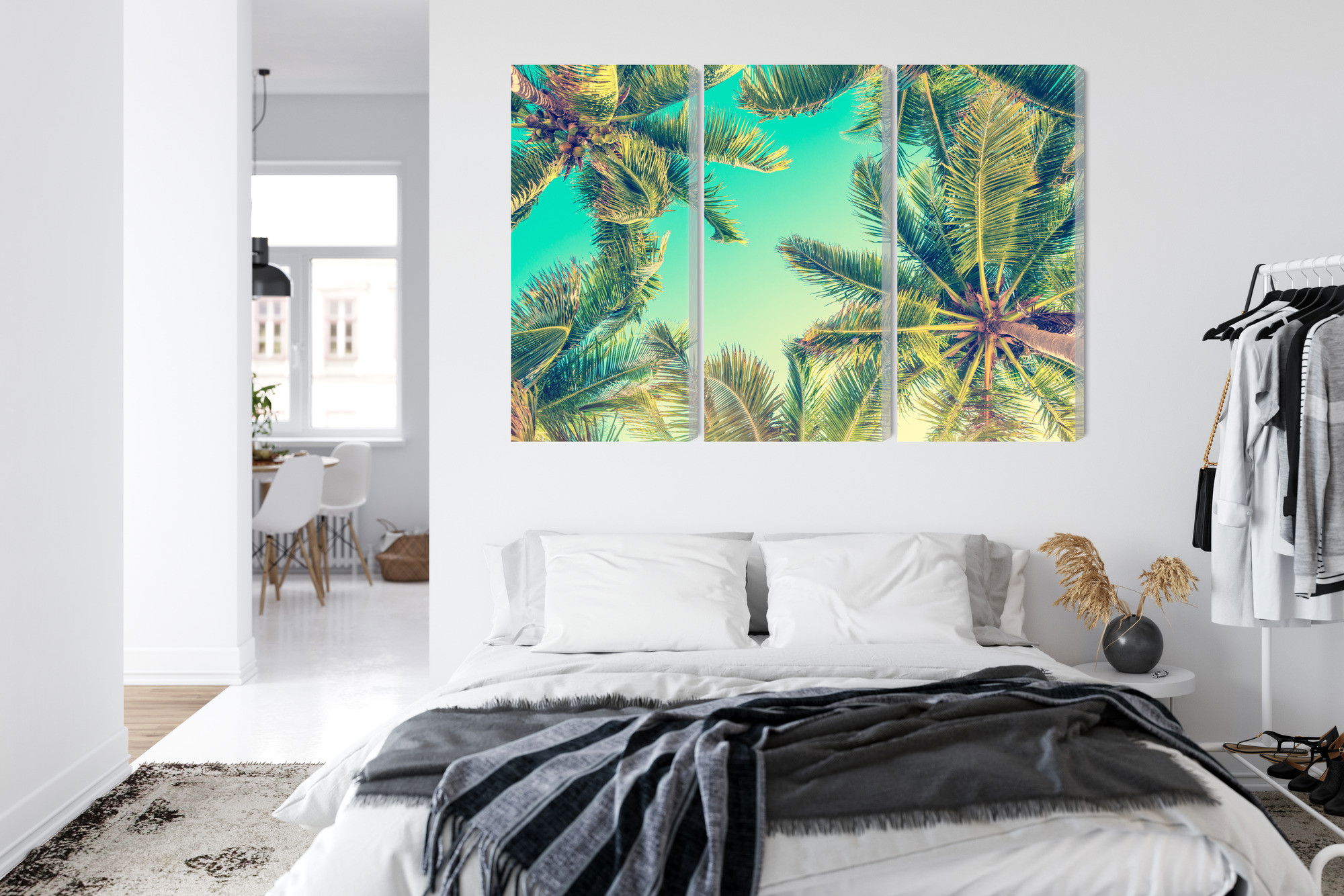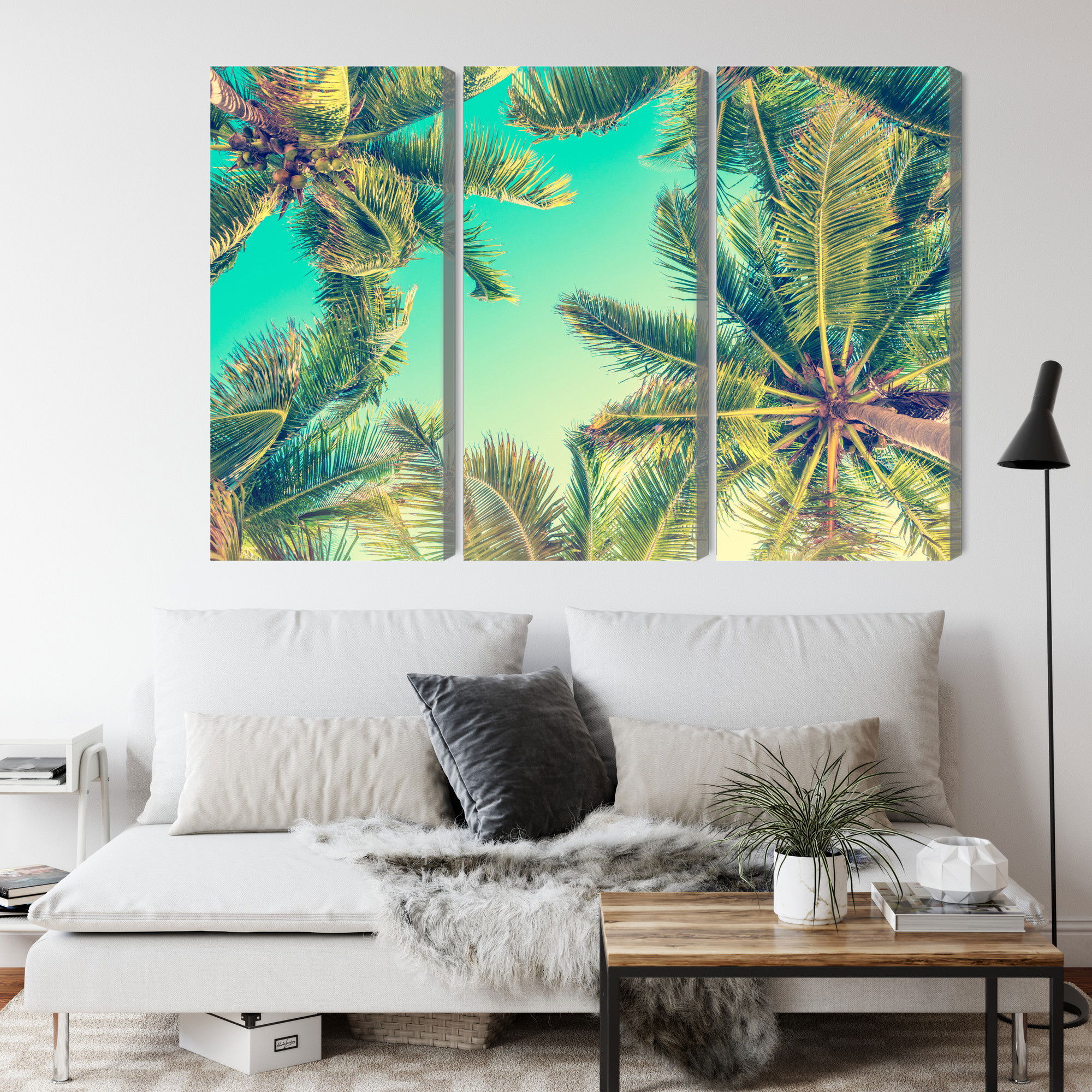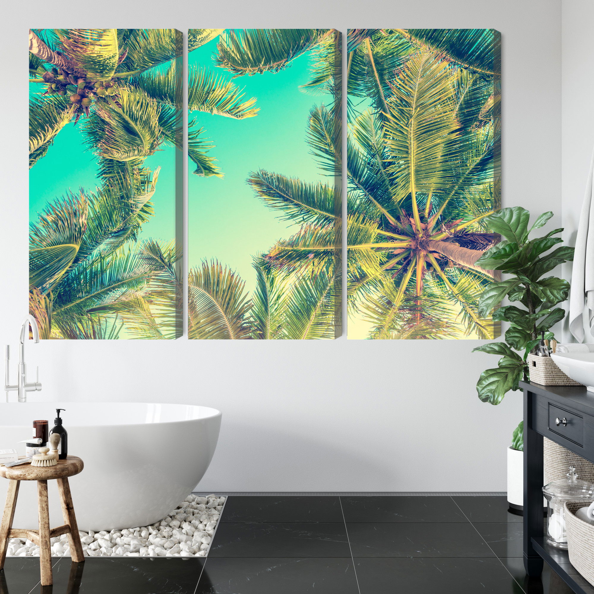 Motivet Bottom view of the palm trees återges med hög färgprecision och detaljrikedom tack vare HP Latex-teknologi. Trycket sker med vattenbaserade, luktfria och GREENGUARD Gold-certifierade bläck som ger en upplösning på upp till 300 DPI. Färgerna är UV-beständiga och behåller sin styrka även i ljusa rum, vilket gör tavlan lämplig för både hem- och offentliga miljöer.