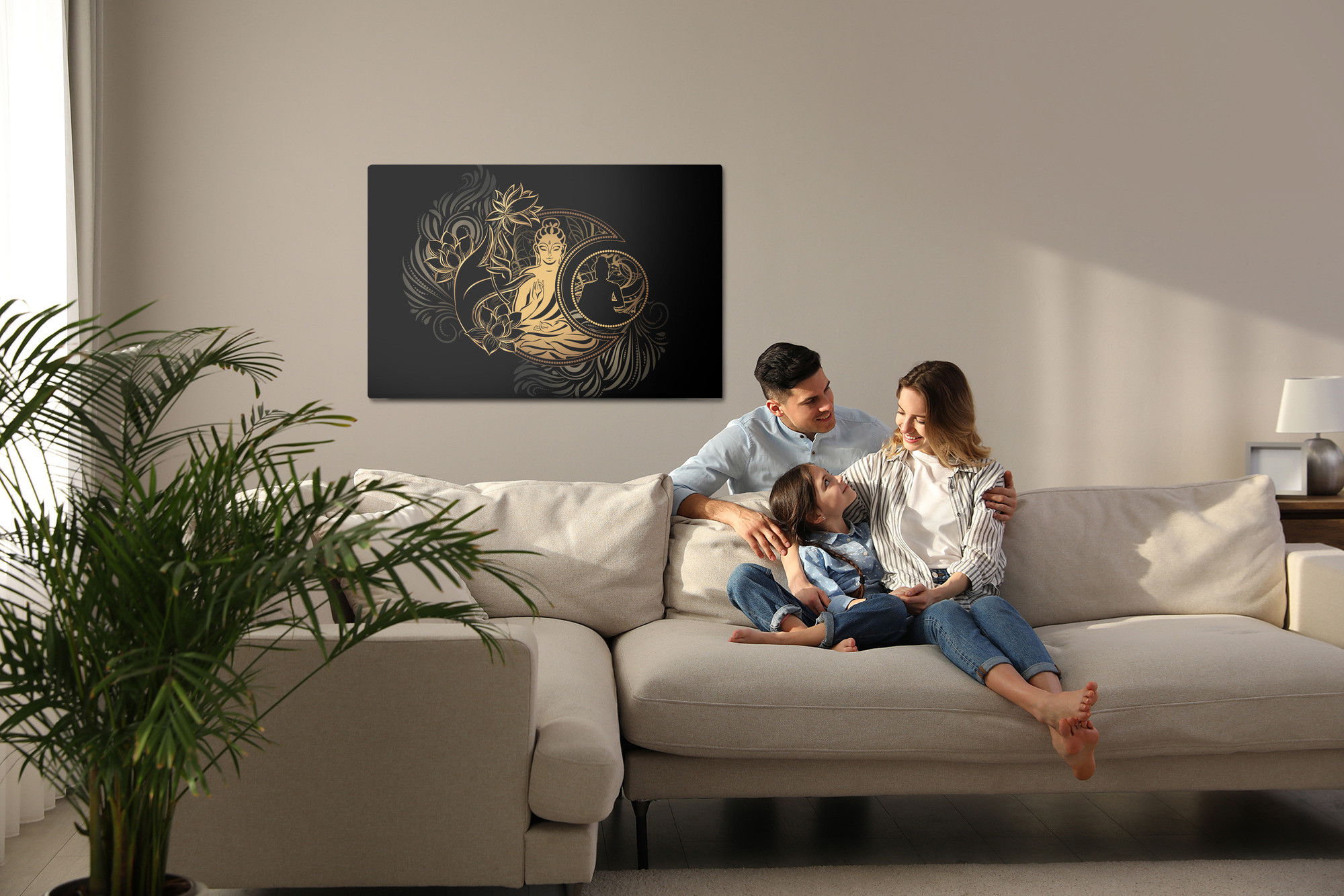 Varje tavla monteras på en massiv fururam. Format upp till 70×50 cm har en ram på 15 mm, medan format från 90×60 cm och uppåt har en ram på 20 mm. Den exakta dukspänningen gör att tavlan håller sin form över tid. Motivet Buddha image trycks runt hela ramen vilket ger ett stilrent galleriuttryck där tavlan är lika vacker från sidan som framifrån. Kombinationen av rak dukspänning, rena linjer och korrekt tryck ger en professionell finish.