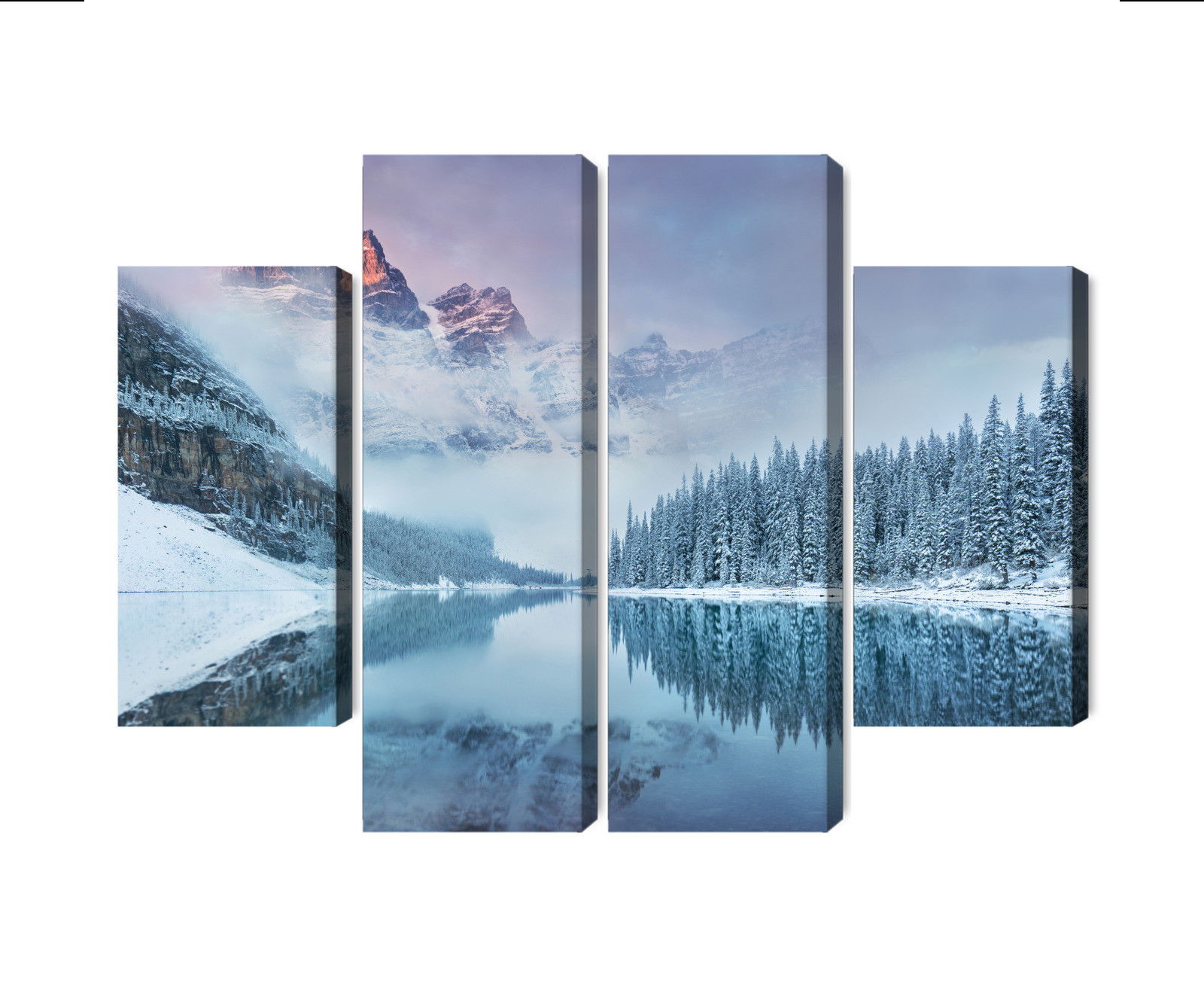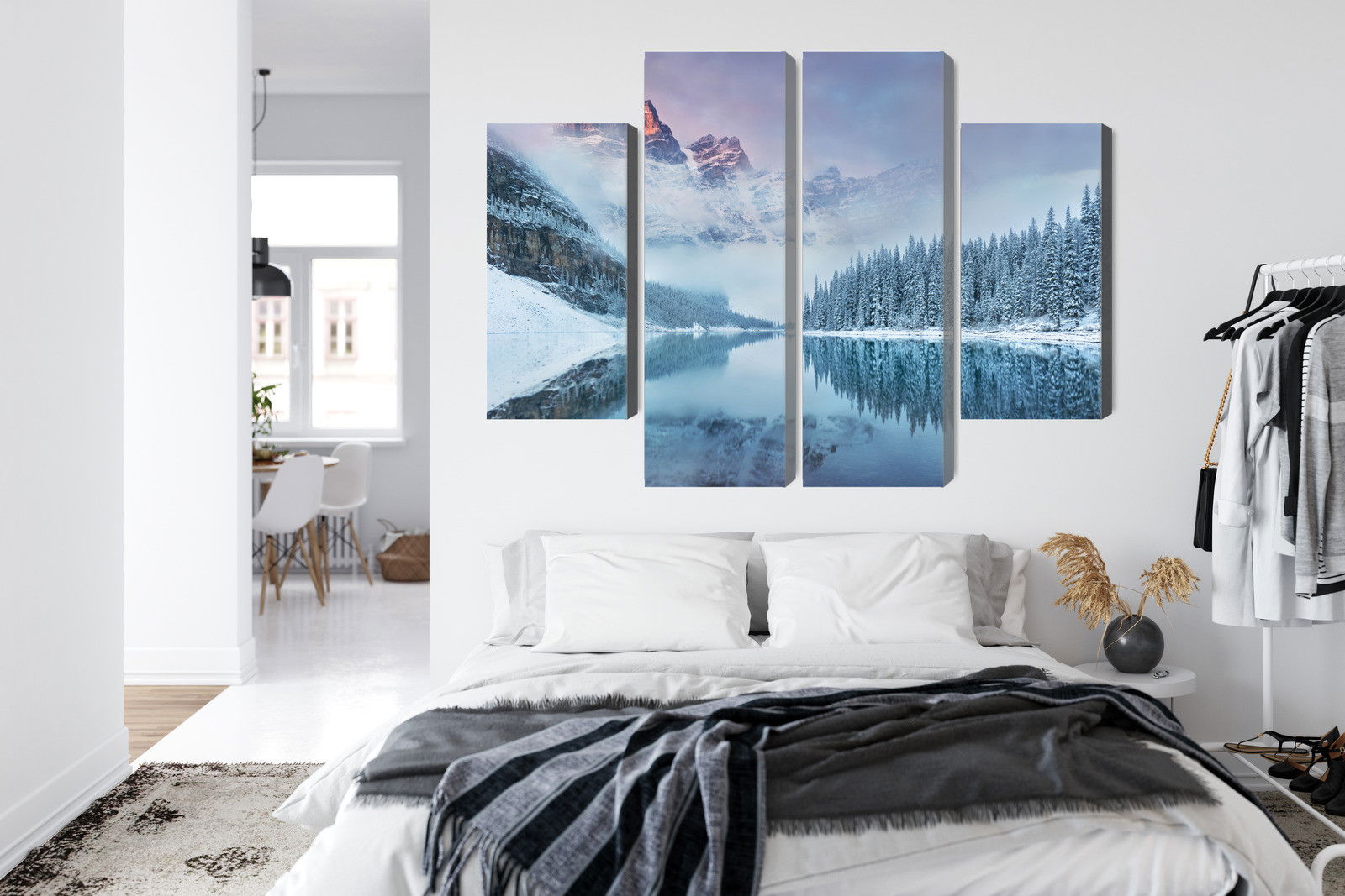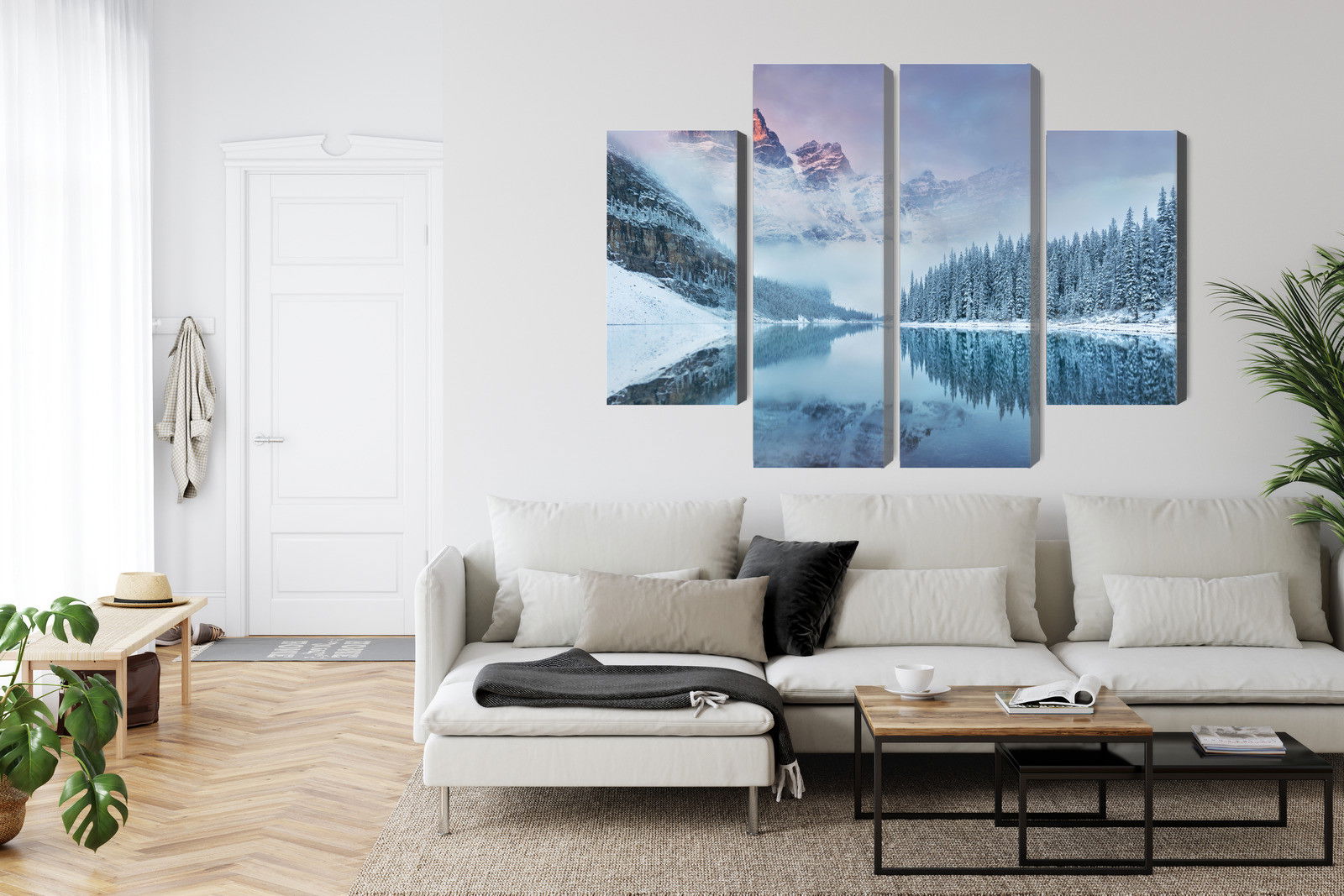 Varje tavla monteras på en massiv fururam. Format upp till 70×50 cm har en ram på 15 mm, medan format från 90×60 cm och uppåt har en ram på 20 mm. Den exakta dukspänningen gör att tavlan håller sin form över tid. Motivet Canadian Moraine Lake on a trycks runt hela ramen vilket ger ett stilrent galleriuttryck där tavlan är lika vacker från sidan som framifrån. Kombinationen av rak dukspänning, rena linjer och korrekt tryck ger en professionell finish.