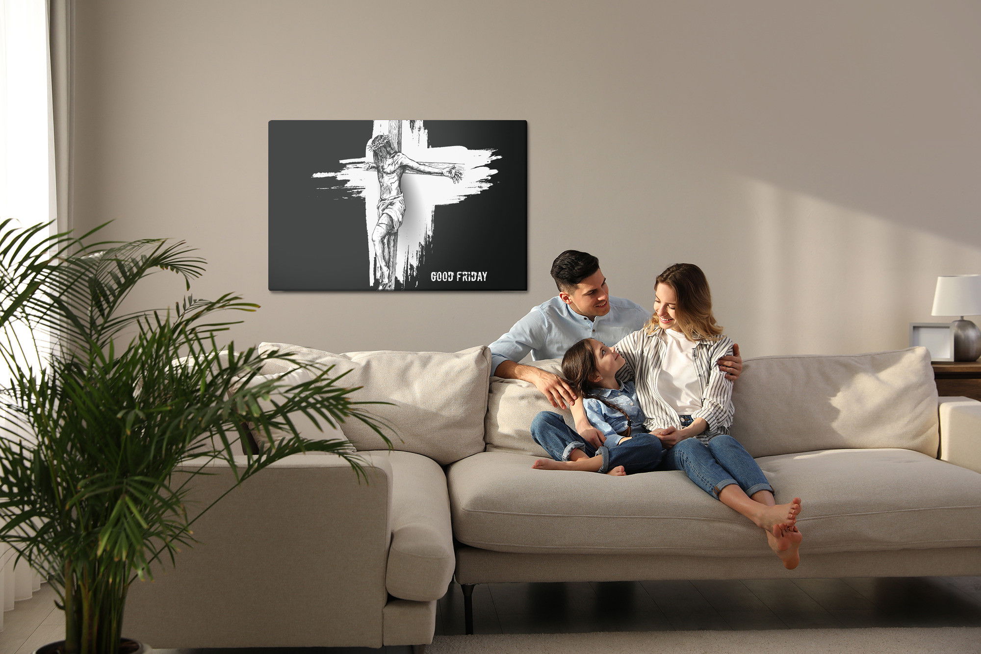 Motivet Christ on the cross återges med hög färgprecision och detaljrikedom tack vare HP Latex-teknologi. Trycket sker med vattenbaserade, luktfria och GREENGUARD Gold-certifierade bläck som ger en upplösning på upp till 300 DPI. Färgerna är UV-beständiga och behåller sin styrka även i ljusa rum, vilket gör tavlan lämplig för både hem- och offentliga miljöer.
