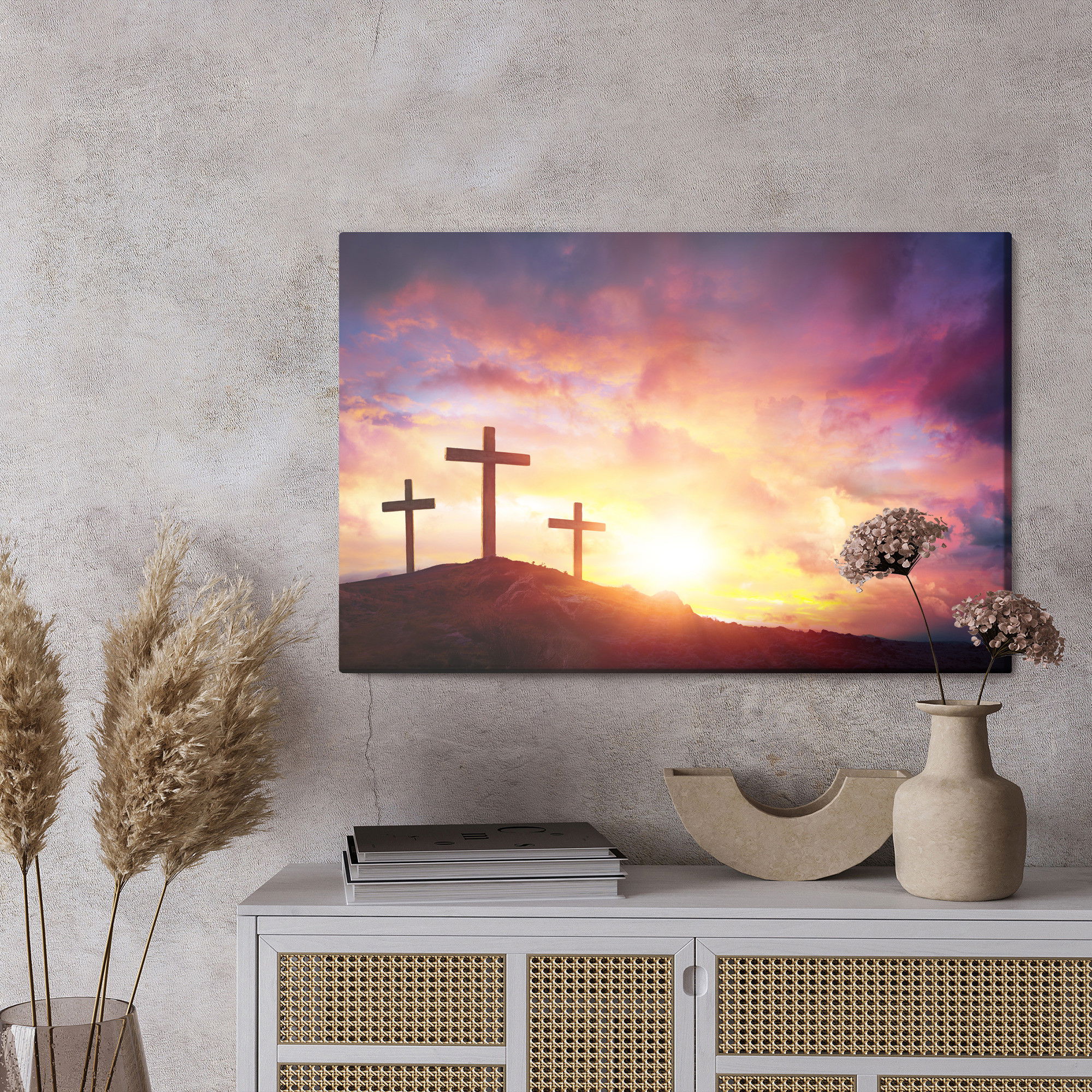 Varje tavla monteras på en massiv fururam. Format upp till 70×50 cm har en ram på 15 mm, medan format från 90×60 cm och uppåt har en ram på 20 mm. Den exakta dukspänningen gör att tavlan håller sin form över tid. Motivet Crosses on the hill trycks runt hela ramen vilket ger ett stilrent galleriuttryck där tavlan är lika vacker från sidan som framifrån. Kombinationen av rak dukspänning, rena linjer och korrekt tryck ger en professionell finish.