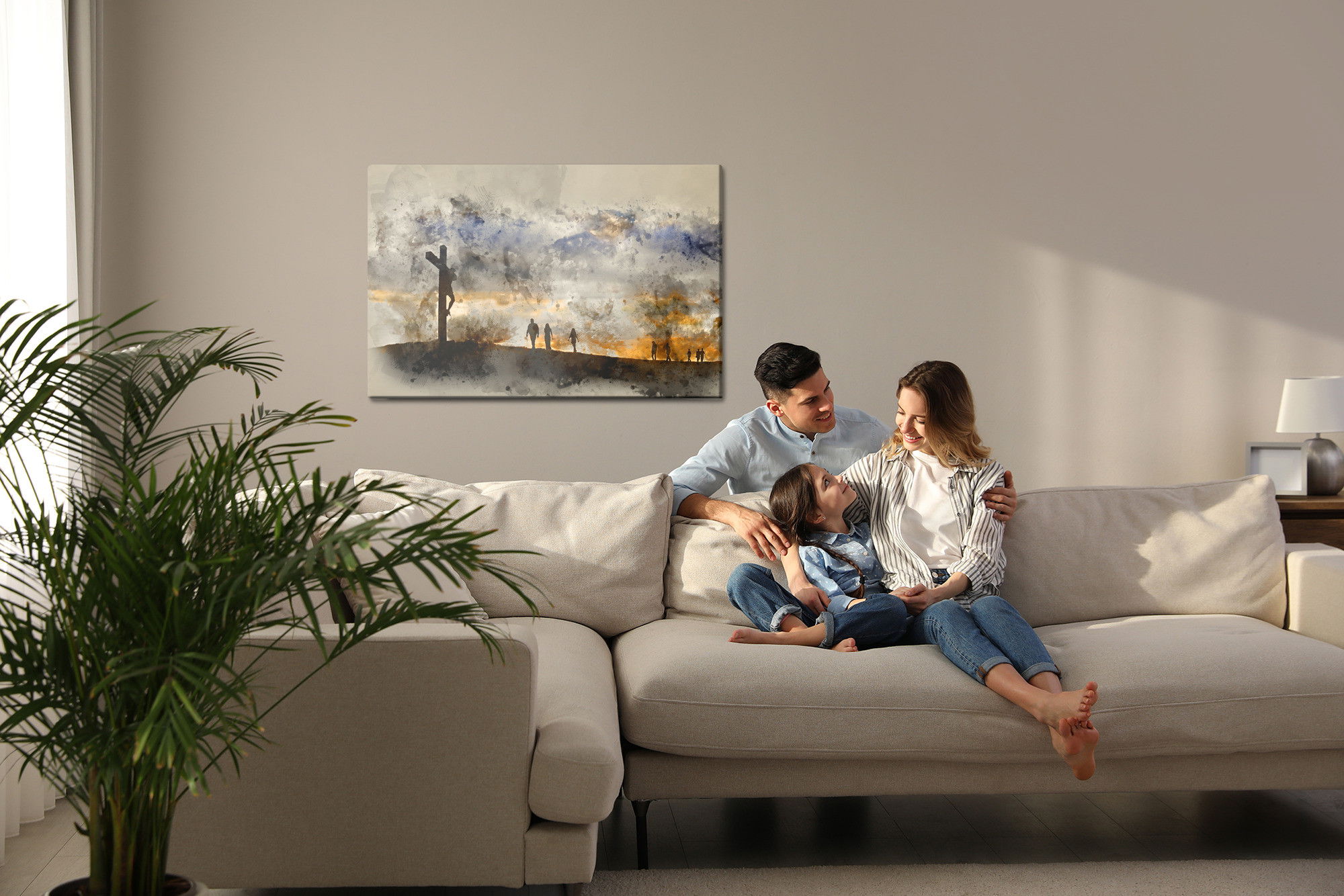 Varje tavla monteras på en massiv fururam. Format upp till 70×50 cm har en ram på 15 mm, medan format från 90×60 cm och uppåt har en ram på 20 mm. Den exakta dukspänningen gör att tavlan håller sin form över tid. Motivet Crucified christ trycks runt hela ramen vilket ger ett stilrent galleriuttryck där tavlan är lika vacker från sidan som framifrån. Kombinationen av rak dukspänning, rena linjer och korrekt tryck ger en professionell finish.
