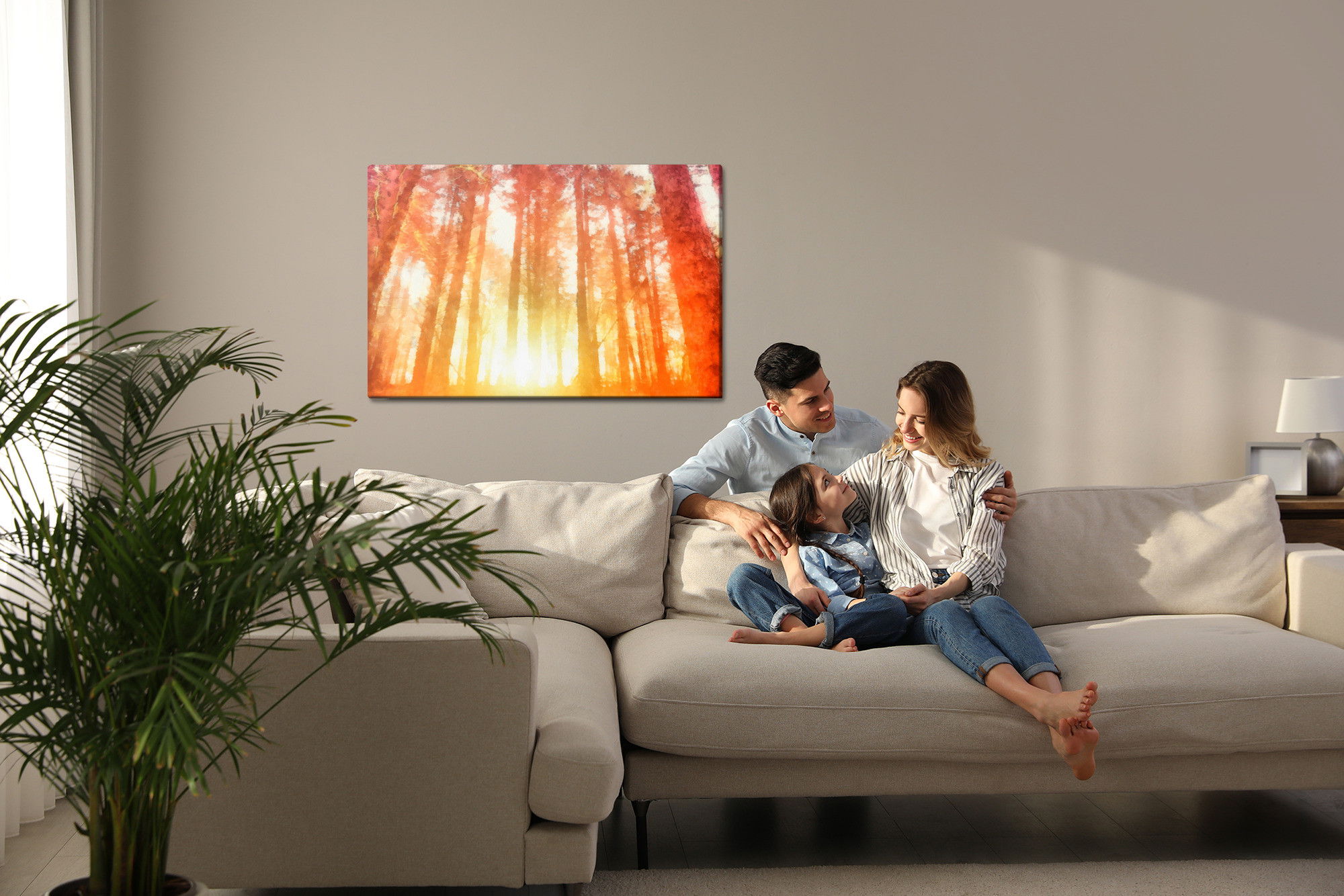 Varje tavla monteras på en massiv fururam. Format upp till 70×50 cm har en ram på 15 mm, medan format från 90×60 cm och uppåt har en ram på 20 mm. Den exakta dukspänningen gör att tavlan håller sin form över tid. Motivet Dawn in a beautiful forest trycks runt hela ramen vilket ger ett stilrent galleriuttryck där tavlan är lika vacker från sidan som framifrån. Kombinationen av rak dukspänning, rena linjer och korrekt tryck ger en professionell finish.