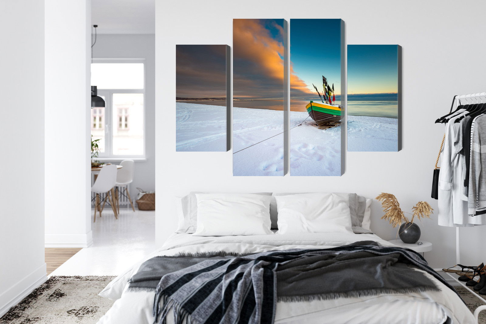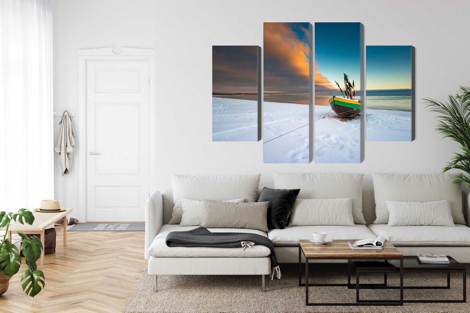 Varje tavla monteras på en massiv fururam. Format upp till 70×50 cm har en ram på 15 mm, medan format från 90×60 cm och uppåt har en ram på 20 mm. Den exakta dukspänningen gör att tavlan håller sin form över tid. Motivet Fishing boat trycks runt hela ramen vilket ger ett stilrent galleriuttryck där tavlan är lika vacker från sidan som framifrån. Kombinationen av rak dukspänning, rena linjer och korrekt tryck ger en professionell finish.