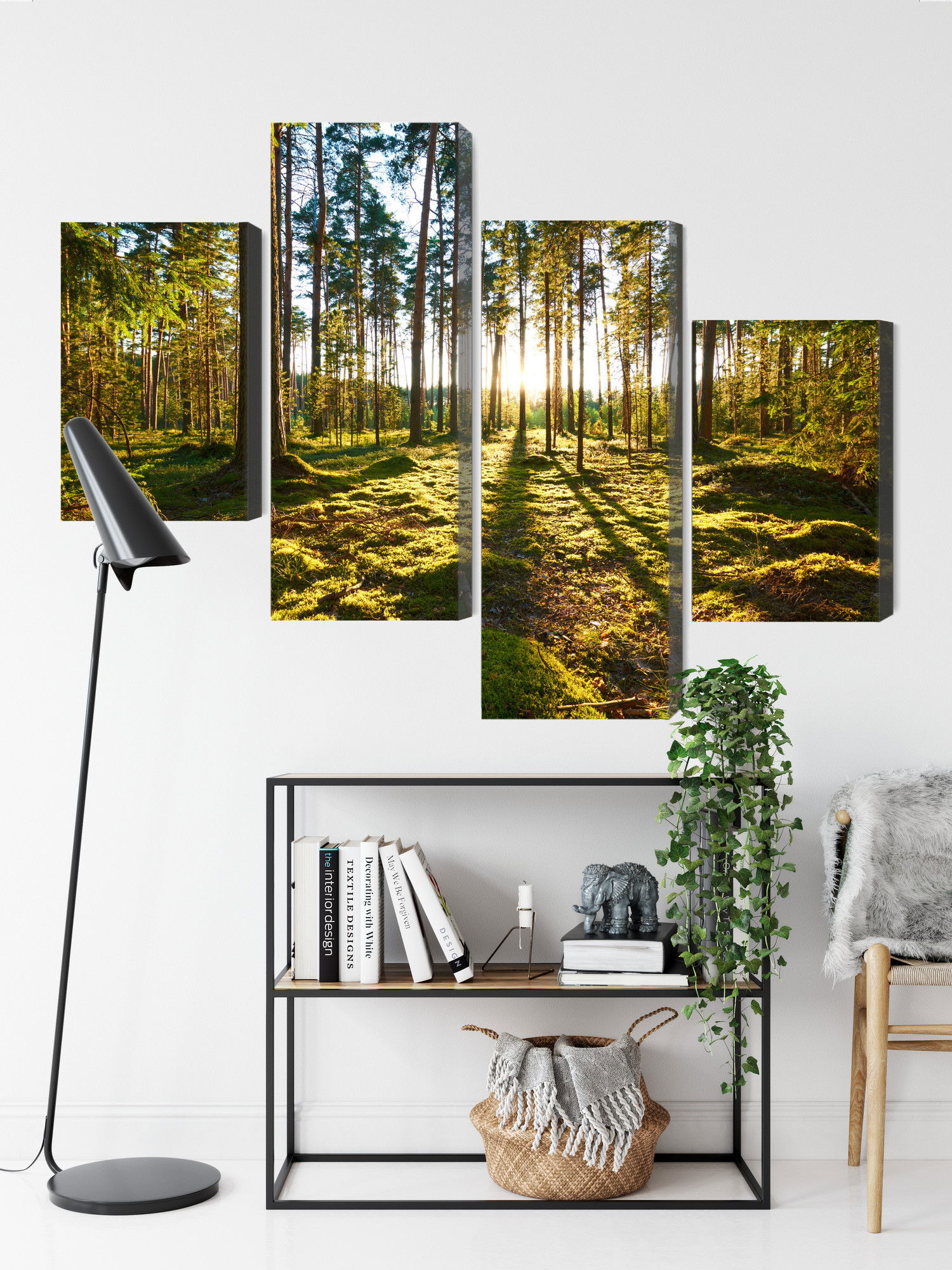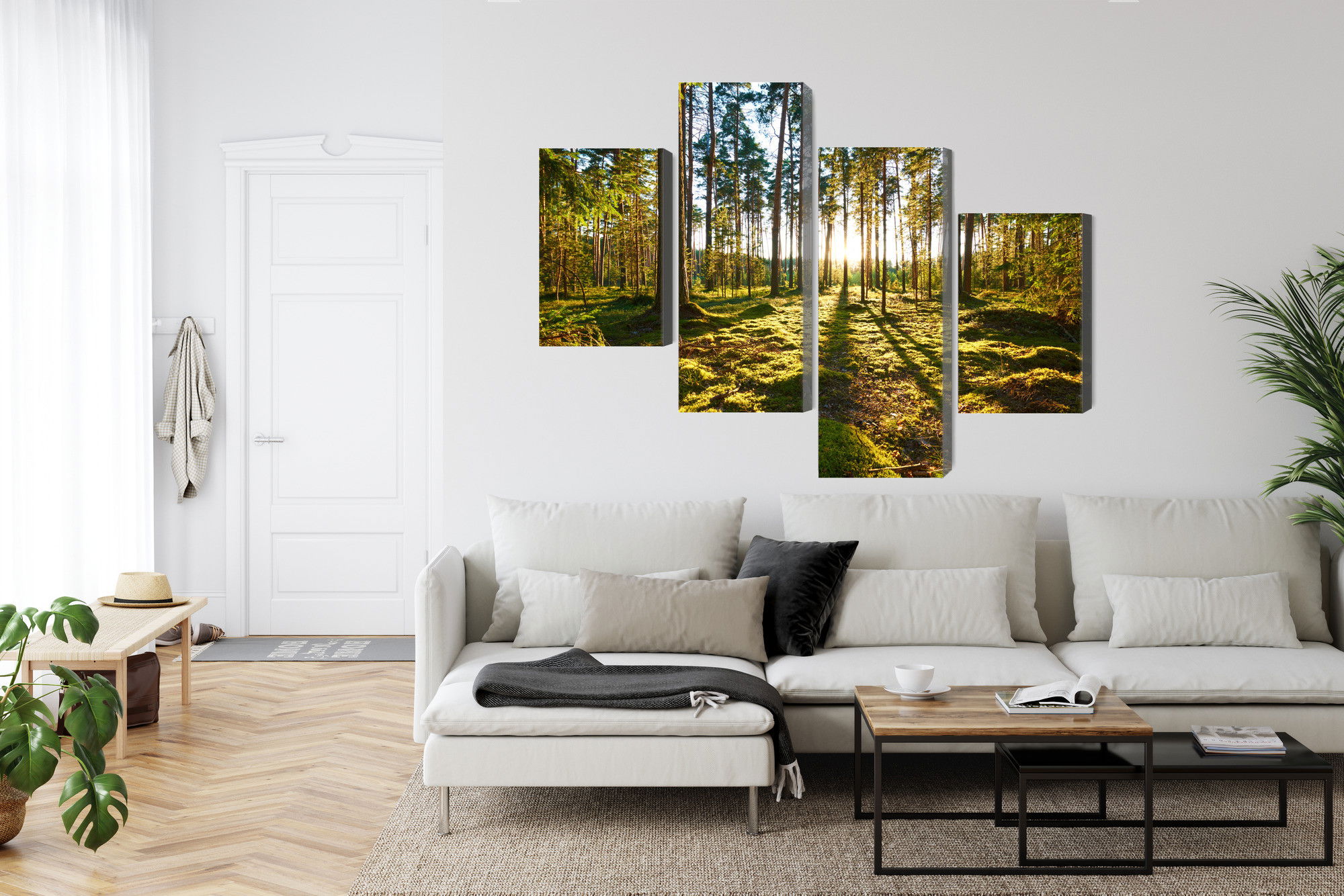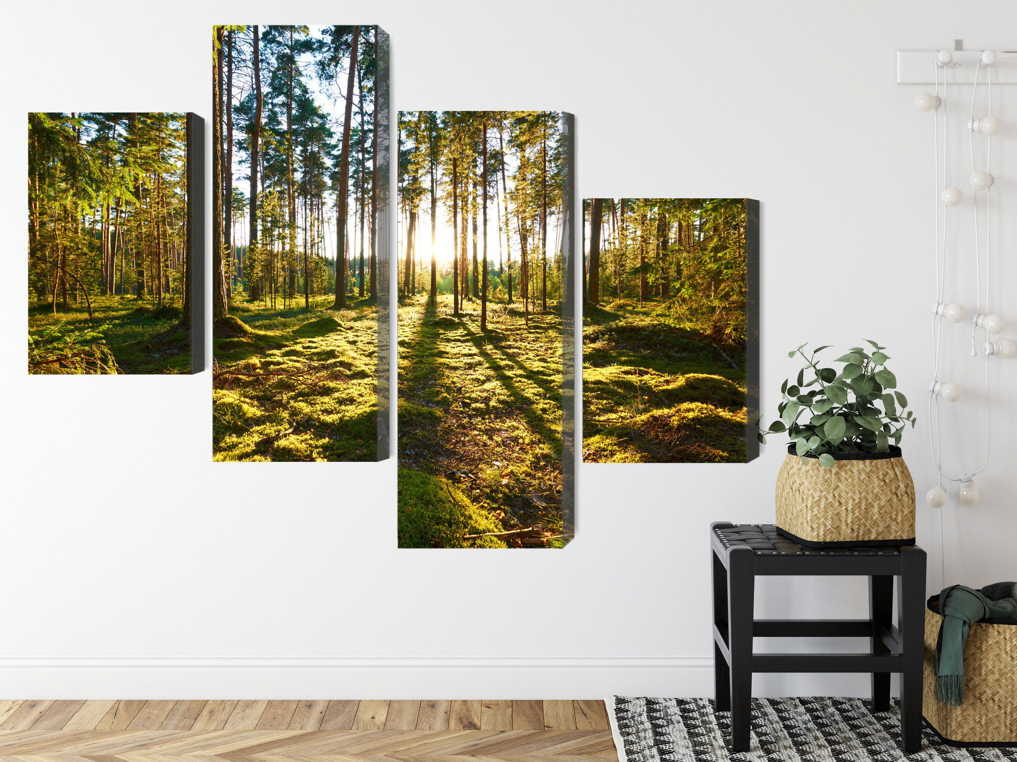 SilentDirects ljuddämpande tavla Forest landscape with sunset kombinerar ett högupplöst motiv med avancerad akustikteknik. Varje tavla monteras i Sverige och bygger på en stabil canvastavla med fururam, där insidan av ramen fylls med en ljudabsorberande kärna av återvunnen polyester. Konstruktionen gör tavlan till ett både estetiskt och funktionellt inslag i rummet.