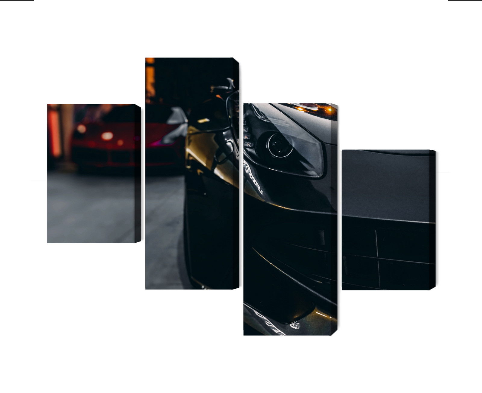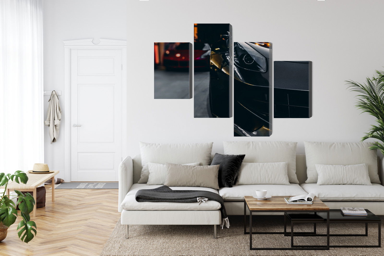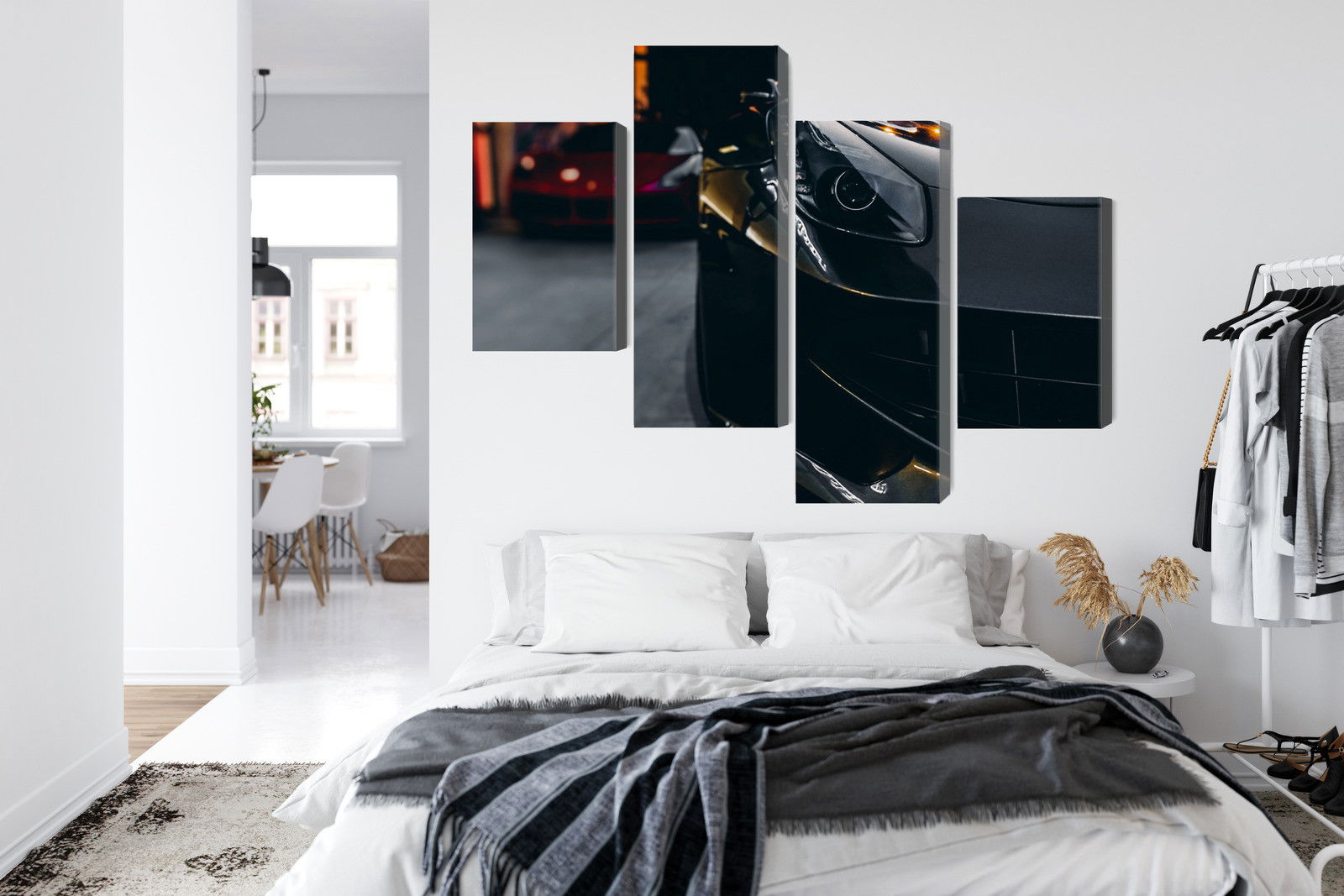 Varje tavla monteras på en massiv fururam. Format upp till 70×50 cm har en ram på 15 mm, medan format från 90×60 cm och uppåt har en ram på 20 mm. Den exakta dukspänningen gör att tavlan håller sin form över tid. Motivet Front of a black sports car trycks runt hela ramen vilket ger ett stilrent galleriuttryck där tavlan är lika vacker från sidan som framifrån. Kombinationen av rak dukspänning, rena linjer och korrekt tryck ger en professionell finish.