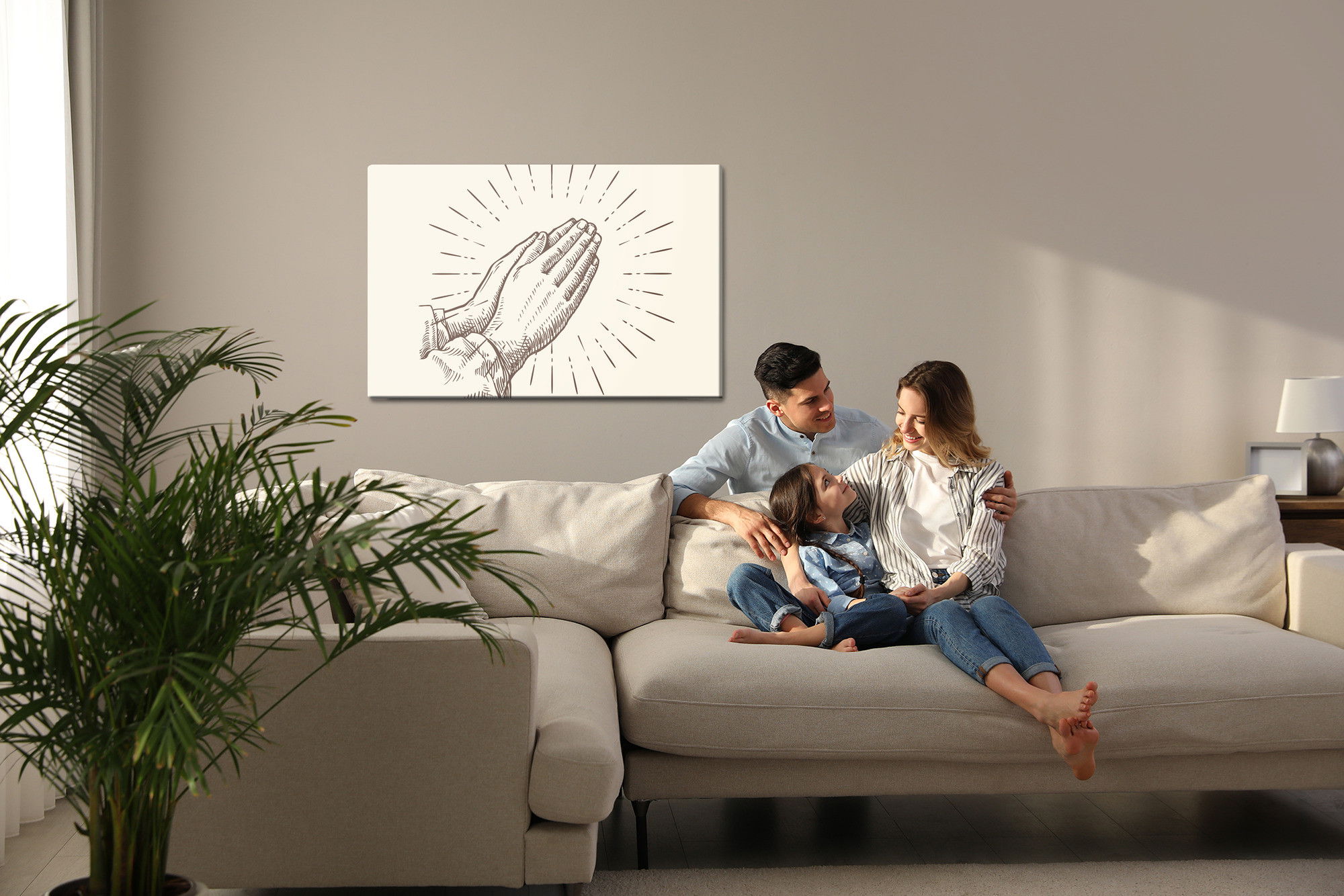 Varje tavla monteras på en massiv fururam. Format upp till 70×50 cm har en ram på 15 mm, medan format från 90×60 cm och uppåt har en ram på 20 mm. Den exakta dukspänningen gör att tavlan håller sin form över tid. Motivet Hands folded in prayer trycks runt hela ramen vilket ger ett stilrent galleriuttryck där tavlan är lika vacker från sidan som framifrån. Kombinationen av rak dukspänning, rena linjer och korrekt tryck ger en professionell finish.