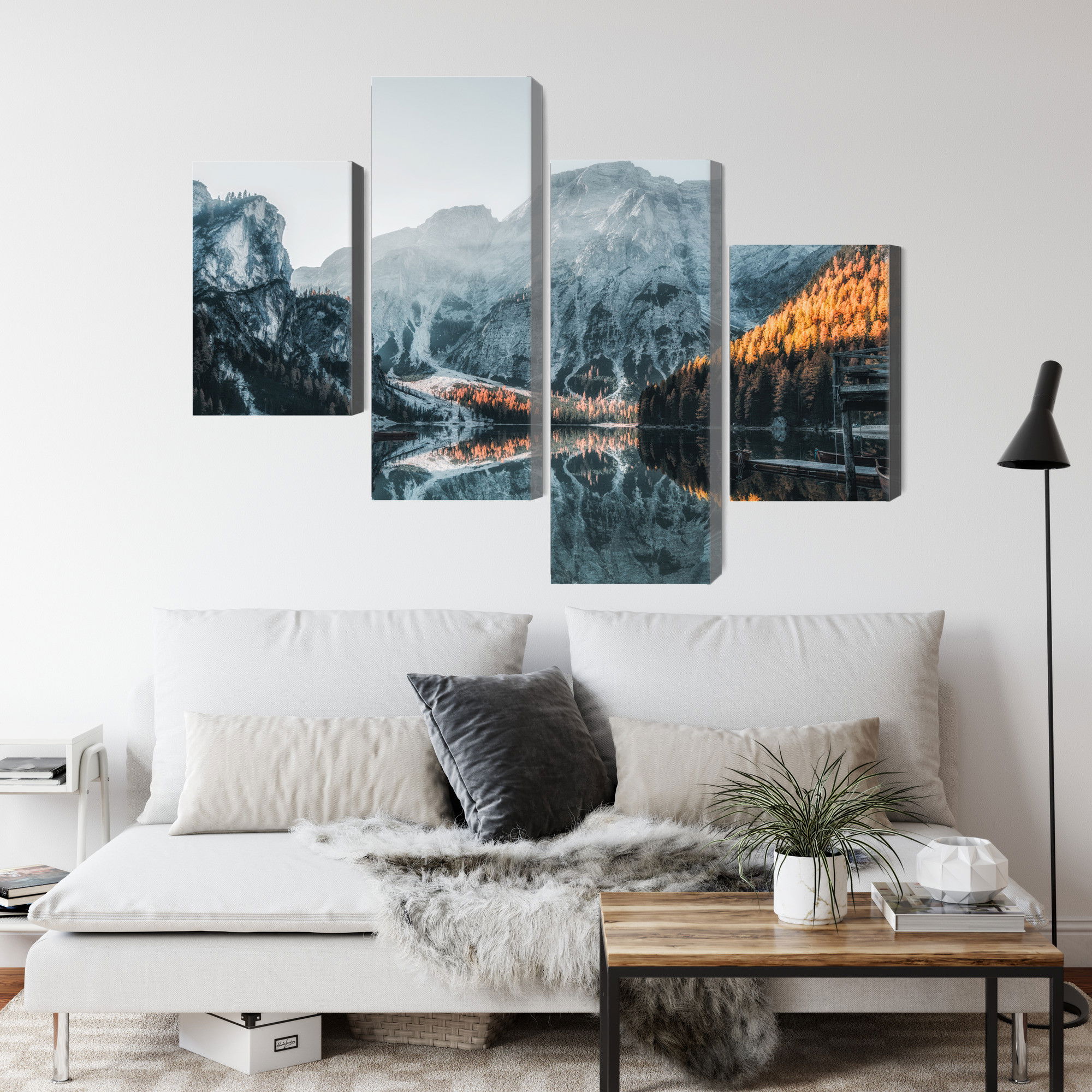 Varje tavla monteras på en massiv fururam. Format upp till 70×50 cm har en ram på 15 mm, medan format från 90×60 cm och uppåt har en ram på 20 mm. Den exakta dukspänningen gör att tavlan håller sin form över tid. Motivet Italian lake braies 3d trycks runt hela ramen vilket ger ett stilrent galleriuttryck där tavlan är lika vacker från sidan som framifrån. Kombinationen av rak dukspänning, rena linjer och korrekt tryck ger en professionell finish.