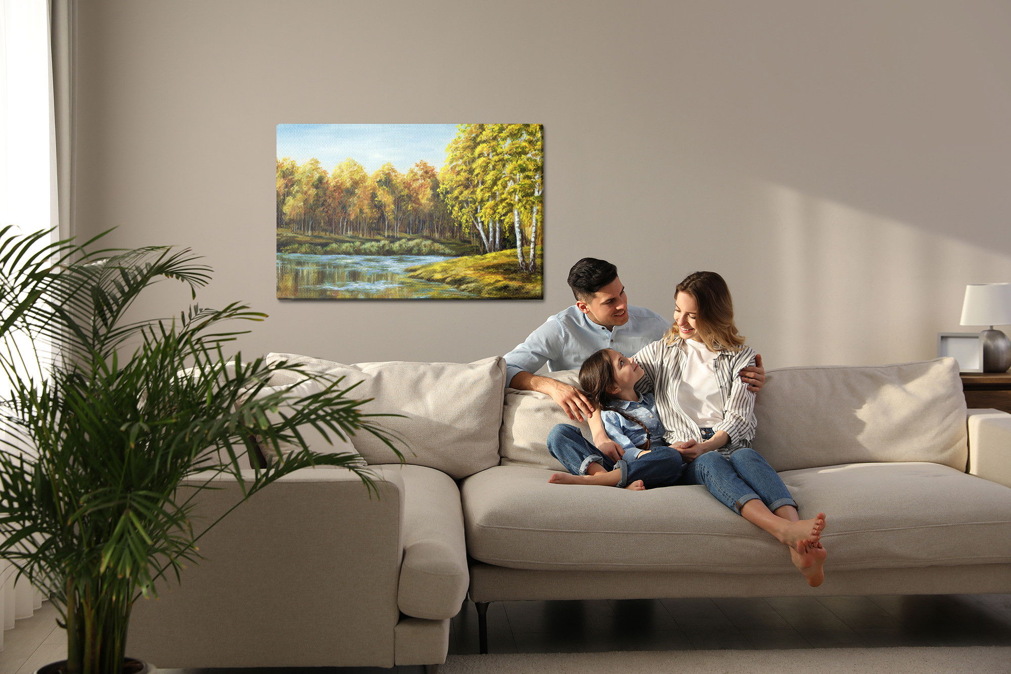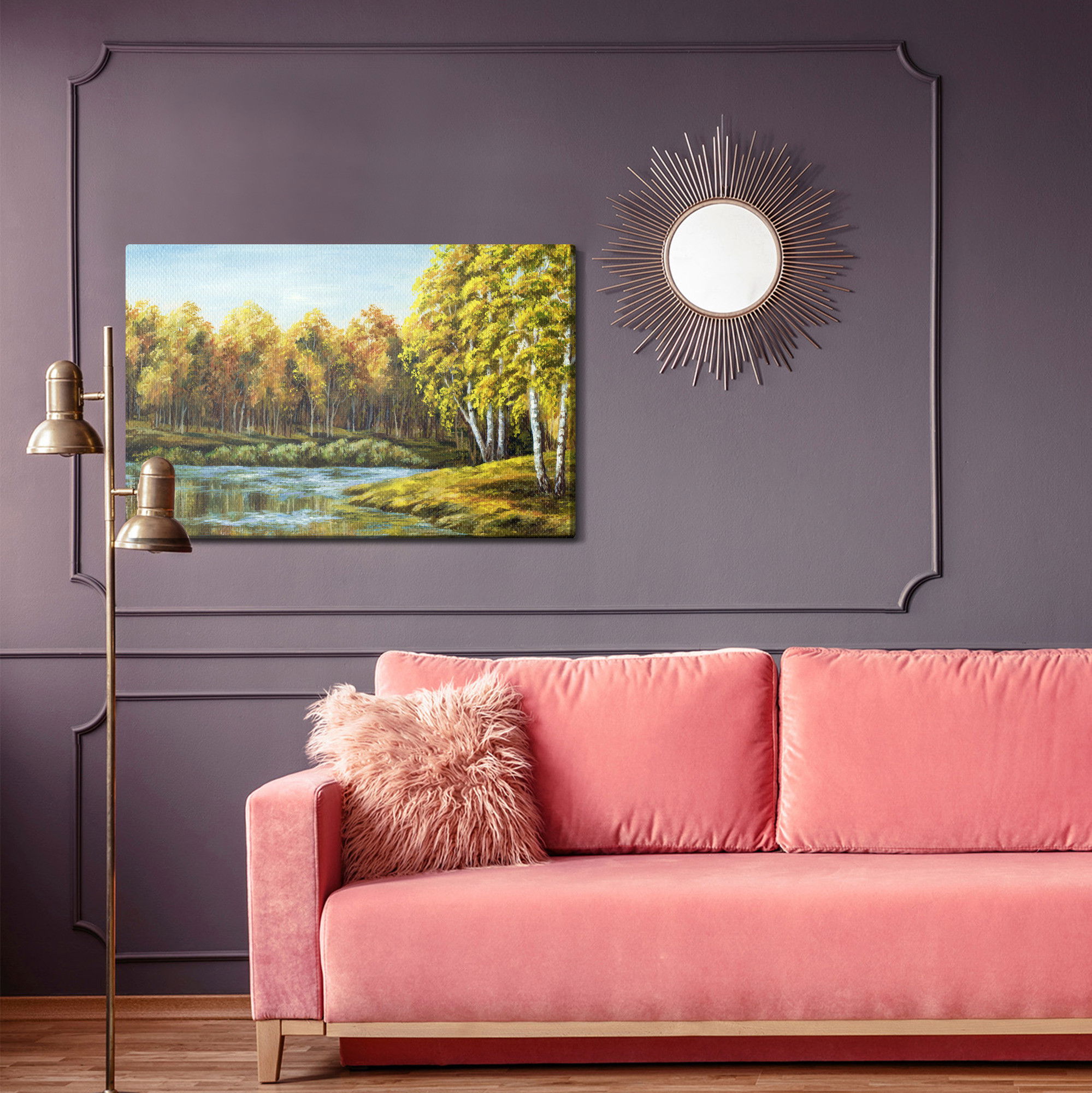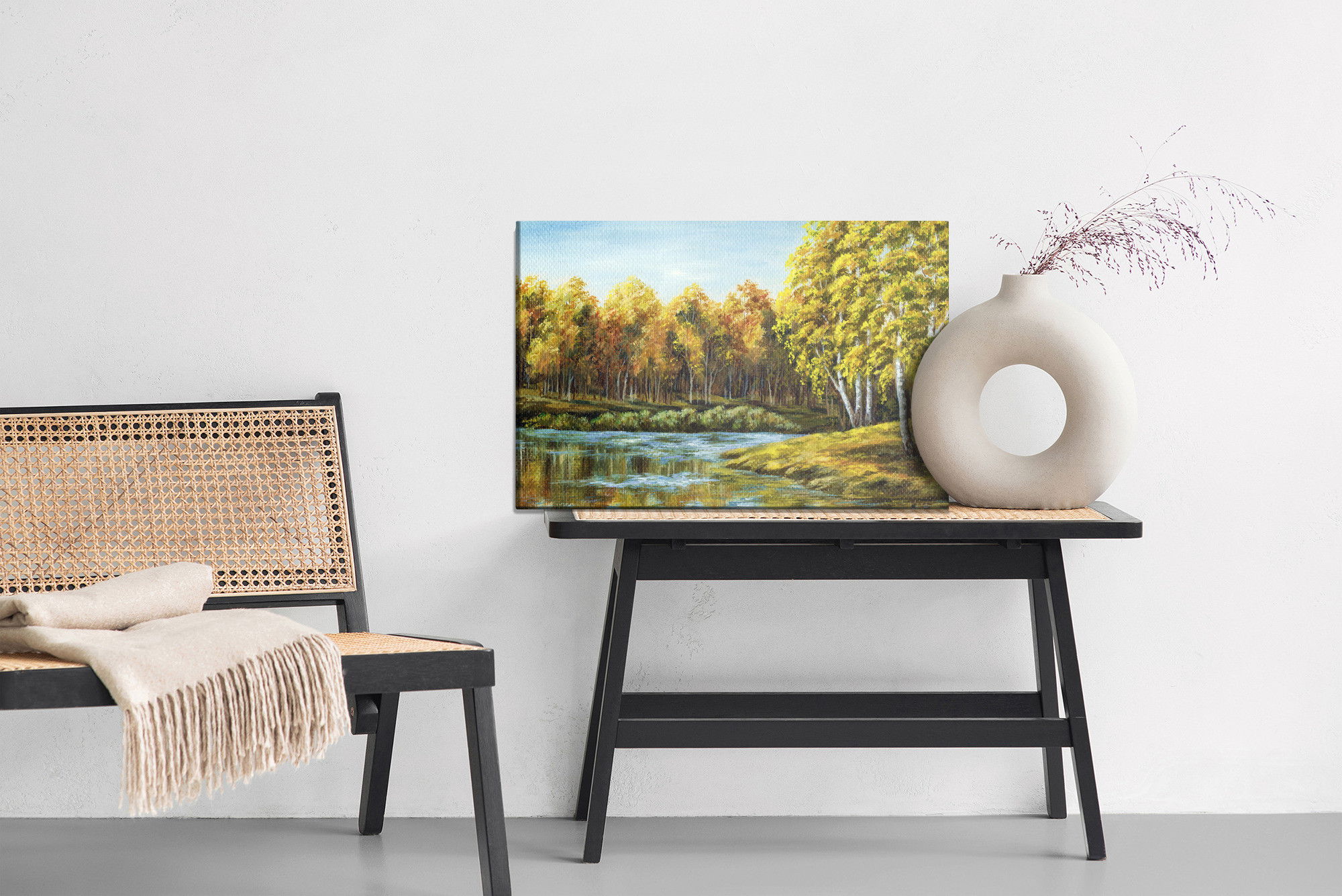 Varje tavla monteras på en massiv fururam. Format upp till 70×50 cm har en ram på 15 mm, medan format från 90×60 cm och uppåt har en ram på 20 mm. Den exakta dukspänningen gör att tavlan håller sin form över tid. Motivet Landscape with a lake trycks runt hela ramen vilket ger ett stilrent galleriuttryck där tavlan är lika vacker från sidan som framifrån. Kombinationen av rak dukspänning, rena linjer och korrekt tryck ger en professionell finish.