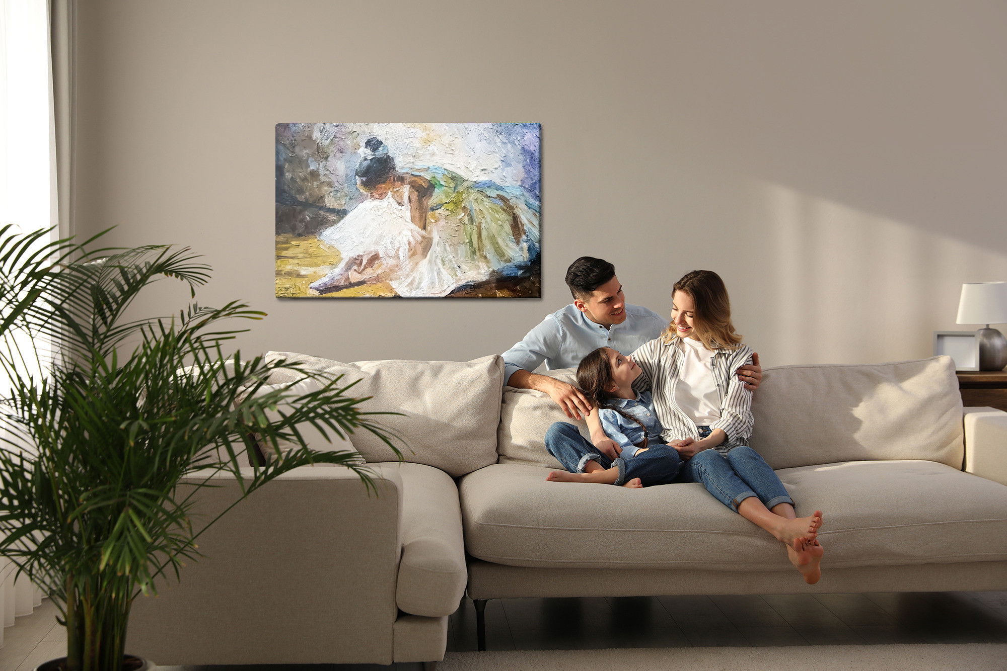 Varje tavla monteras på en massiv fururam. Format upp till 70×50 cm har en ram på 15 mm, medan format från 90×60 cm och uppåt har en ram på 20 mm. Den exakta dukspänningen gör att tavlan håller sin form över tid. Motivet Little girl, ballerina trycks runt hela ramen vilket ger ett stilrent galleriuttryck där tavlan är lika vacker från sidan som framifrån. Kombinationen av rak dukspänning, rena linjer och korrekt tryck ger en professionell finish.