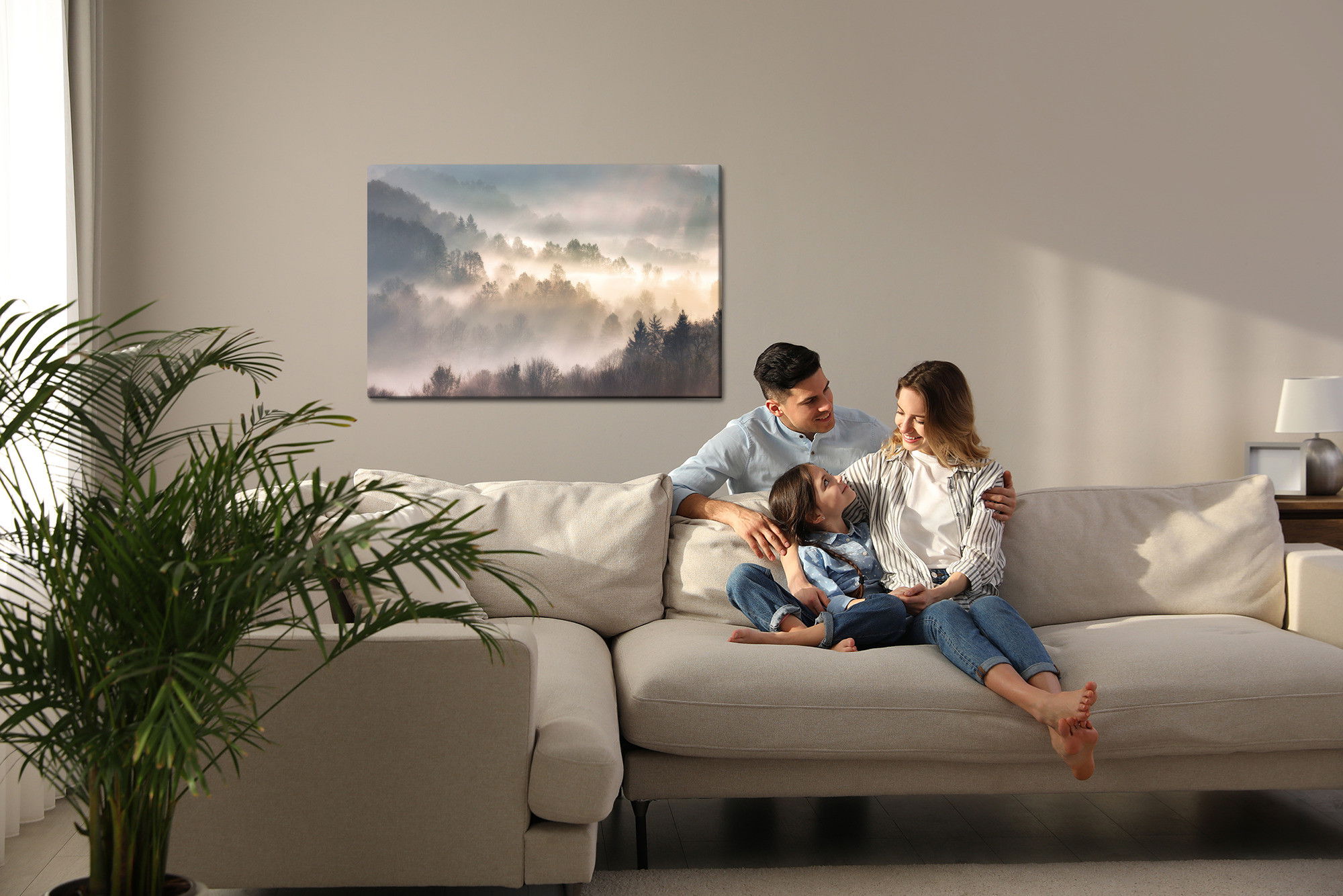 Varje tavla monteras på en massiv fururam. Format upp till 70×50 cm har en ram på 15 mm, medan format från 90×60 cm och uppåt har en ram på 20 mm. Den exakta dukspänningen gör att tavlan håller sin form över tid. Motivet Mist in forest with sunbeam trycks runt hela ramen vilket ger ett stilrent galleriuttryck där tavlan är lika vacker från sidan som framifrån. Kombinationen av rak dukspänning, rena linjer och korrekt tryck ger en professionell finish.