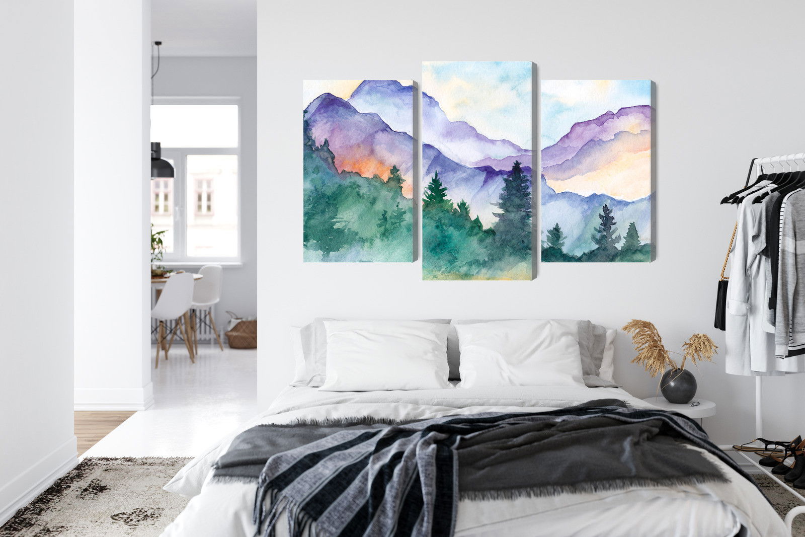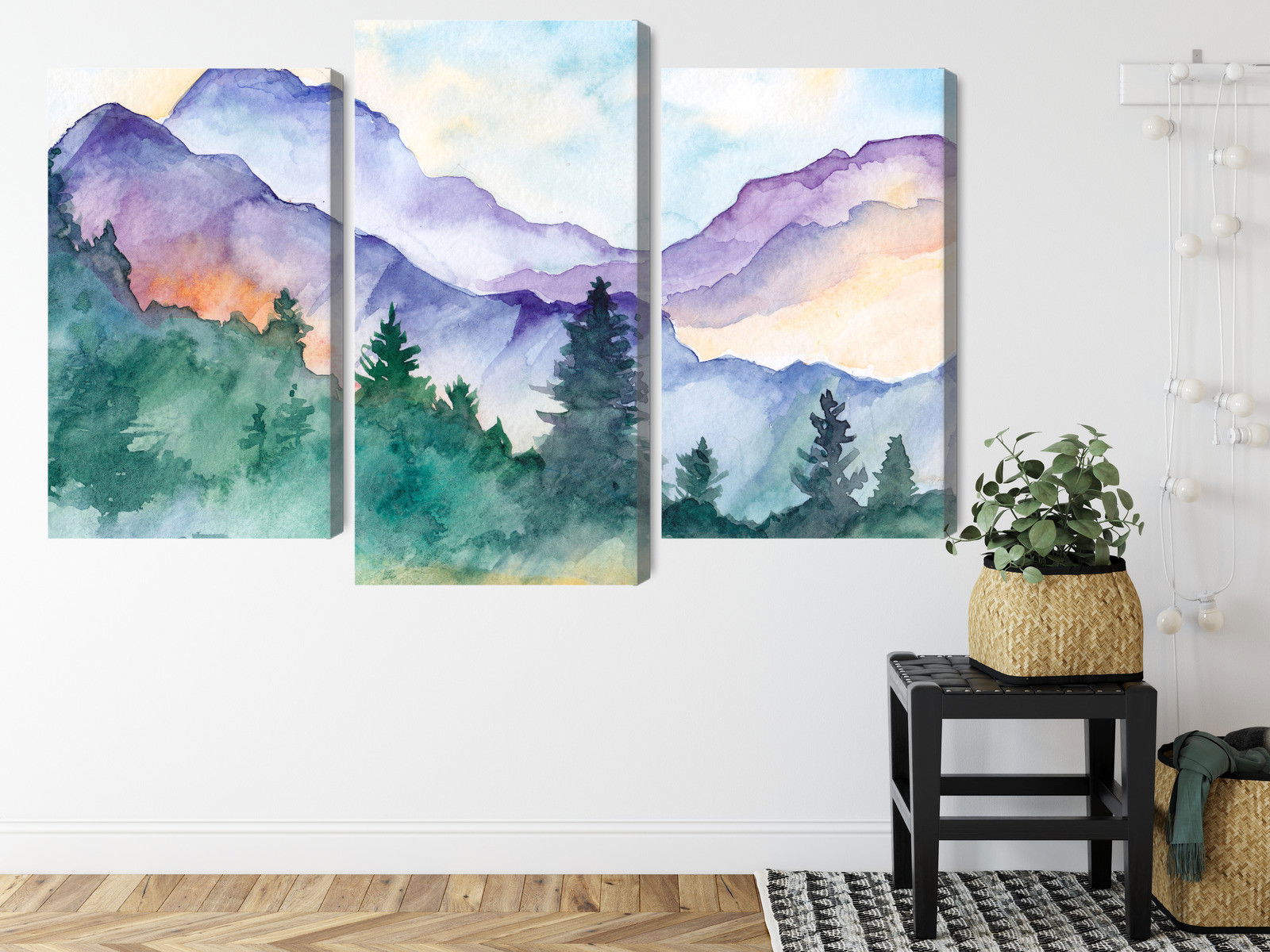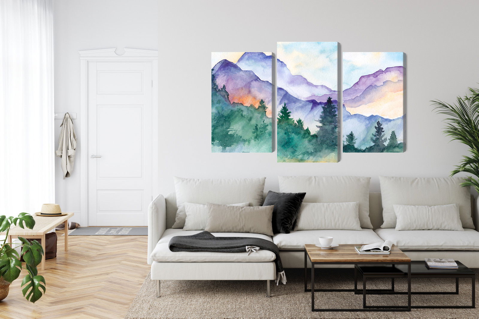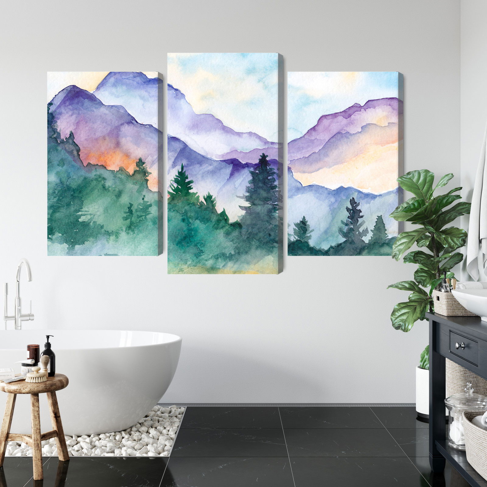 Varje tavla monteras på en massiv fururam. Format upp till 70×50 cm har en ram på 15 mm, medan format från 90×60 cm och uppåt har en ram på 20 mm. Den exakta dukspänningen gör att tavlan håller sin form över tid. Motivet Painted mountain landscape trycks runt hela ramen vilket ger ett stilrent galleriuttryck där tavlan är lika vacker från sidan som framifrån. Kombinationen av rak dukspänning, rena linjer och korrekt tryck ger en professionell finish.