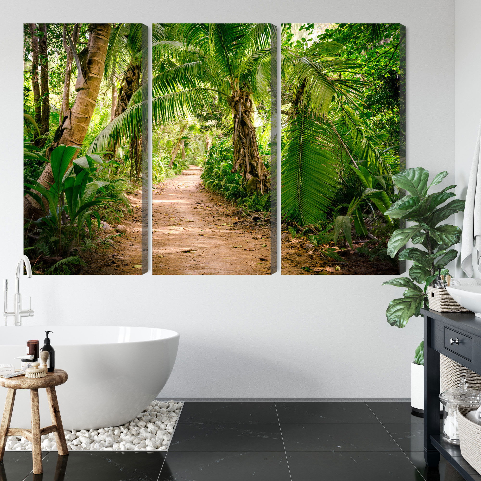 Varje tavla monteras på en massiv fururam. Format upp till 70×50 cm har en ram på 15 mm, medan format från 90×60 cm och uppåt har en ram på 20 mm. Den exakta dukspänningen gör att tavlan håller sin form över tid. Motivet Path in a tropical 3d forest trycks runt hela ramen vilket ger ett stilrent galleriuttryck där tavlan är lika vacker från sidan som framifrån. Kombinationen av rak dukspänning, rena linjer och korrekt tryck ger en professionell finish.