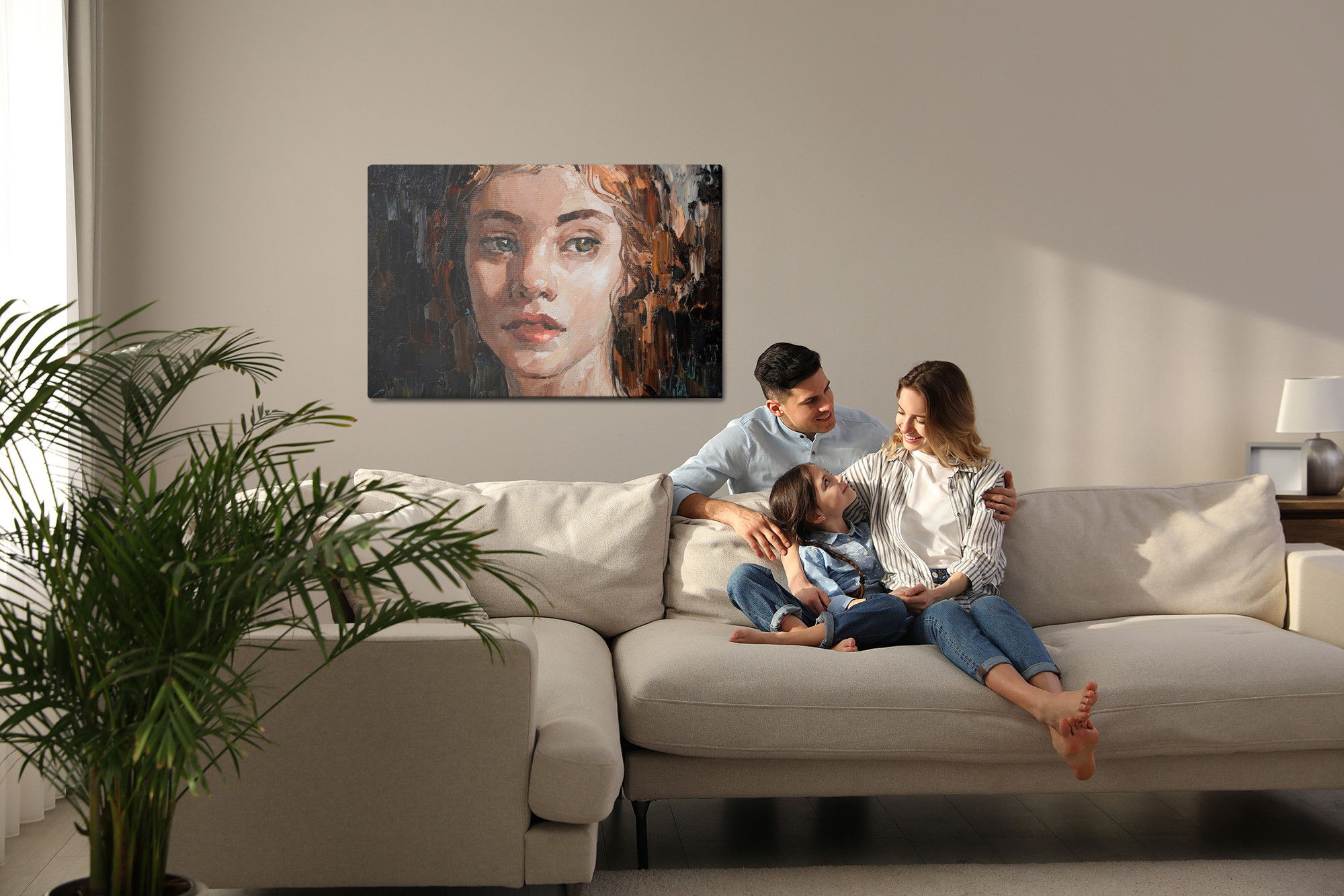 Varje tavla monteras på en massiv fururam. Format upp till 70×50 cm har en ram på 15 mm, medan format från 90×60 cm och uppåt har en ram på 20 mm. Den exakta dukspänningen gör att tavlan håller sin form över tid. Motivet Portrait of a young, dreamy trycks runt hela ramen vilket ger ett stilrent galleriuttryck där tavlan är lika vacker från sidan som framifrån. Kombinationen av rak dukspänning, rena linjer och korrekt tryck ger en professionell finish.