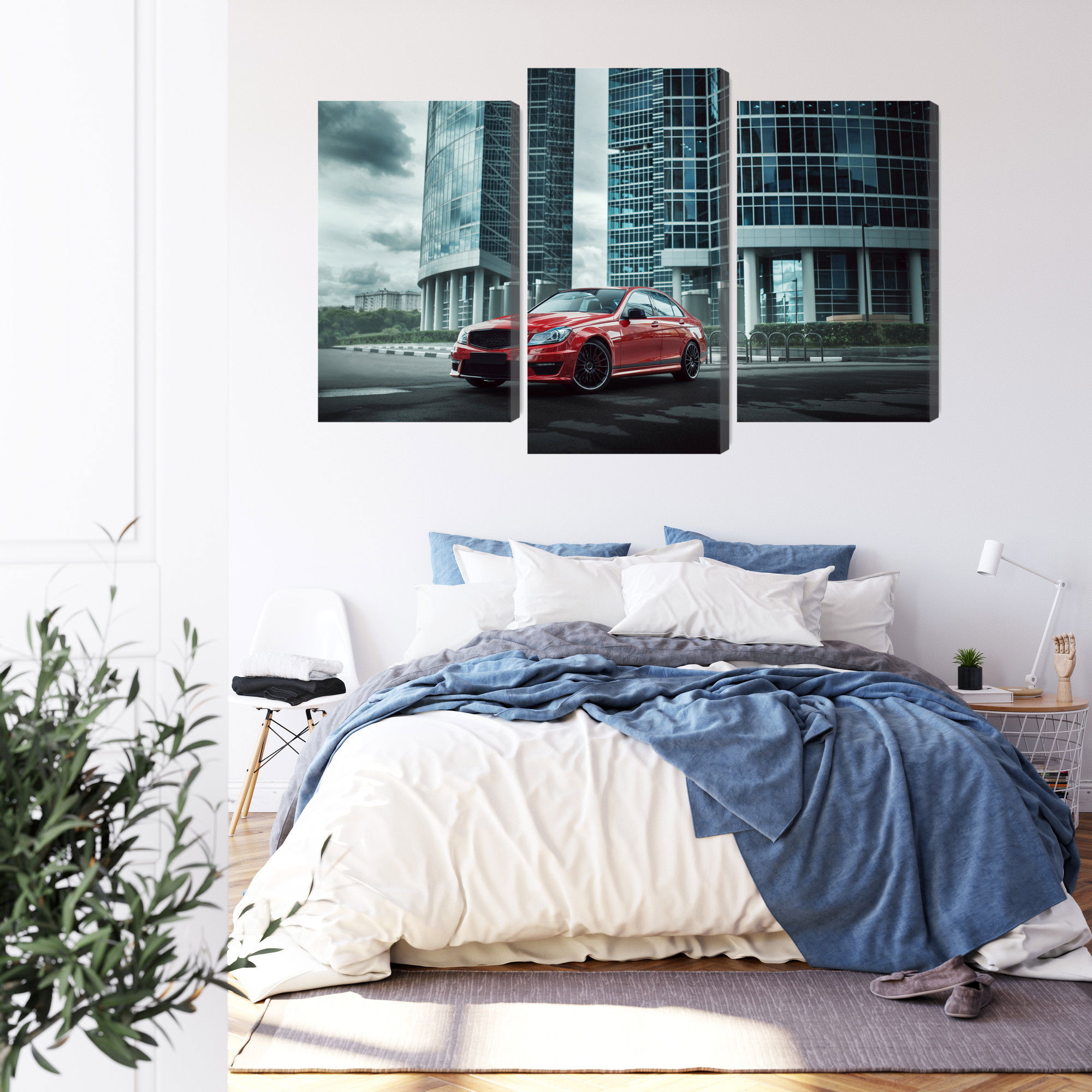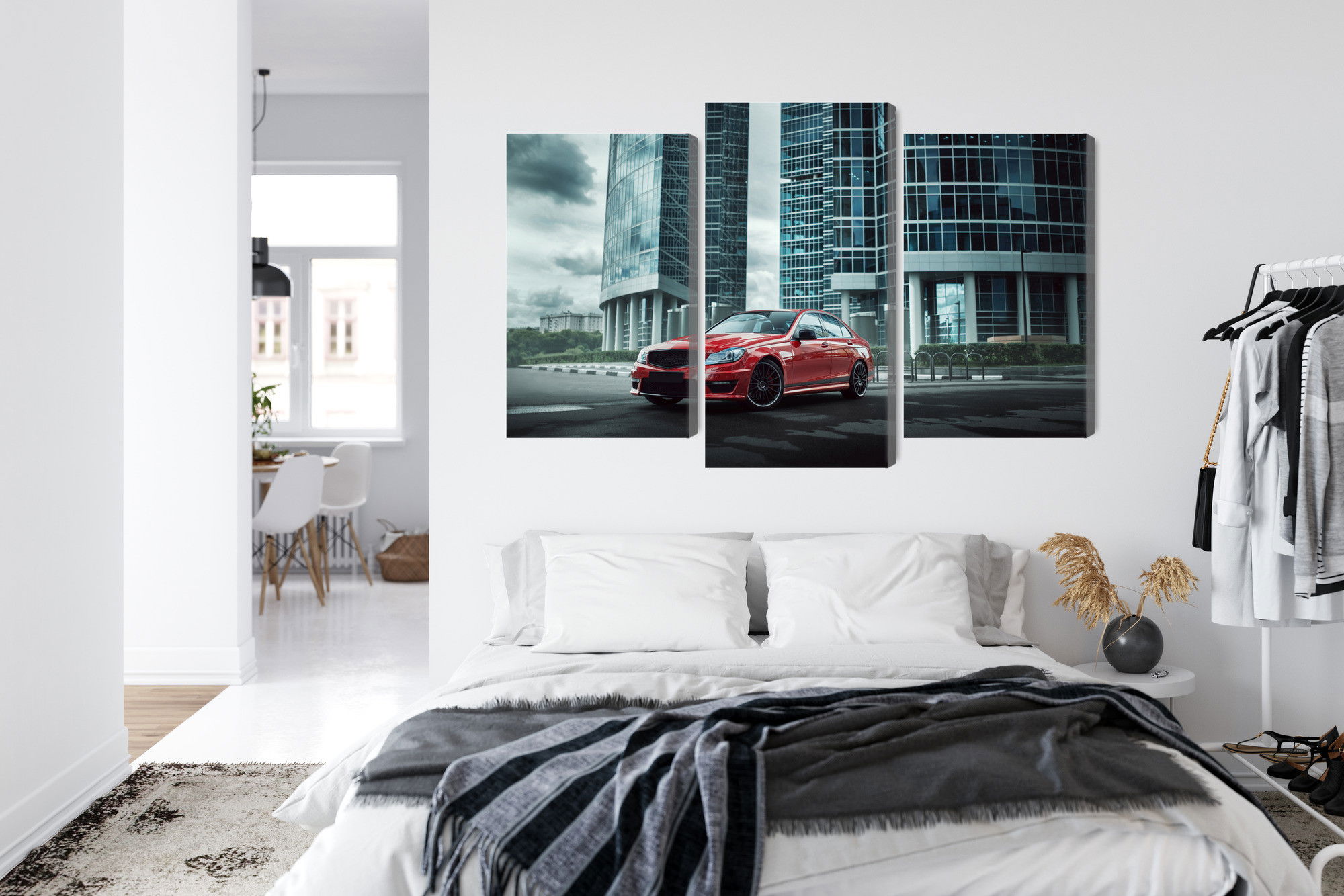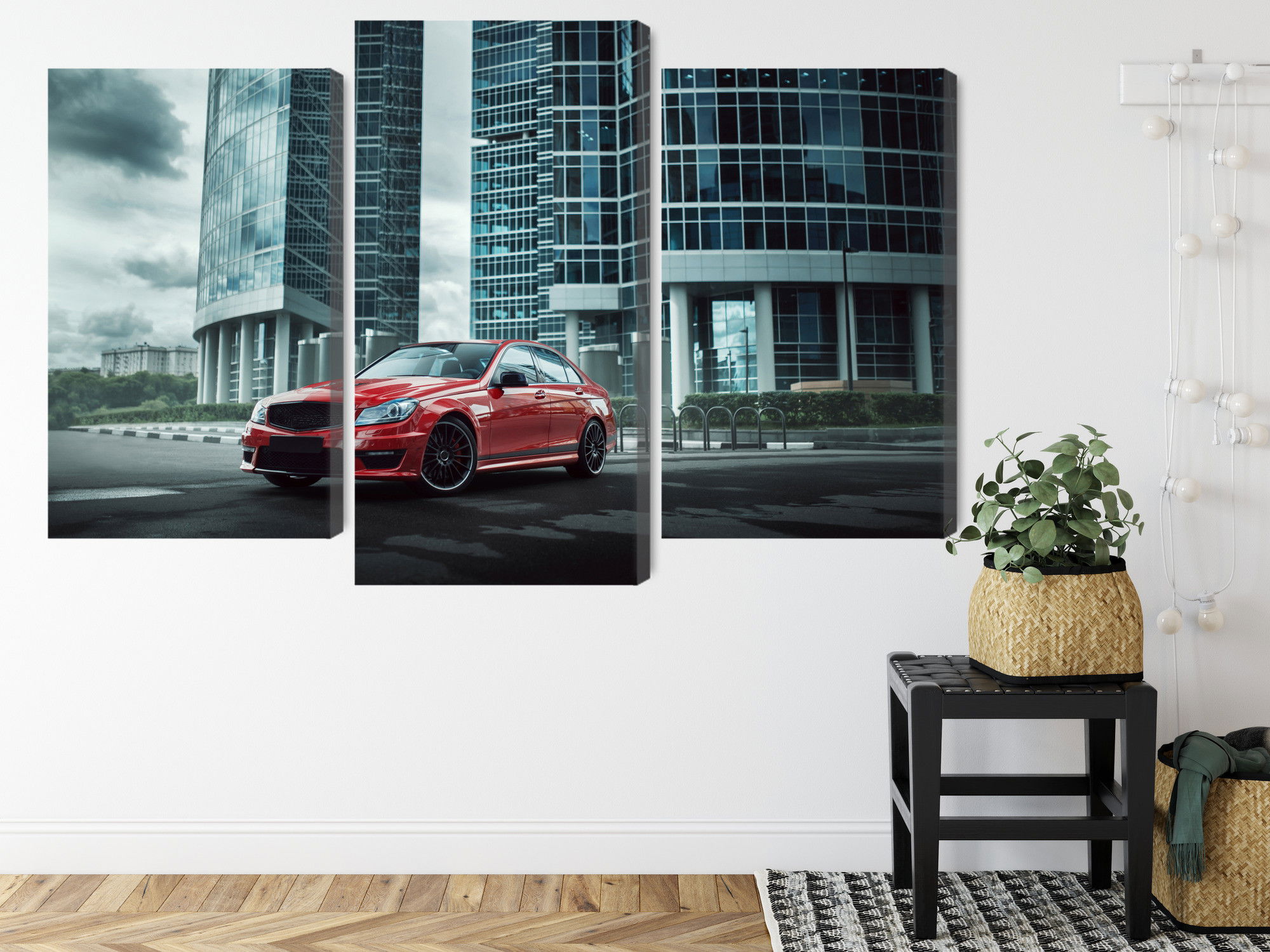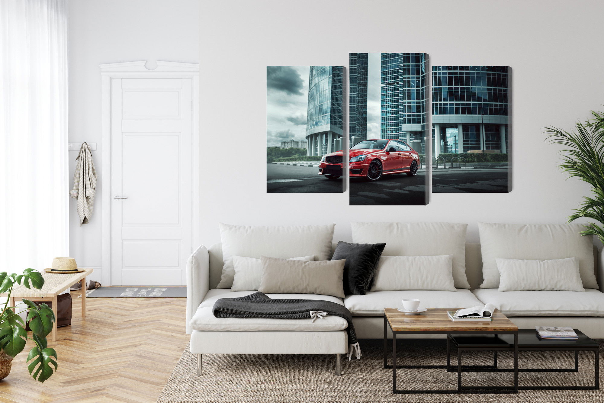 SilentDirects ljuddämpande tavla Red car on a background kombinerar ett högupplöst motiv med avancerad akustikteknik. Varje tavla monteras i Sverige och bygger på en stabil canvastavla med fururam, där insidan av ramen fylls med en ljudabsorberande kärna av återvunnen polyester. Konstruktionen gör tavlan till ett både estetiskt och funktionellt inslag i rummet.