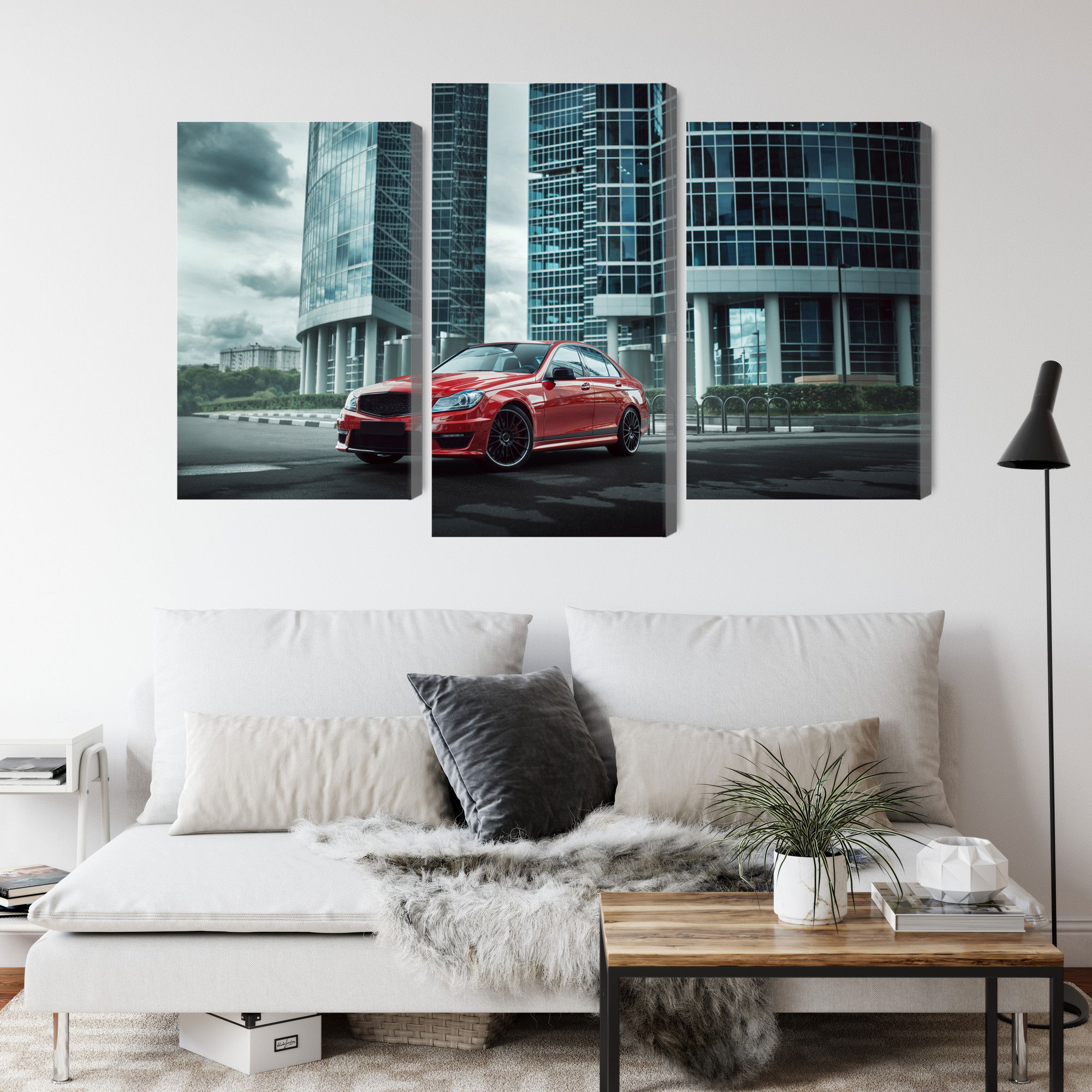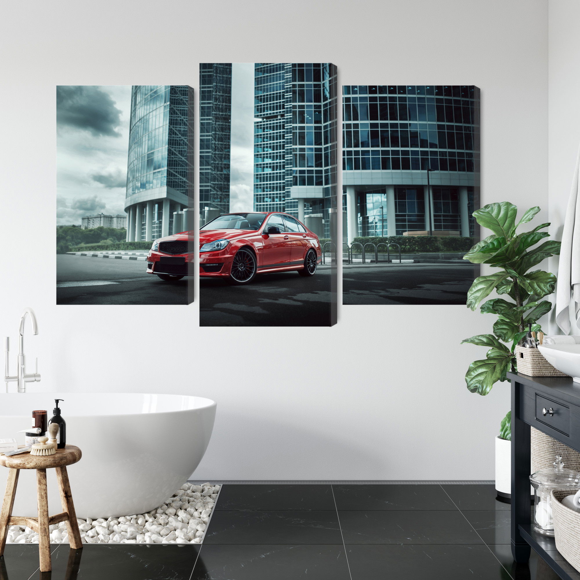Varje tavla monteras på en massiv fururam. Format upp till 70×50 cm har en ram på 15 mm, medan format från 90×60 cm och uppåt har en ram på 20 mm. Den exakta dukspänningen gör att tavlan håller sin form över tid. Motivet Red car on a background trycks runt hela ramen vilket ger ett stilrent galleriuttryck där tavlan är lika vacker från sidan som framifrån. Kombinationen av rak dukspänning, rena linjer och korrekt tryck ger en professionell finish.