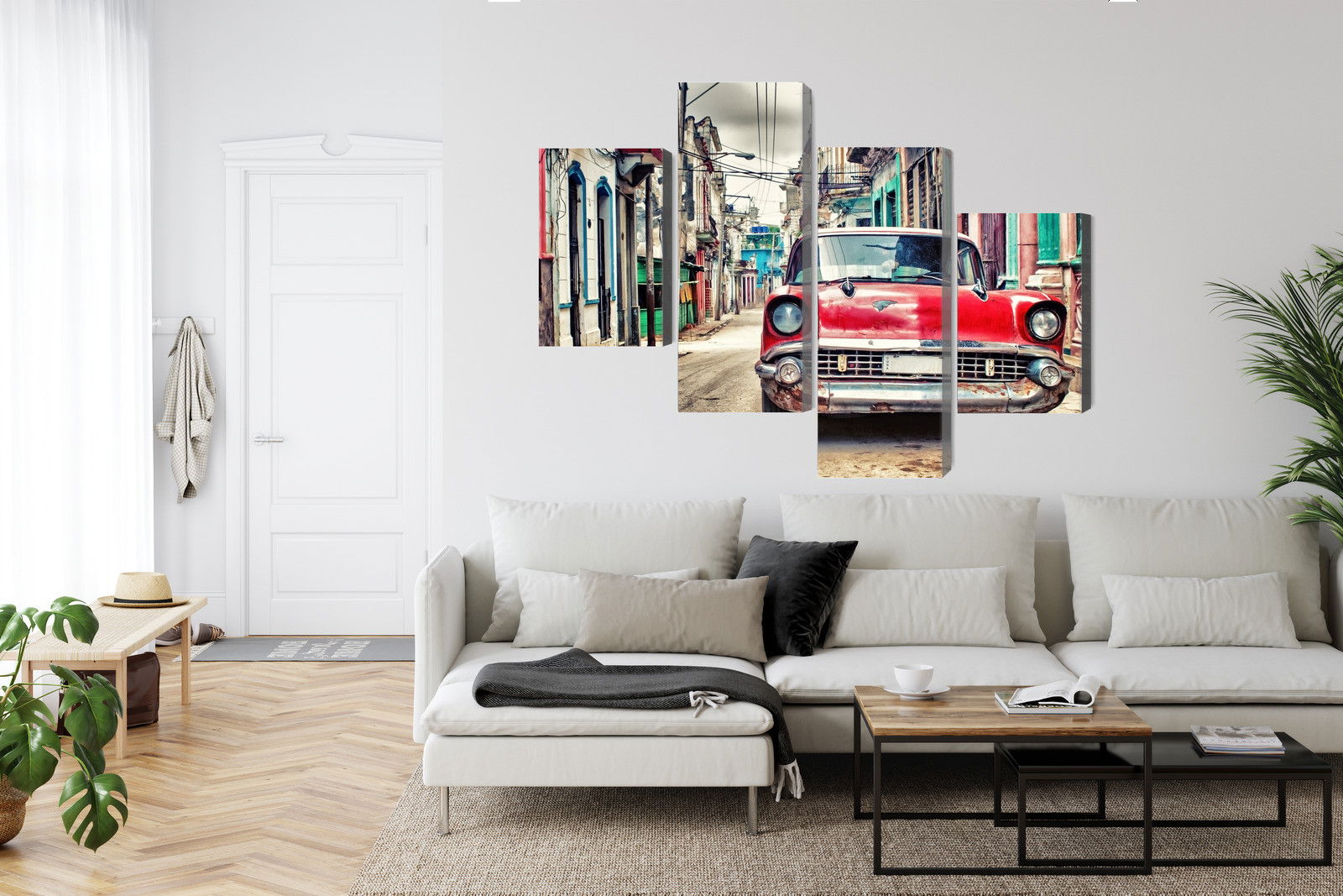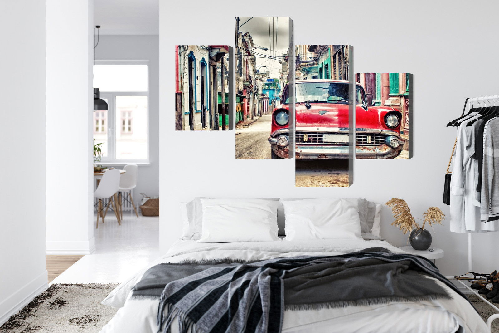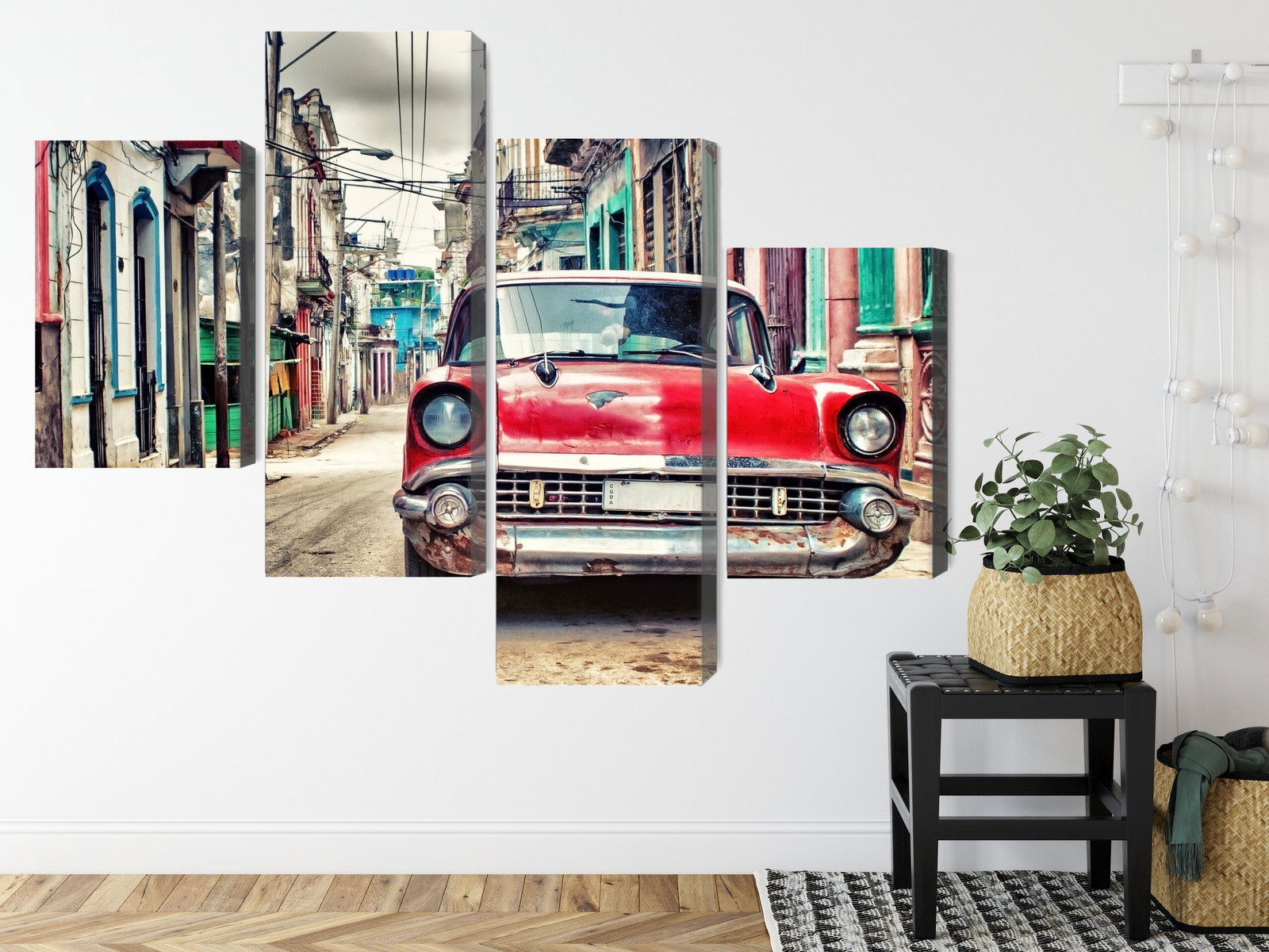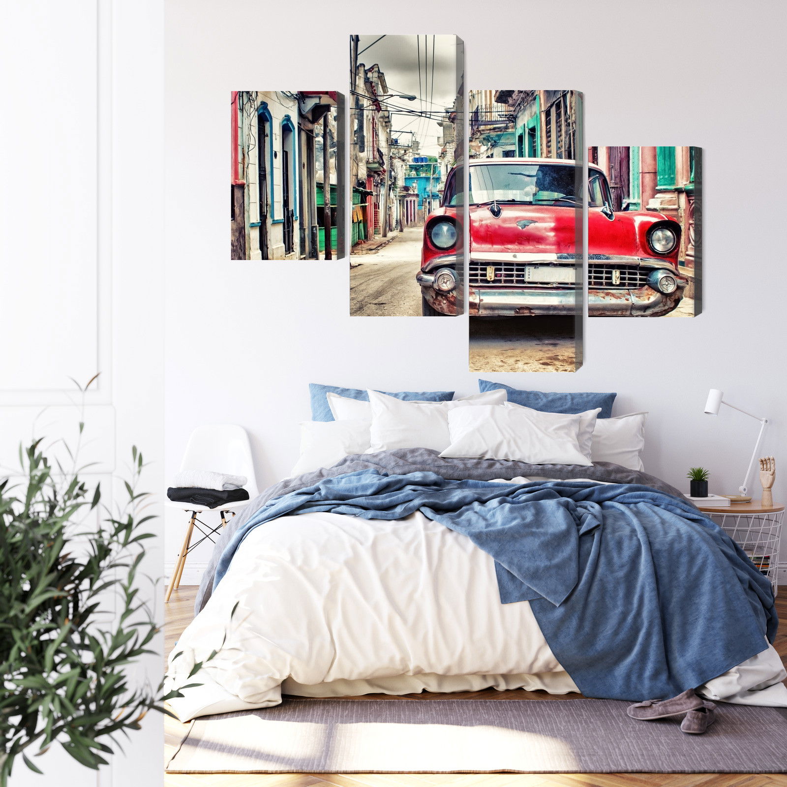 Varje tavla monteras på en massiv fururam. Format upp till 70×50 cm har en ram på 15 mm, medan format från 90×60 cm och uppåt har en ram på 20 mm. Den exakta dukspänningen gör att tavlan håller sin form över tid. Motivet Red chevrolet car in retro trycks runt hela ramen vilket ger ett stilrent galleriuttryck där tavlan är lika vacker från sidan som framifrån. Kombinationen av rak dukspänning, rena linjer och korrekt tryck ger en professionell finish.