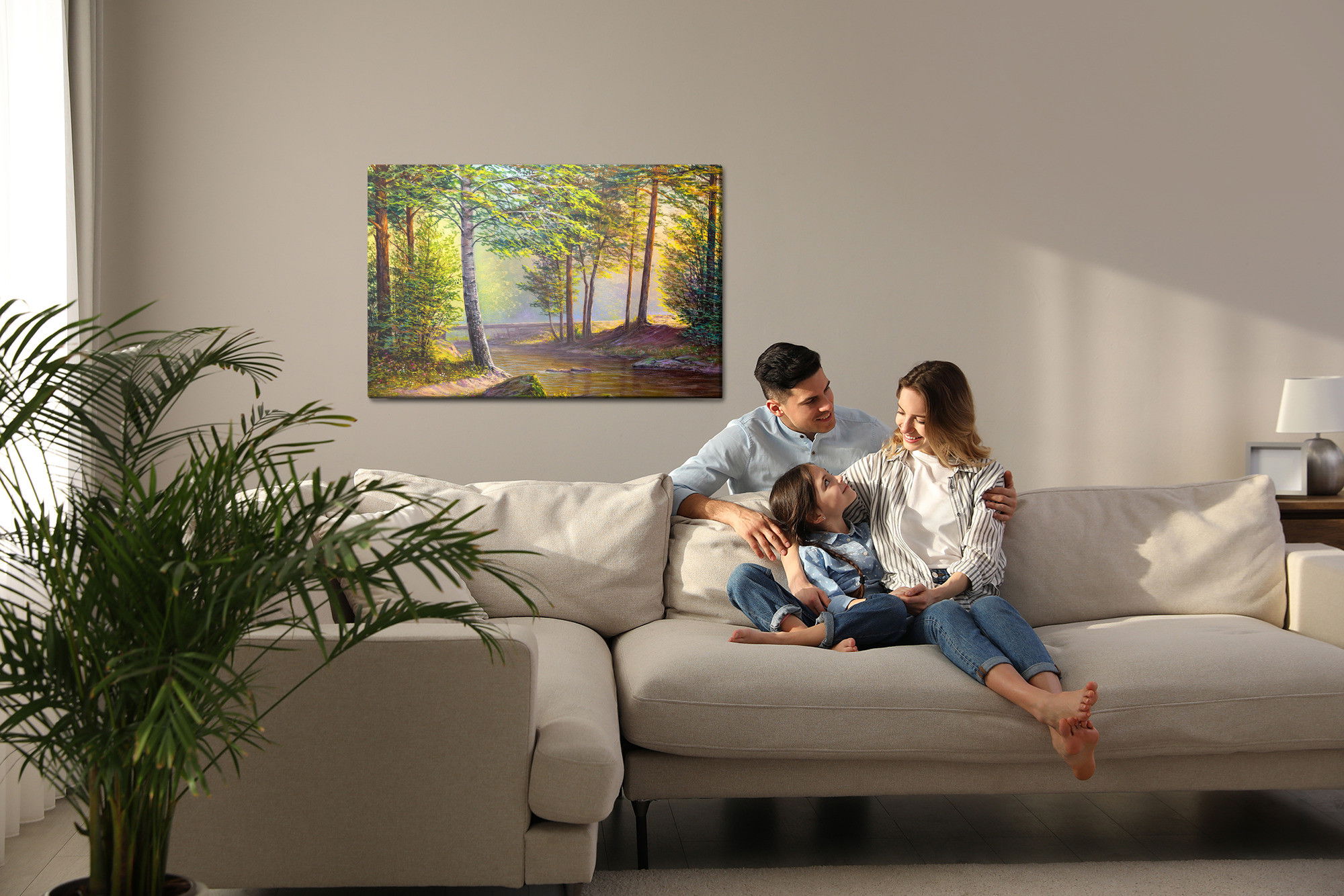 Motivet River in the summer forest återges med hög färgprecision och detaljrikedom tack vare HP Latex-teknologi. Trycket sker med vattenbaserade, luktfria och GREENGUARD Gold-certifierade bläck som ger en upplösning på upp till 300 DPI. Färgerna är UV-beständiga och behåller sin styrka även i ljusa rum, vilket gör tavlan lämplig för både hem- och offentliga miljöer.