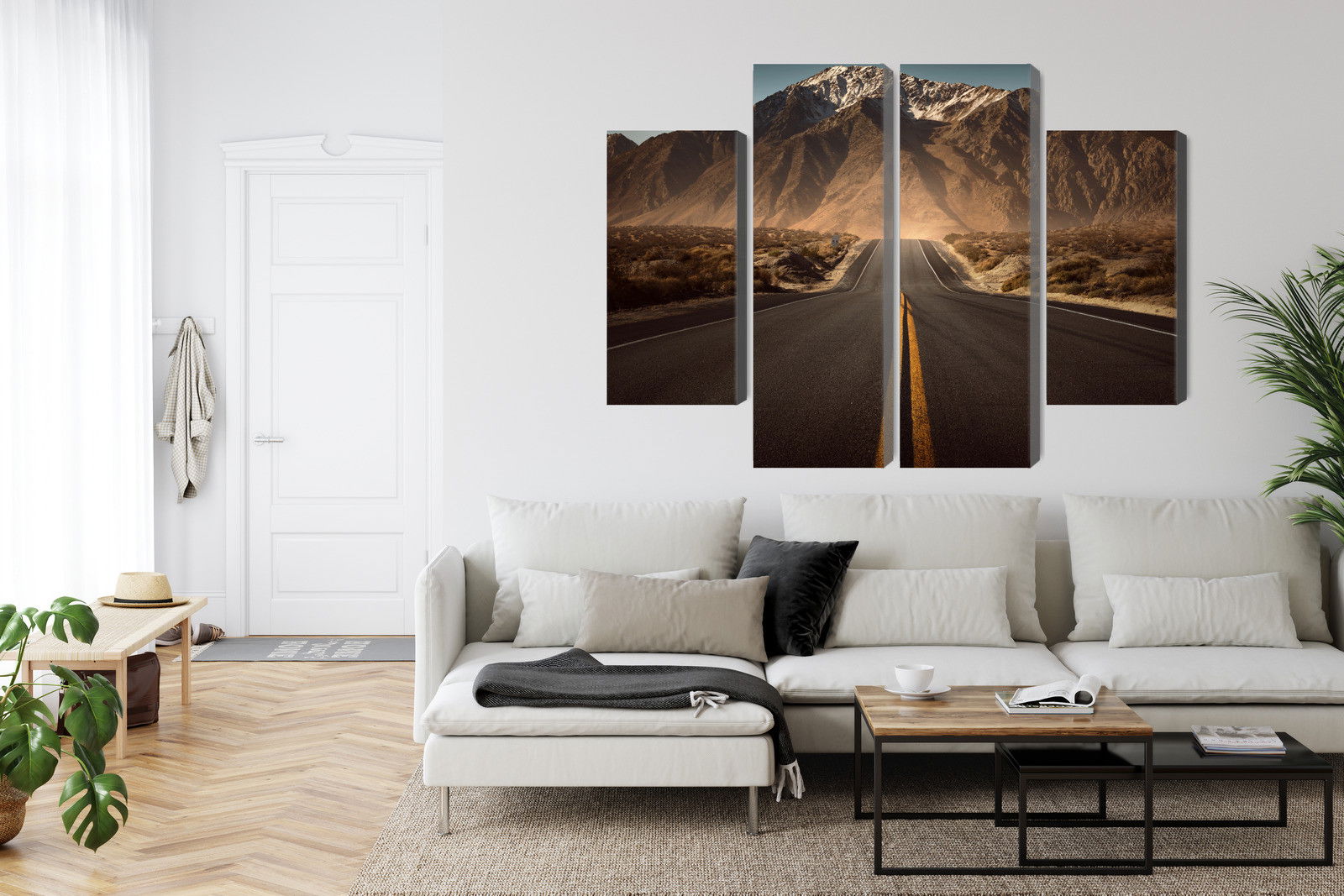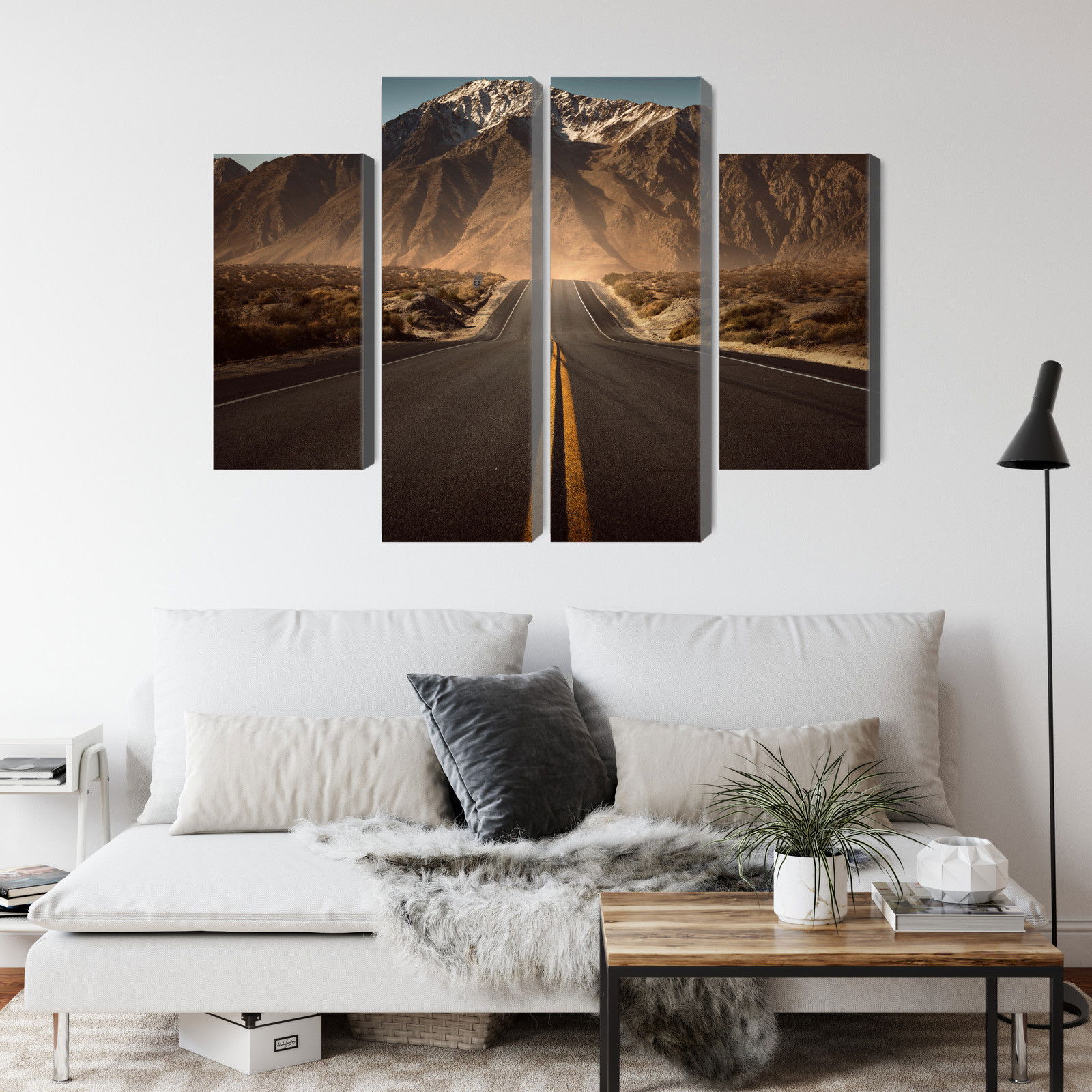 Varje tavla monteras på en massiv fururam. Format upp till 70×50 cm har en ram på 15 mm, medan format från 90×60 cm och uppåt har en ram på 20 mm. Den exakta dukspänningen gör att tavlan håller sin form över tid. Motivet Road to the mountains 3d trycks runt hela ramen vilket ger ett stilrent galleriuttryck där tavlan är lika vacker från sidan som framifrån. Kombinationen av rak dukspänning, rena linjer och korrekt tryck ger en professionell finish.