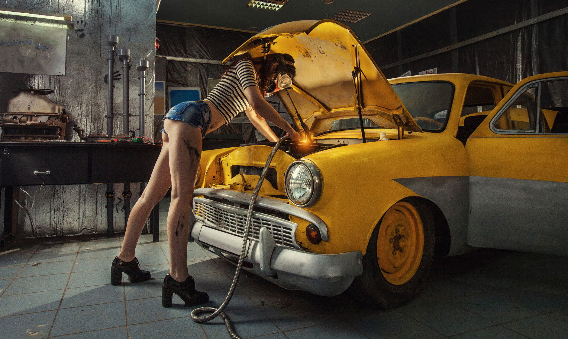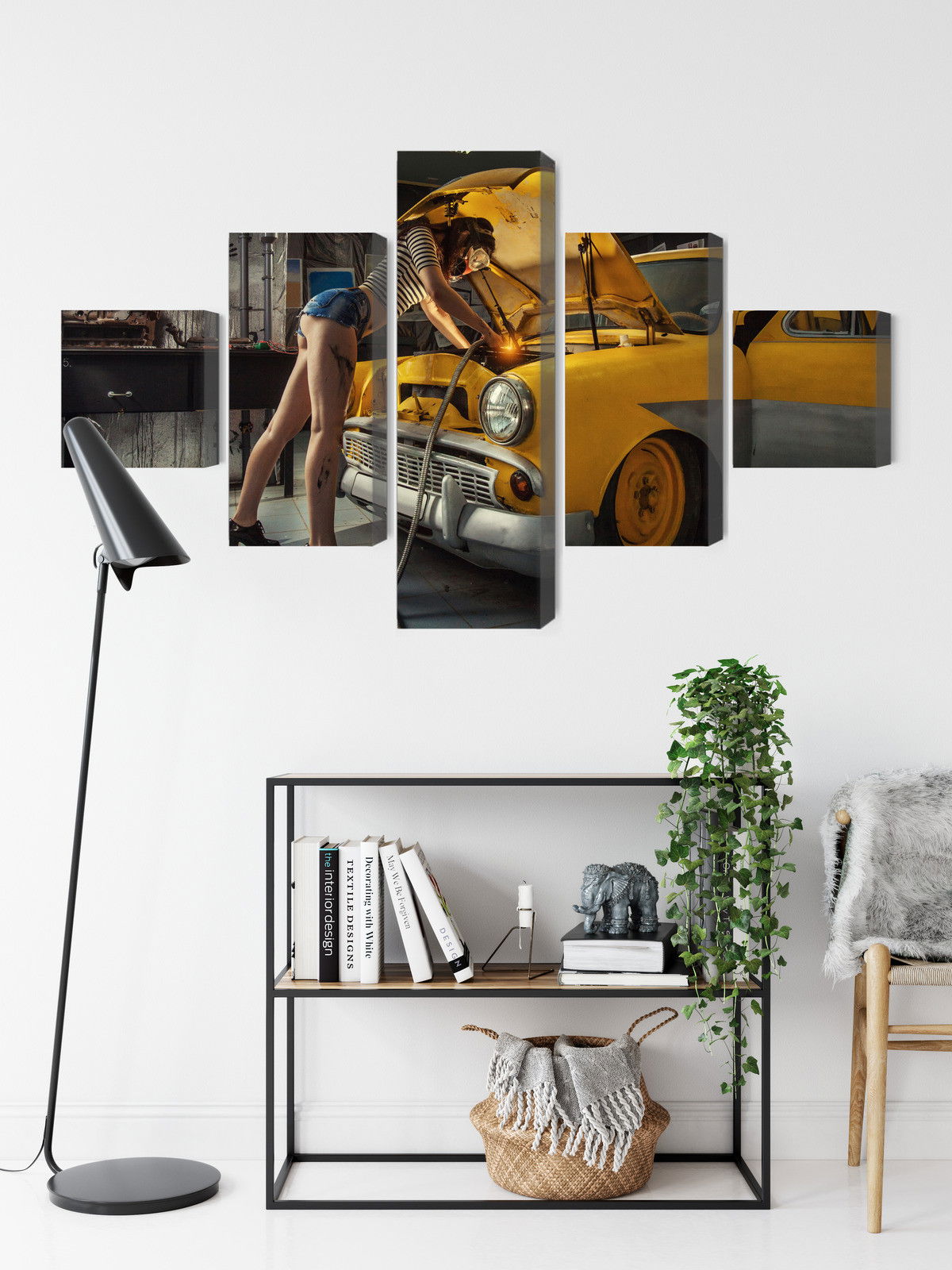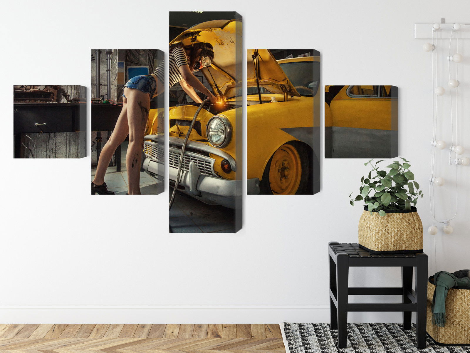 Ljuddämpande tavla – Sexy woman welded to a car för lugnare rum och mjukare akustik