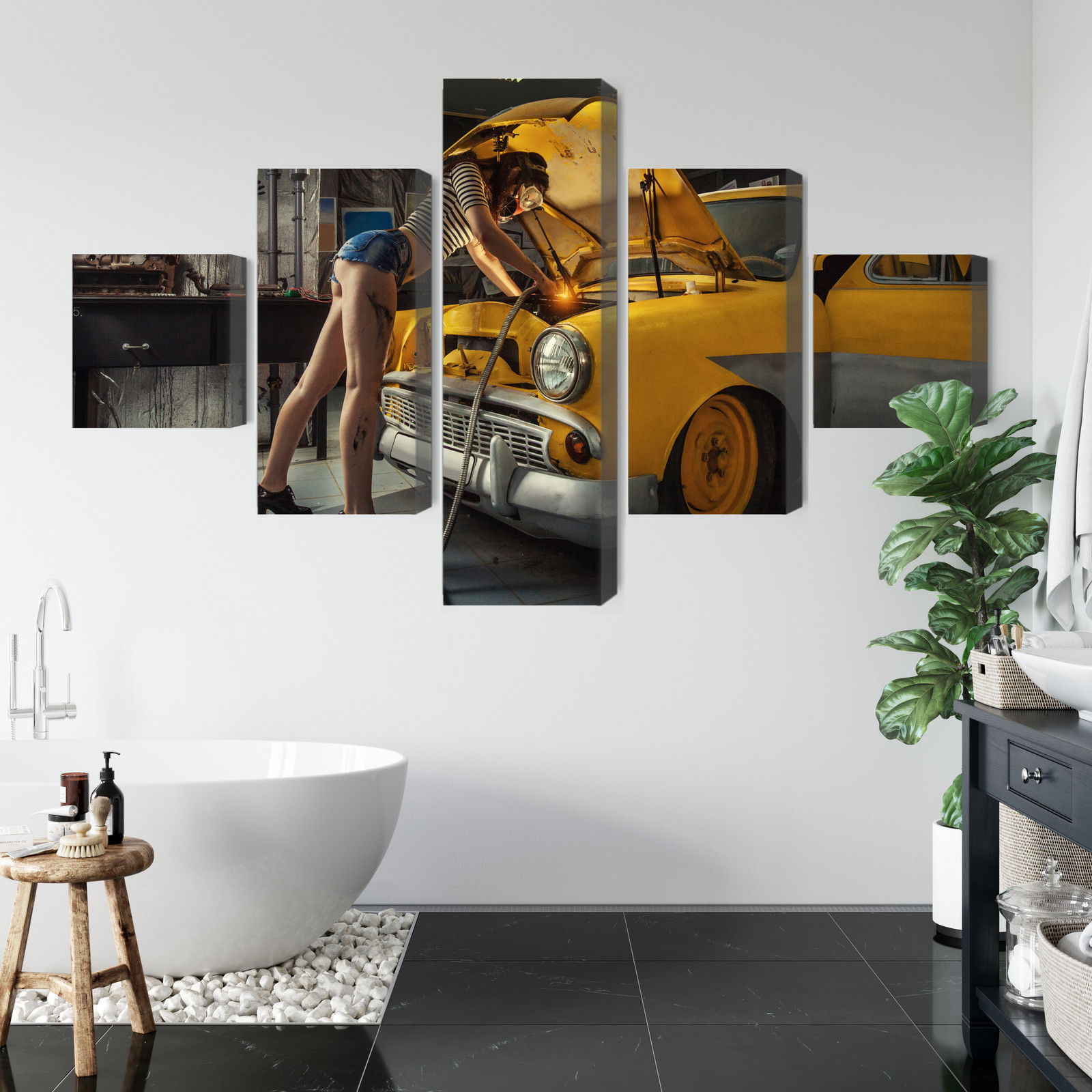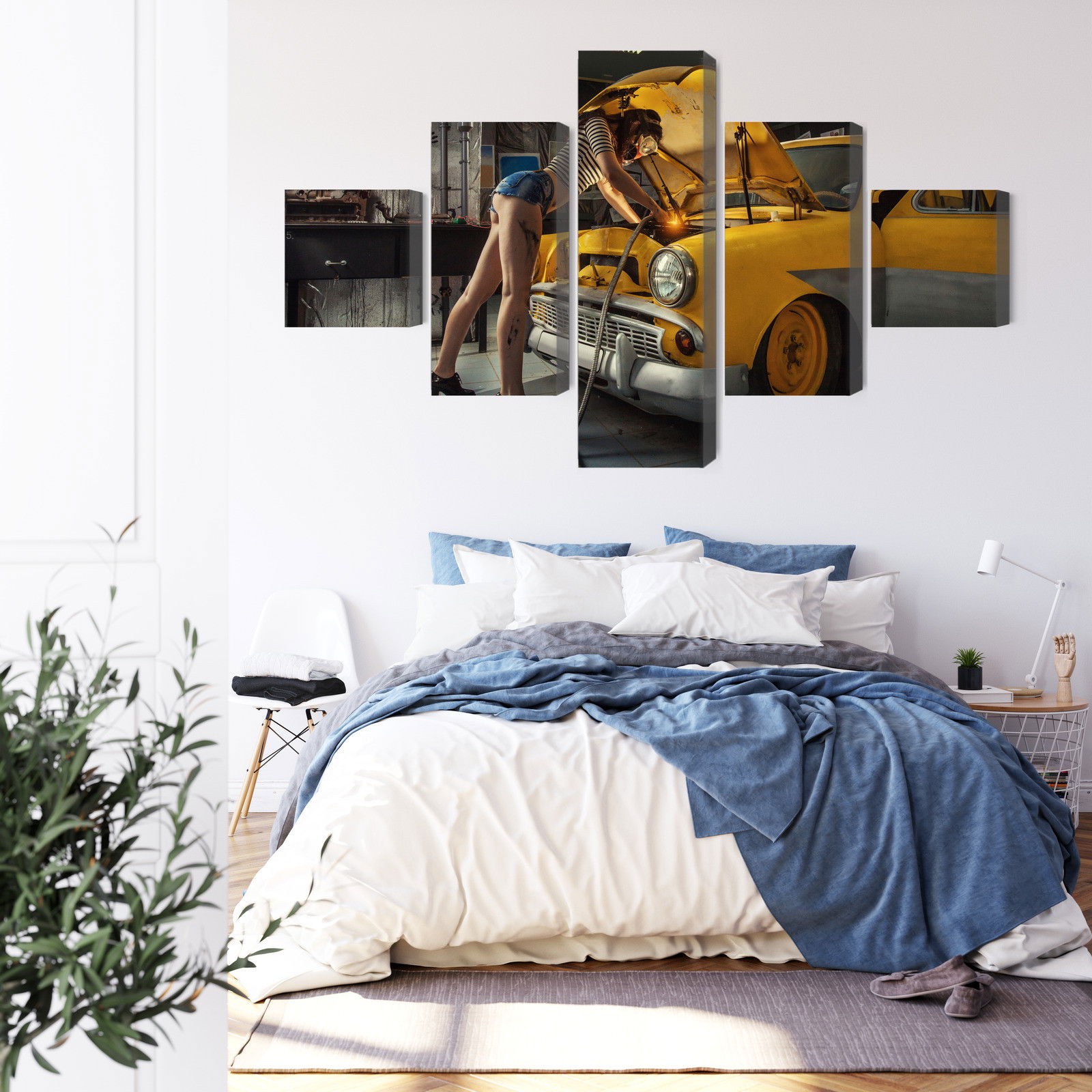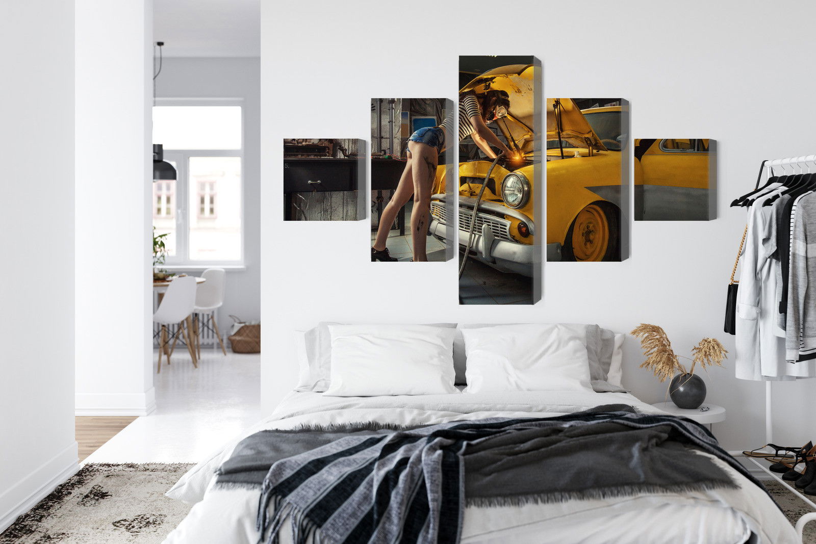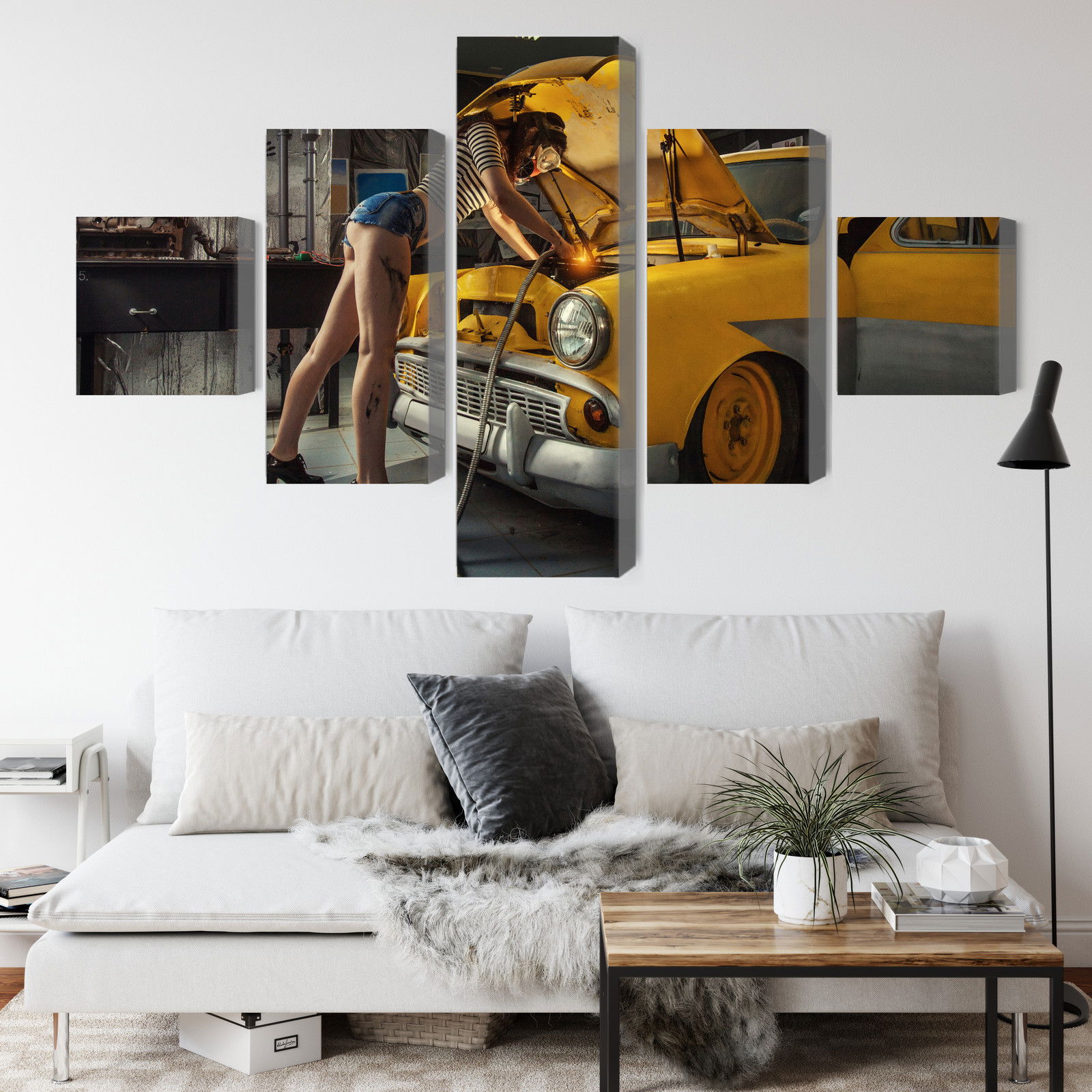 Ljuddämpande tavla – Sexy woman welded to a car för lugnare rum och mjukare akustik