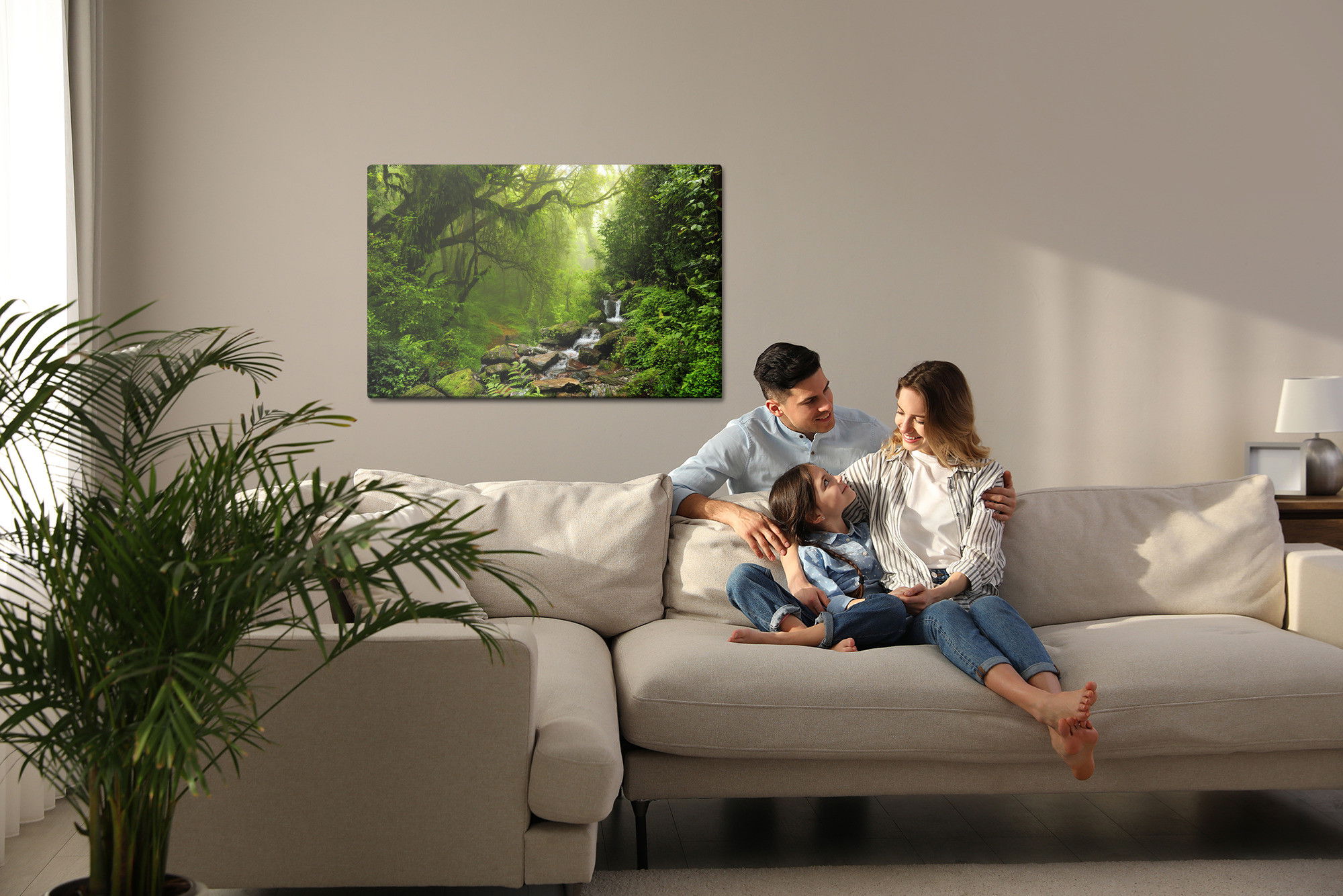 Varje tavla monteras på en massiv fururam. Format upp till 70×50 cm har en ram på 15 mm, medan format från 90×60 cm och uppåt har en ram på 20 mm. Den exakta dukspänningen gör att tavlan håller sin form över tid. Motivet Subtropical forest in Nepal trycks runt hela ramen vilket ger ett stilrent galleriuttryck där tavlan är lika vacker från sidan som framifrån. Kombinationen av rak dukspänning, rena linjer och korrekt tryck ger en professionell finish.