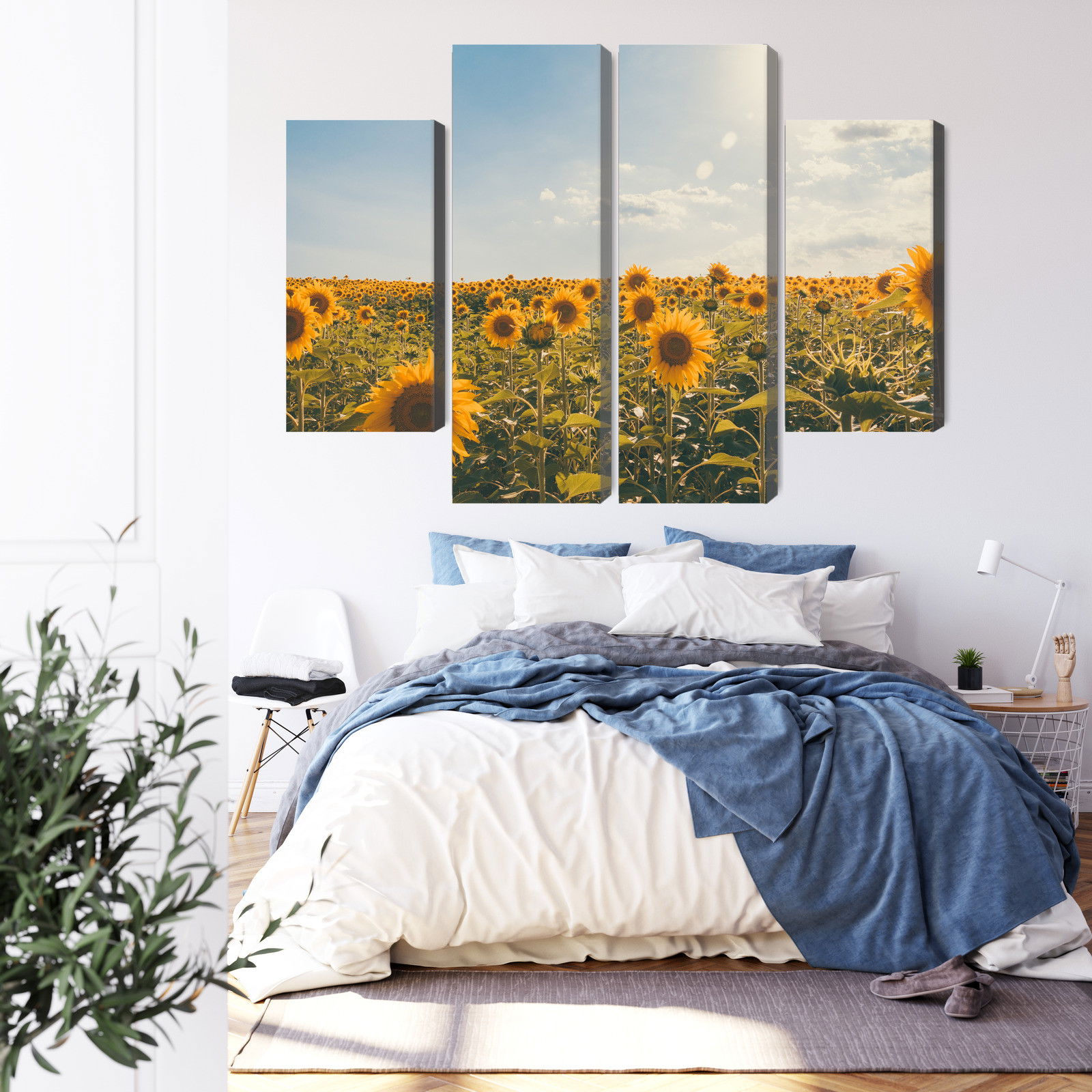 Varje tavla monteras på en massiv fururam. Format upp till 70×50 cm har en ram på 15 mm, medan format från 90×60 cm och uppåt har en ram på 20 mm. Den exakta dukspänningen gör att tavlan håller sin form över tid. Motivet Sunflower field on a summer trycks runt hela ramen vilket ger ett stilrent galleriuttryck där tavlan är lika vacker från sidan som framifrån. Kombinationen av rak dukspänning, rena linjer och korrekt tryck ger en professionell finish.