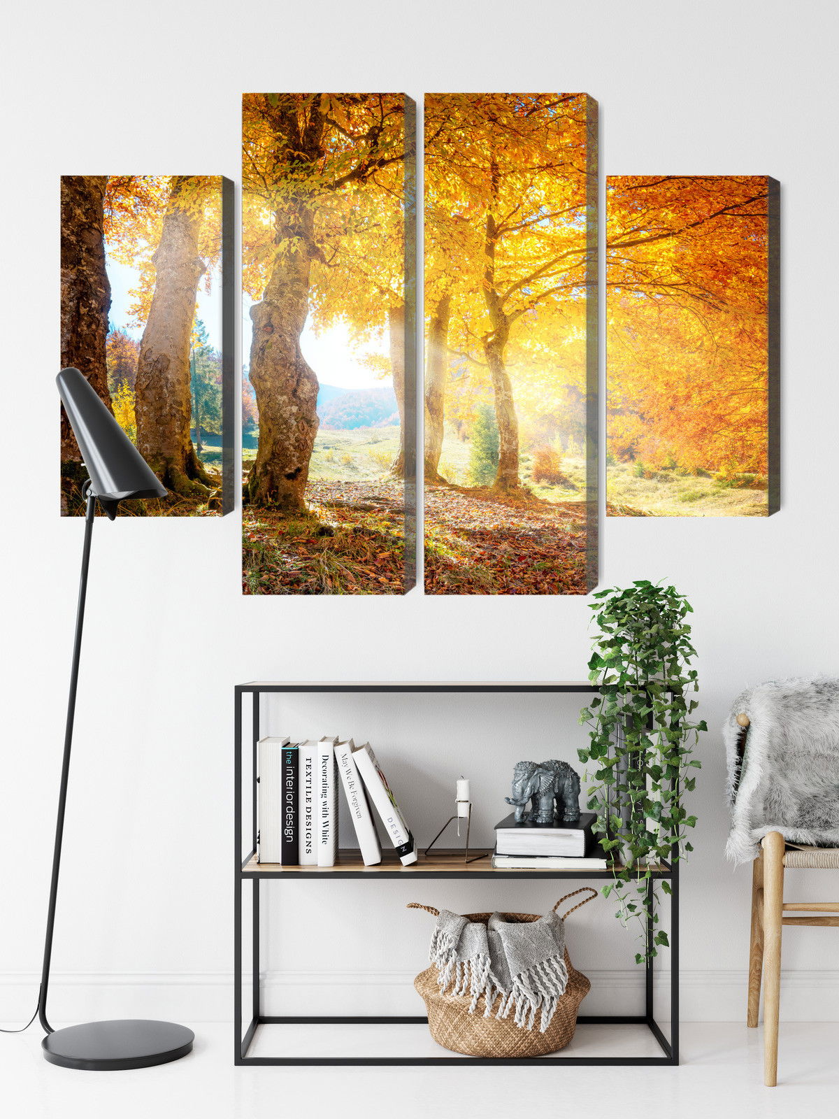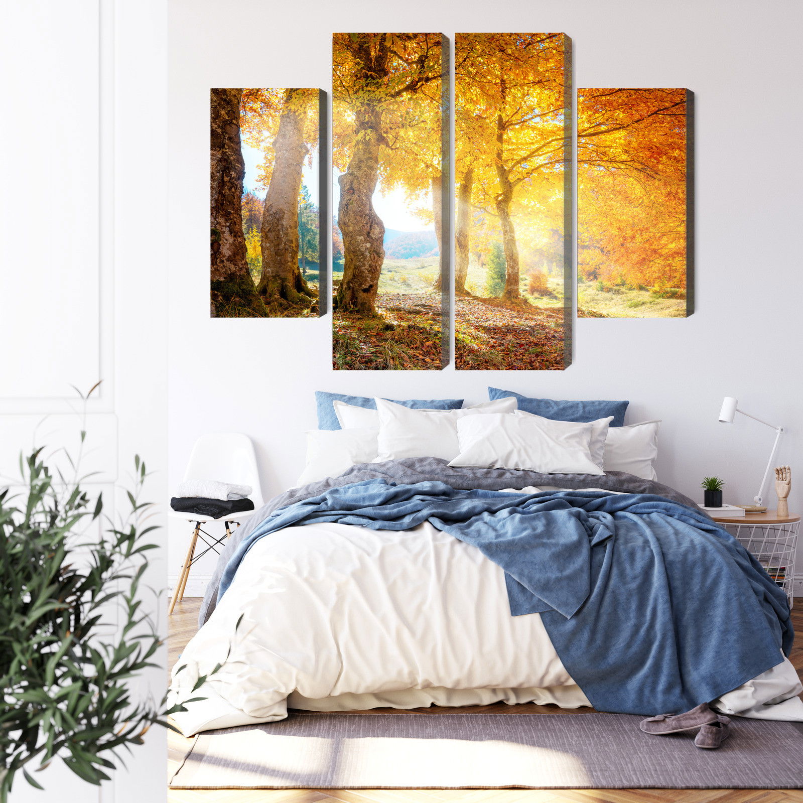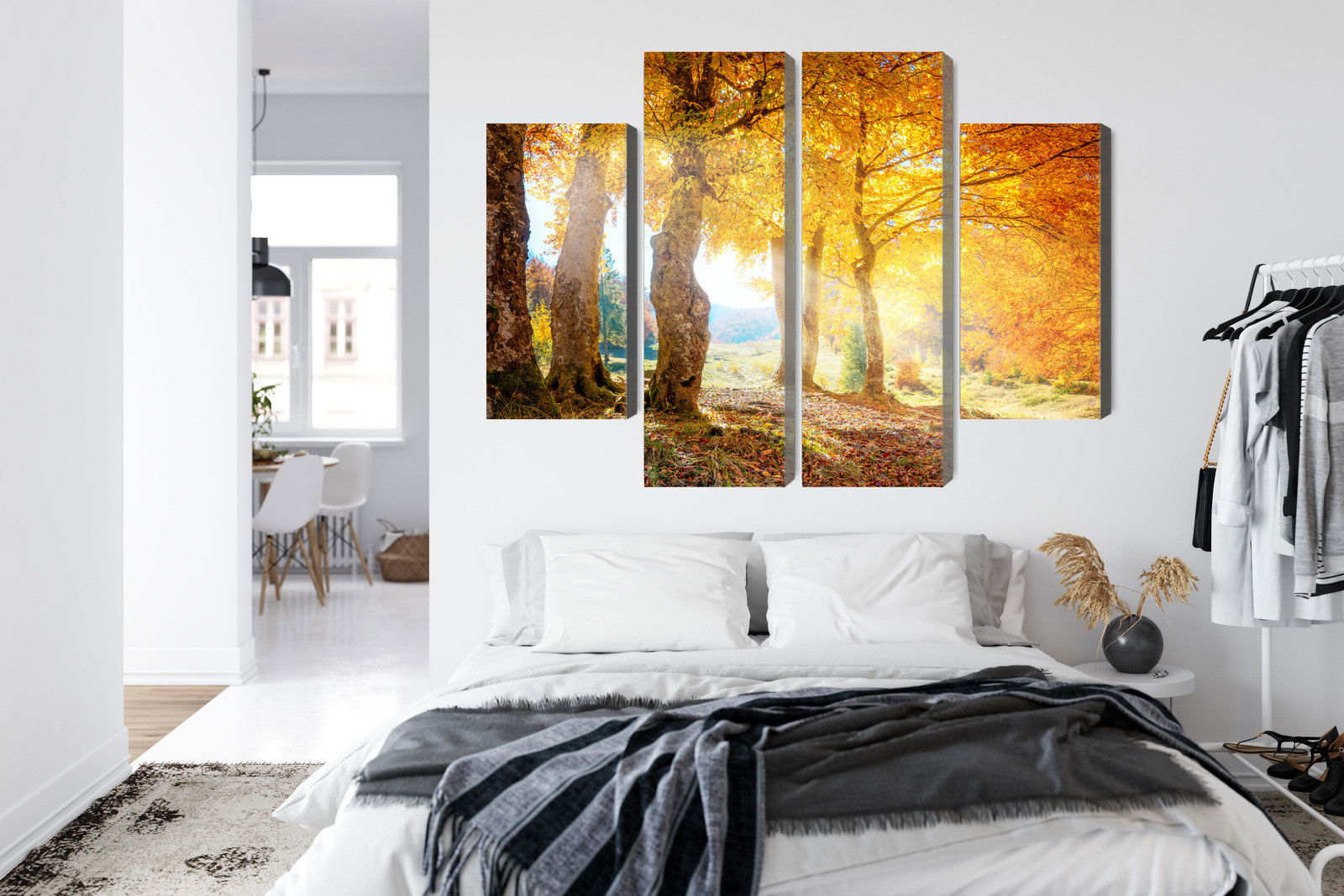 SilentDirects ljuddämpande tavla Sunny autumn forest kombinerar ett högupplöst motiv med avancerad akustikteknik. Varje tavla monteras i Sverige och bygger på en stabil canvastavla med fururam, där insidan av ramen fylls med en ljudabsorberande kärna av återvunnen polyester. Konstruktionen gör tavlan till ett både estetiskt och funktionellt inslag i rummet.