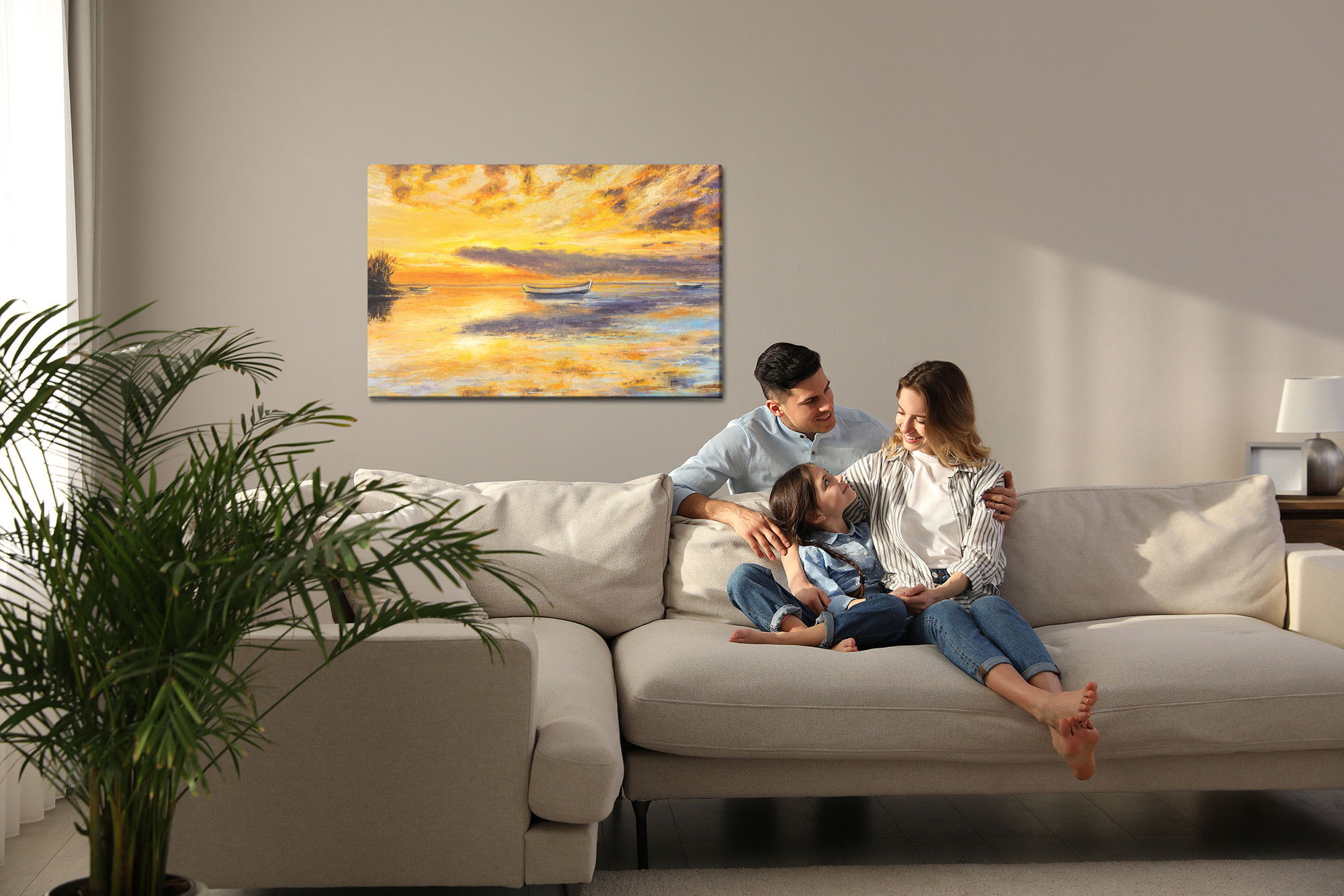 Motivet Sunset on a calm sea återges med hög färgprecision och detaljrikedom tack vare HP Latex-teknologi. Trycket sker med vattenbaserade, luktfria och GREENGUARD Gold-certifierade bläck som ger en upplösning på upp till 300 DPI. Färgerna är UV-beständiga och behåller sin styrka även i ljusa rum, vilket gör tavlan lämplig för både hem- och offentliga miljöer.