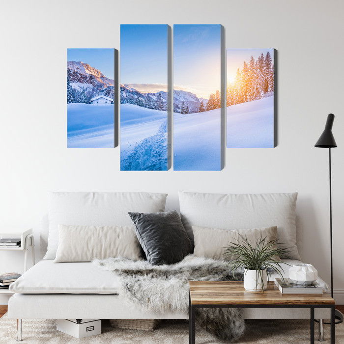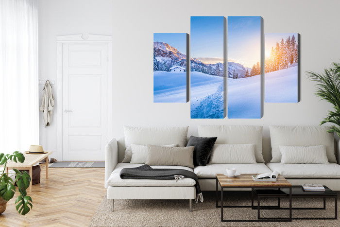 Varje tavla monteras på en massiv fururam. Format upp till 70×50 cm har en ram på 15 mm, medan format från 90×60 cm och uppåt har en ram på 20 mm. Den exakta dukspänningen gör att tavlan håller sin form över tid. Motivet The alps at winter time 3d trycks runt hela ramen vilket ger ett stilrent galleriuttryck där tavlan är lika vacker från sidan som framifrån. Kombinationen av rak dukspänning, rena linjer och korrekt tryck ger en professionell finish.