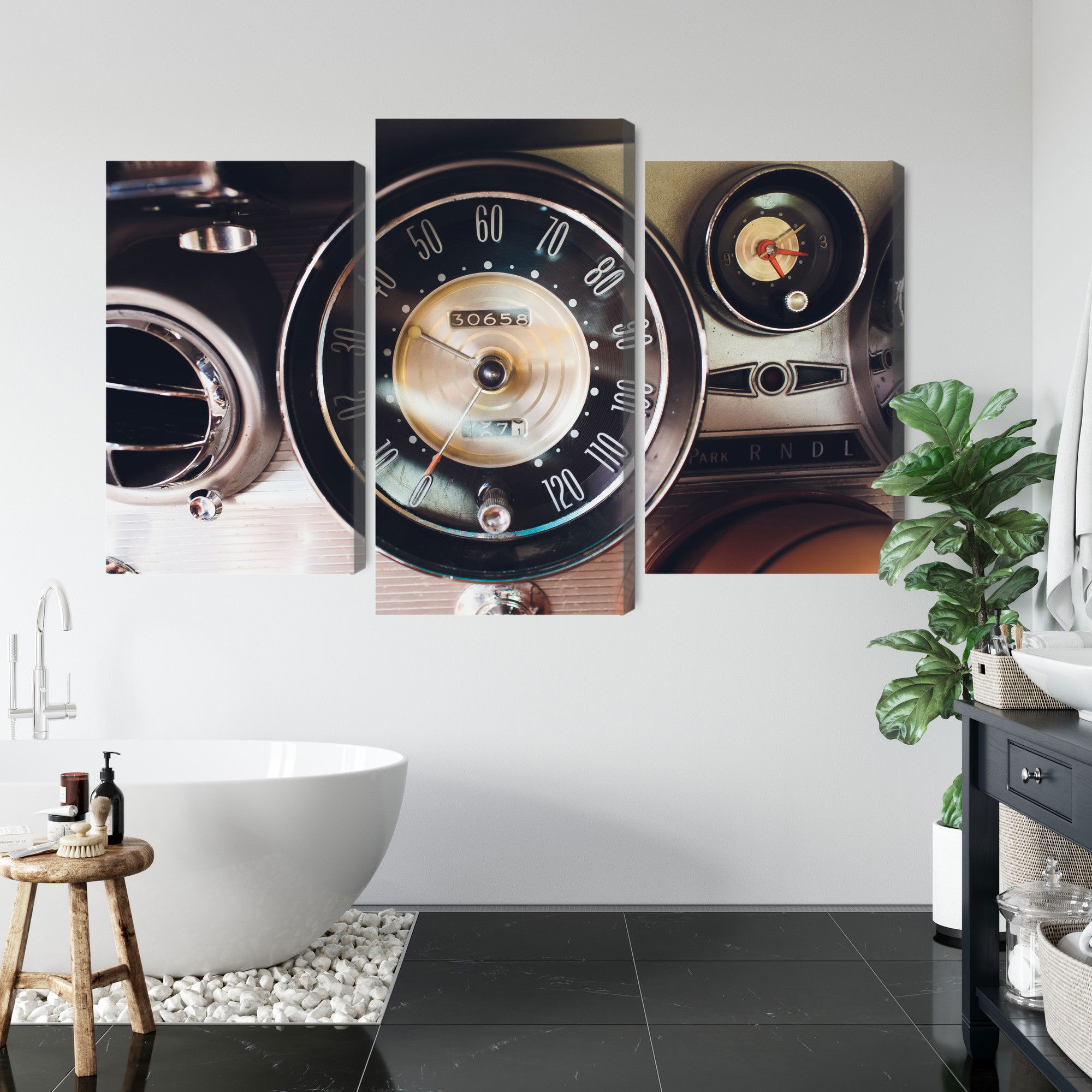 Varje tavla monteras på en massiv fururam. Format upp till 70×50 cm har en ram på 15 mm, medan format från 90×60 cm och uppåt har en ram på 20 mm. Den exakta dukspänningen gör att tavlan håller sin form över tid. Motivet The dashboard in an old car trycks runt hela ramen vilket ger ett stilrent galleriuttryck där tavlan är lika vacker från sidan som framifrån. Kombinationen av rak dukspänning, rena linjer och korrekt tryck ger en professionell finish.