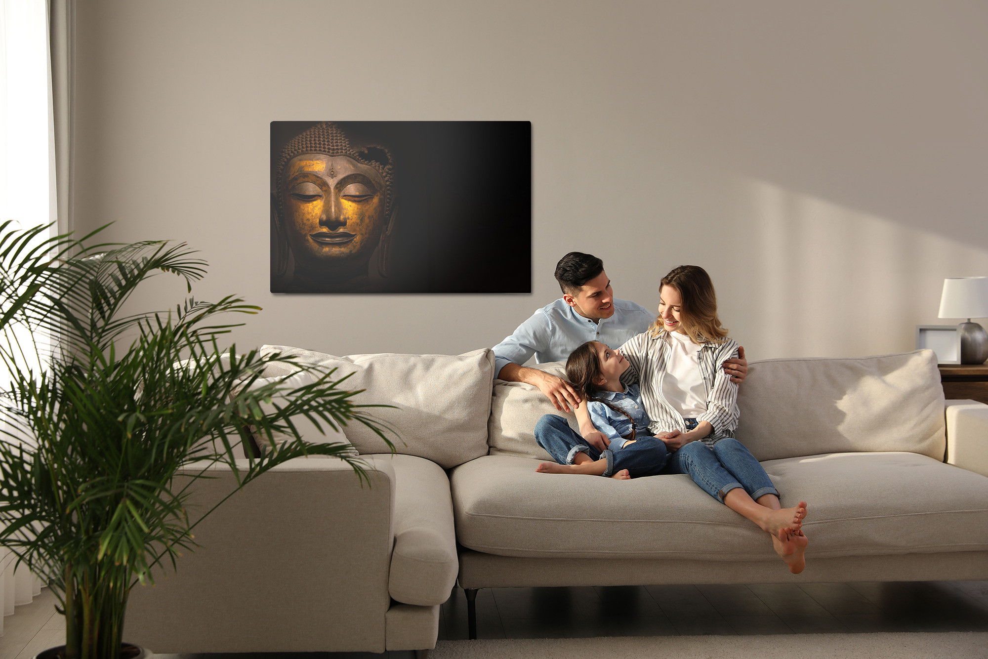 Varje tavla monteras på en massiv fururam. Format upp till 70×50 cm har en ram på 15 mm, medan format från 90×60 cm och uppåt har en ram på 20 mm. Den exakta dukspänningen gör att tavlan håller sin form över tid. Motivet The face of the buddha trycks runt hela ramen vilket ger ett stilrent galleriuttryck där tavlan är lika vacker från sidan som framifrån. Kombinationen av rak dukspänning, rena linjer och korrekt tryck ger en professionell finish.