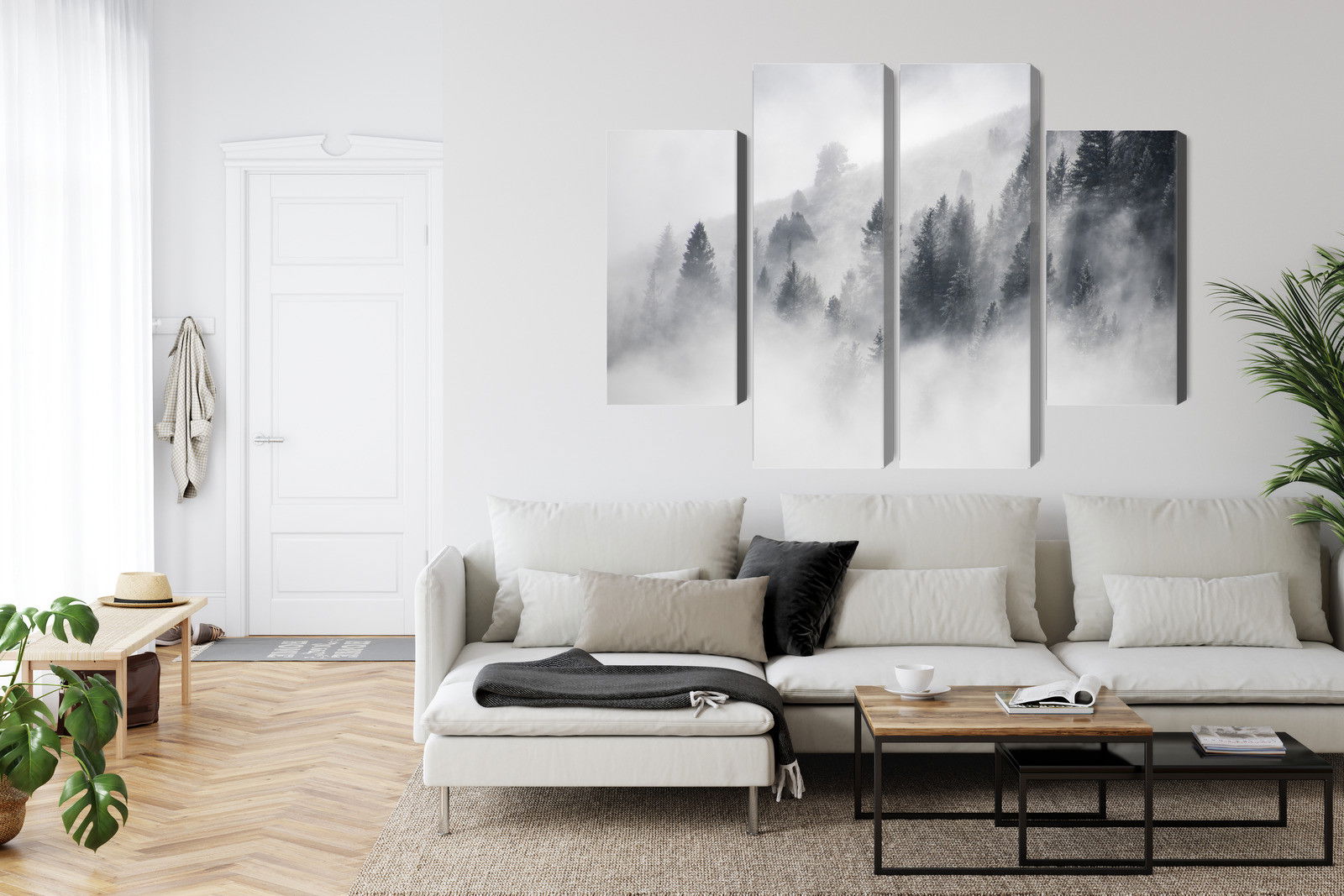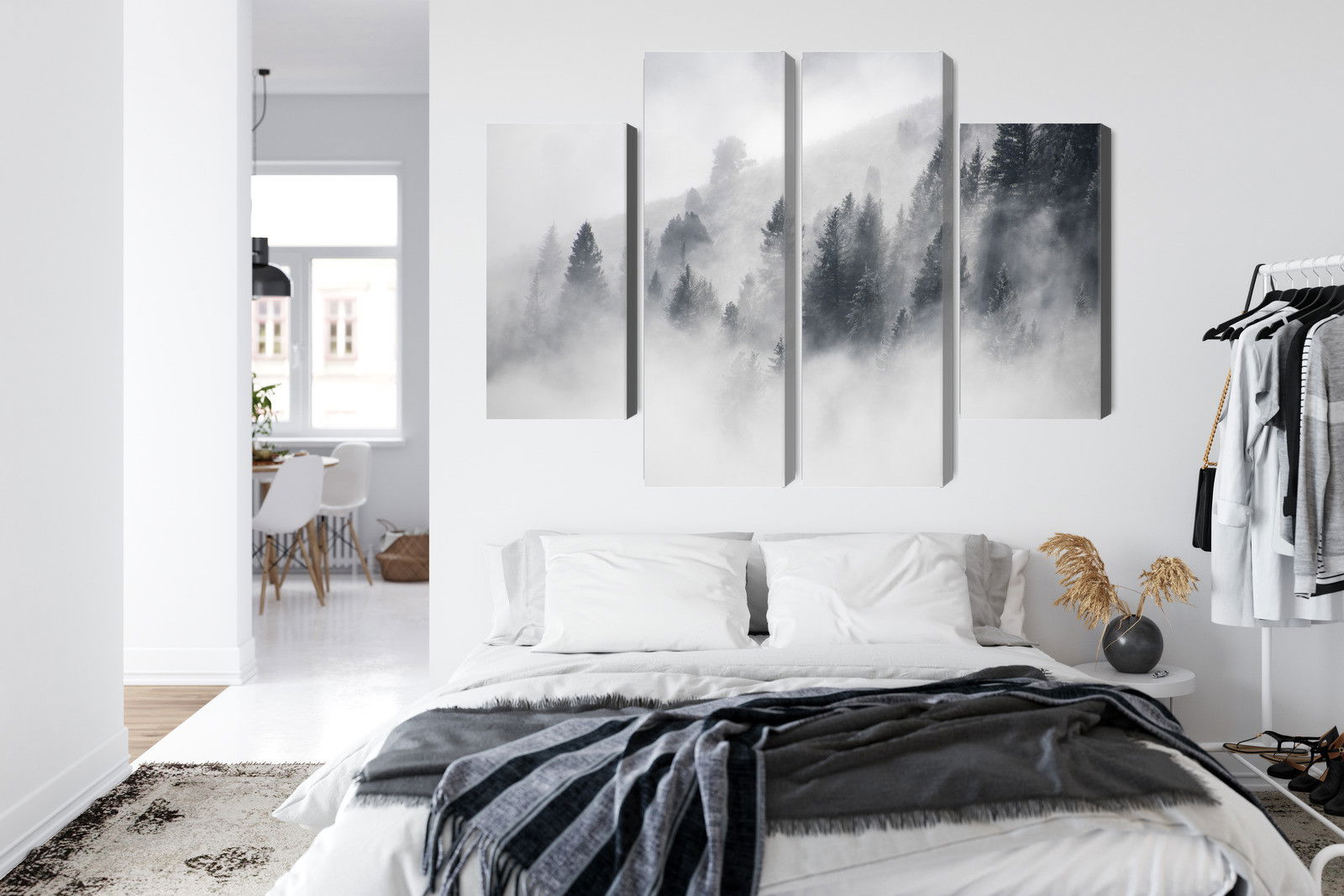 Med SilentDirects ljuddämpande tavla The forest is shrouded in fog får du både ett stilrent motiv och en akustisk lösning i samma produkt. Tavlan byggs i Sverige och utgår från en canvastavla med fururam som fylls med en återvunnen polyestercell för effektiv ljudabsorption.