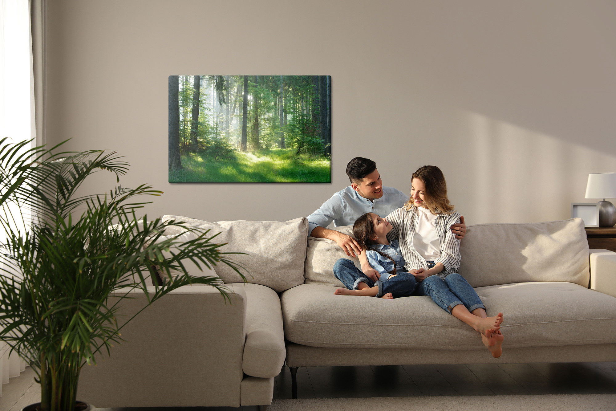 Motivet The sun peeks into the forest återges med hög färgprecision och detaljrikedom tack vare HP Latex-teknologi. Trycket sker med vattenbaserade, luktfria och GREENGUARD Gold-certifierade bläck som ger en upplösning på upp till 300 DPI. Färgerna är UV-beständiga och behåller sin styrka även i ljusa rum, vilket gör tavlan lämplig för både hem- och offentliga miljöer.