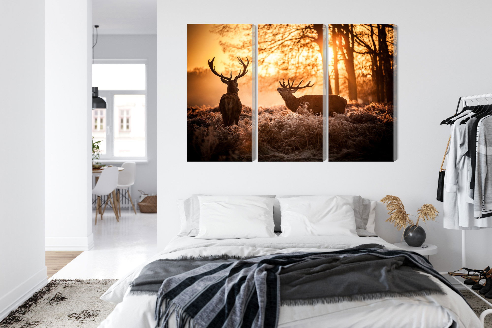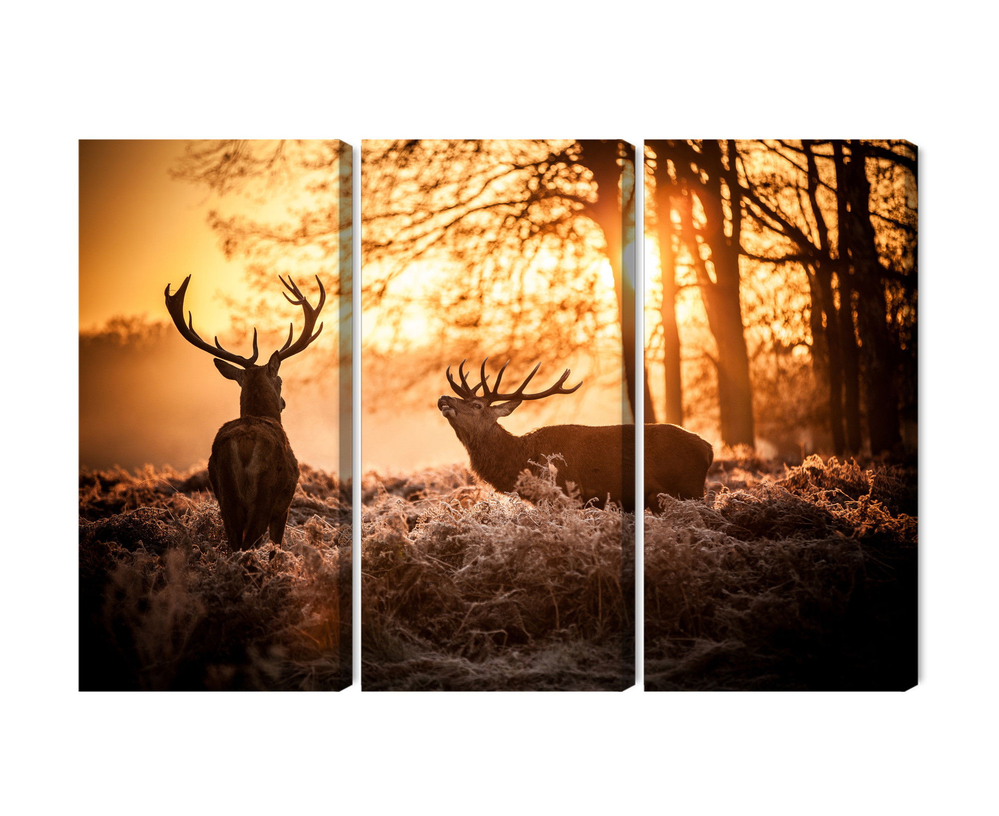 Varje tavla monteras på en massiv fururam. Format upp till 70×50 cm har en ram på 15 mm, medan format från 90×60 cm och uppåt har en ram på 20 mm. Den exakta dukspänningen gör att tavlan håller sin form över tid. Motivet Two deer in the forest trycks runt hela ramen vilket ger ett stilrent galleriuttryck där tavlan är lika vacker från sidan som framifrån. Kombinationen av rak dukspänning, rena linjer och korrekt tryck ger en professionell finish.