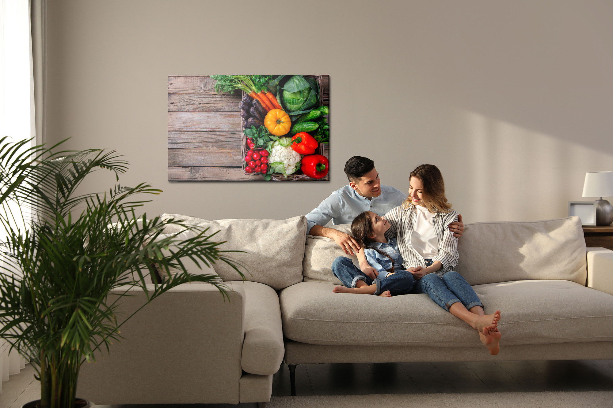 Motivet Vegetable basket on the table återges med hög färgprecision och detaljrikedom tack vare HP Latex-teknologi. Trycket sker med vattenbaserade, luktfria och GREENGUARD Gold-certifierade bläck som ger en upplösning på upp till 300 DPI. Färgerna är UV-beständiga och behåller sin styrka även i ljusa rum, vilket gör tavlan lämplig för både hem- och offentliga miljöer.